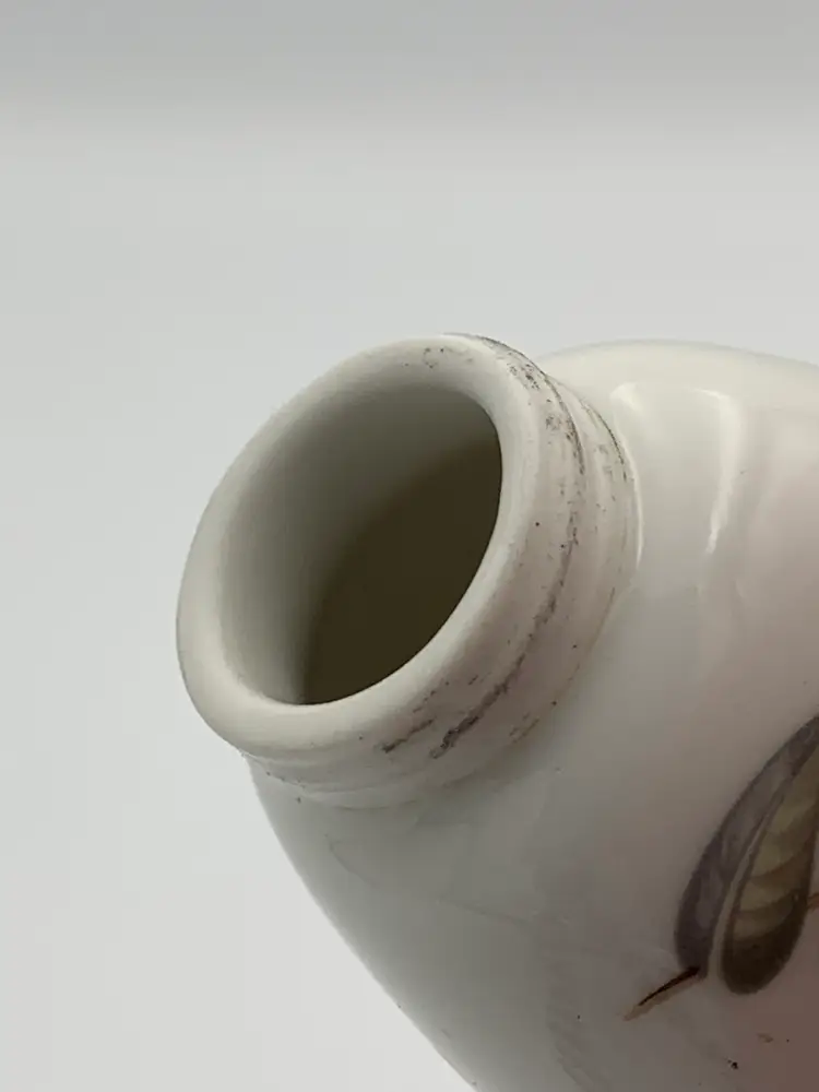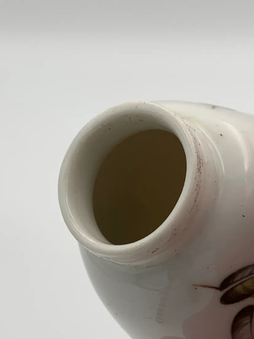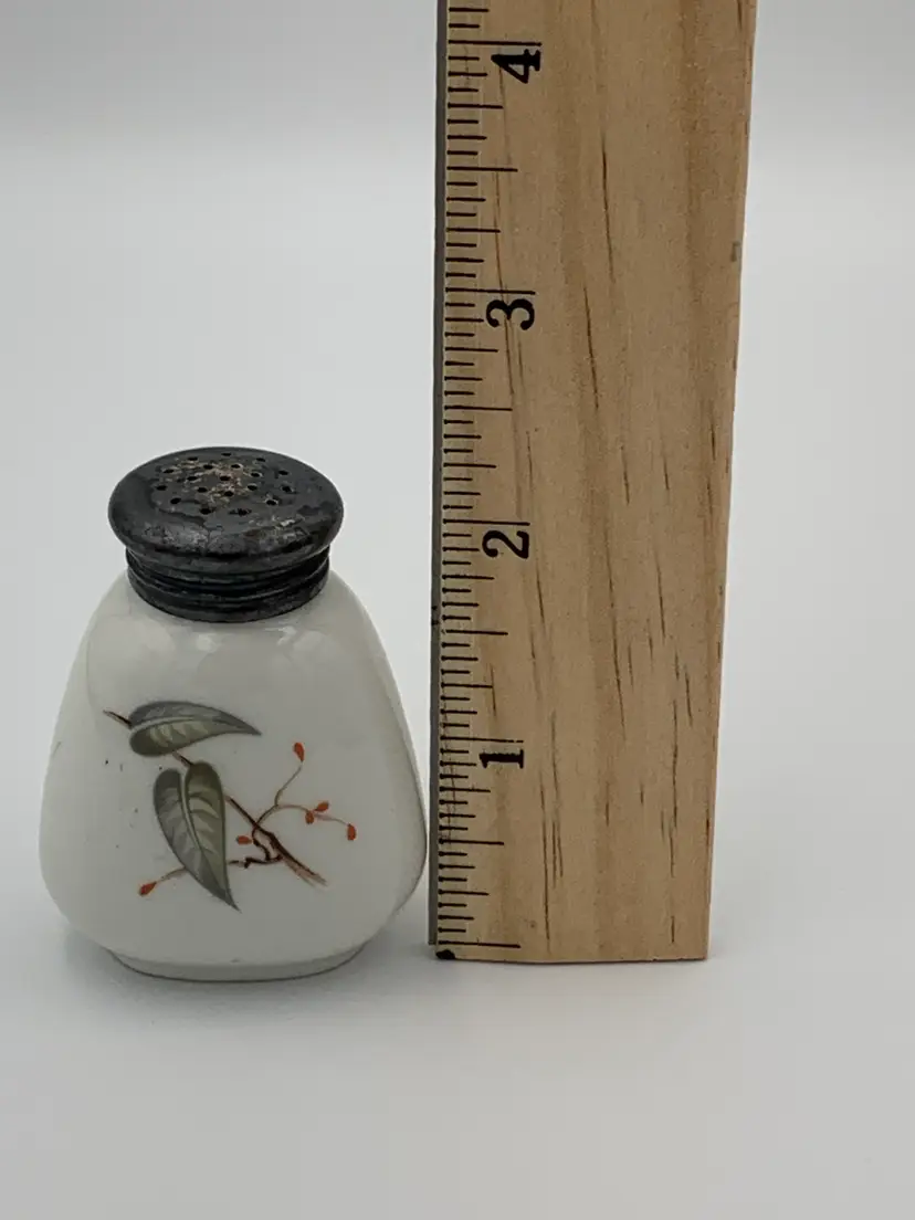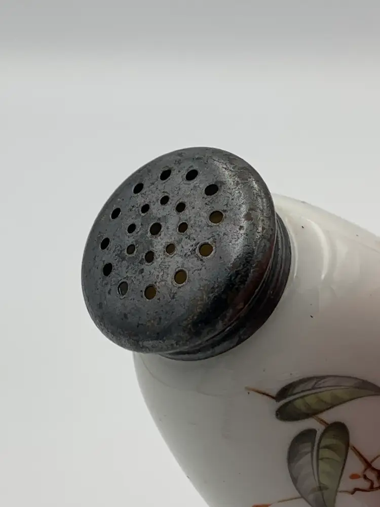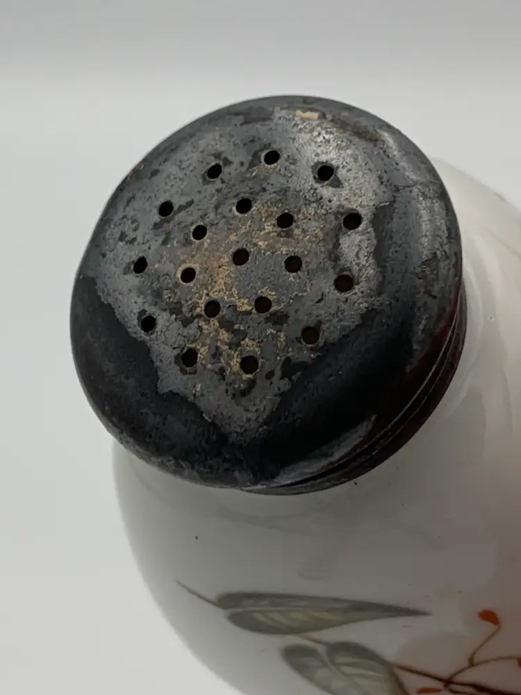 White glass shakers with leaves/floral design. No chips or cracks on shakers, lids do have signs of wear related to age and use.