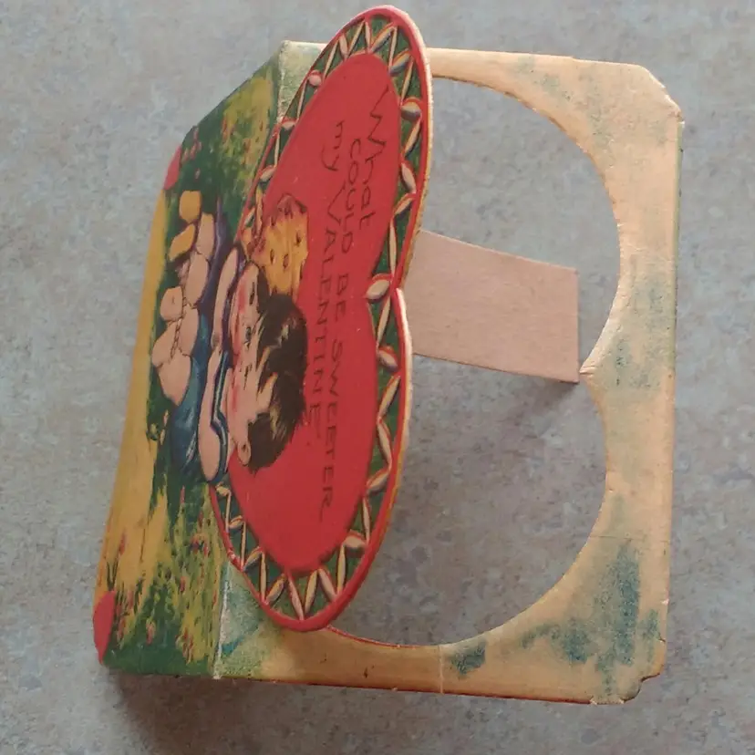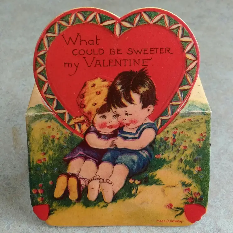Celebrate timeless romance with this charming vintage Valentine card, featuring a heartwarming illustration of two children embraced in a field of flowers. Made in Germany, this delightful piece captures the innocence and sweetness of young love, perfect for collectors of vintage ephemera or as a nostalgic gift. The vibrant colors and intricate details make it a standout addition to any collection.