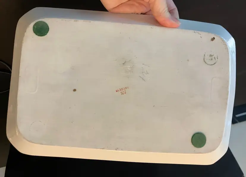 Gold is worn off the rim consistent with age. No chips or cracks. Measurements: 11 1/4" by 7 1/2". Weighs approximately 1 lb before packaging.