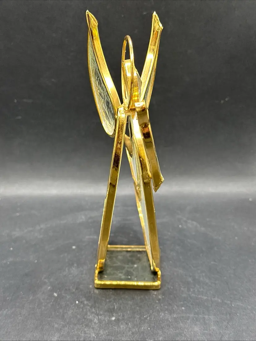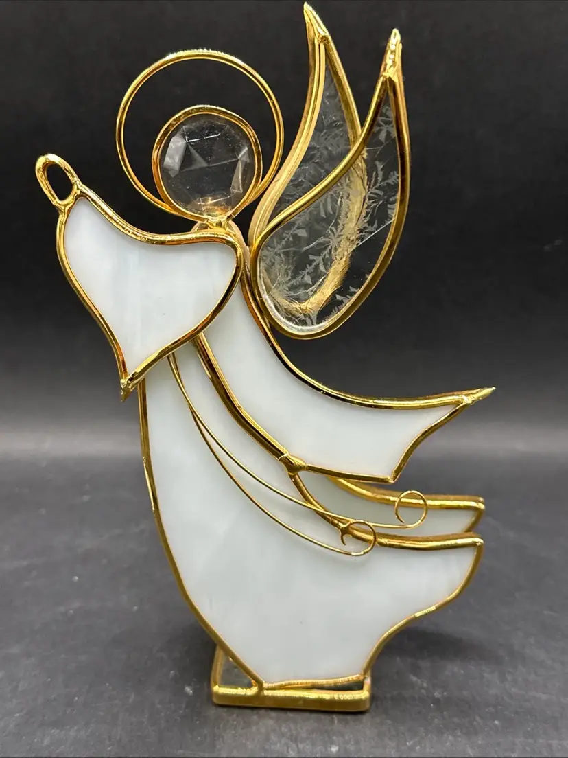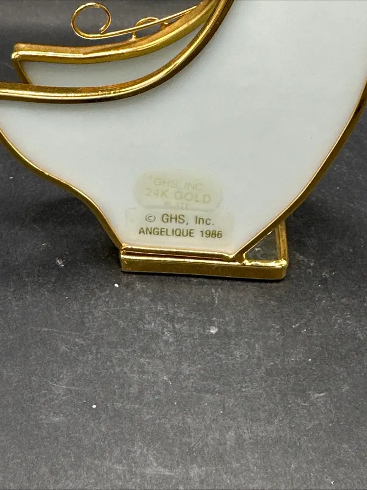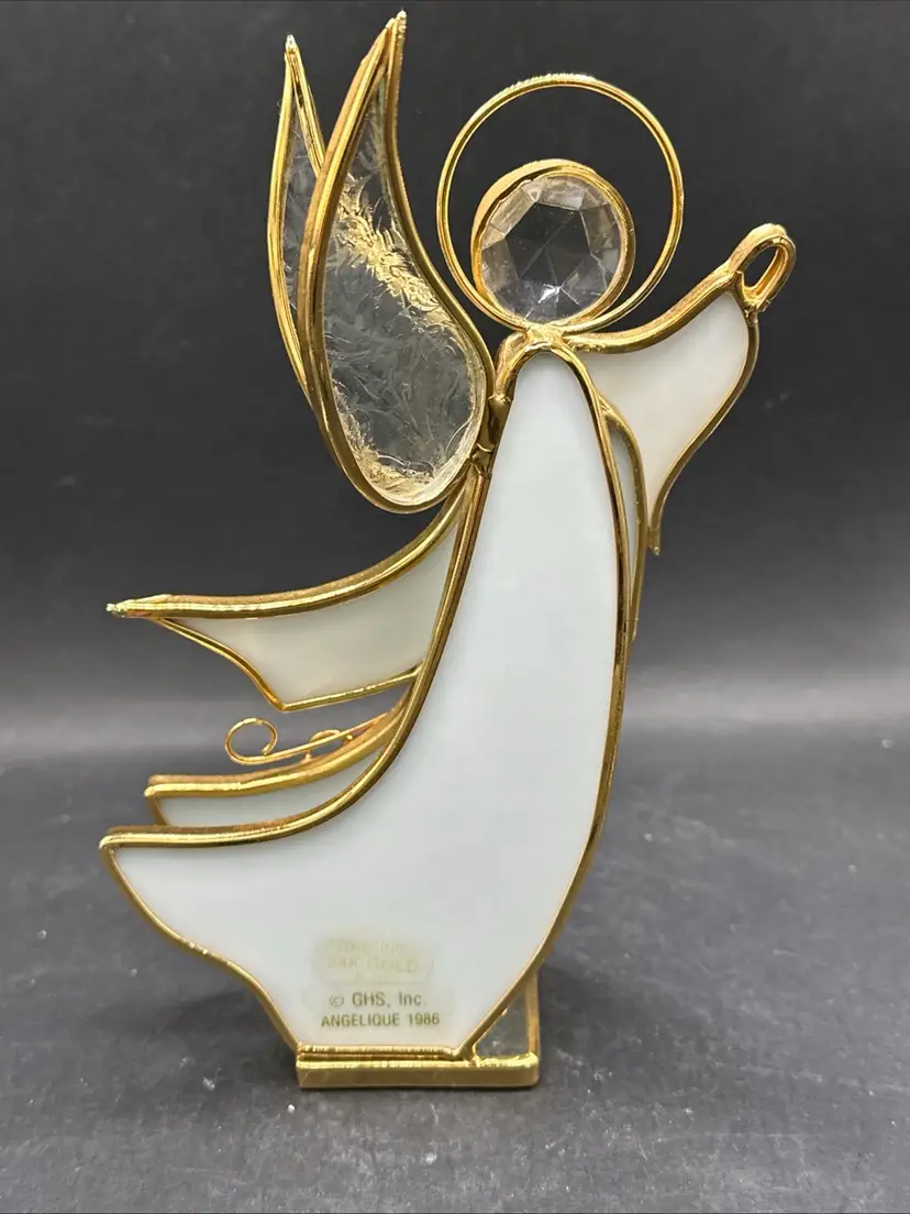 This vintage GHS angel figurine is a stunning addition to any home decor. The white pearl stained glass and 24K gold plated finish give it a unique and elegant look. Measuring 6.5 inches in height, it is perfect for display on a shelf or table.