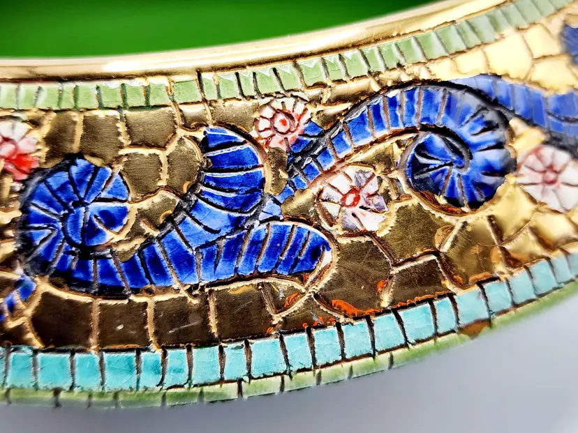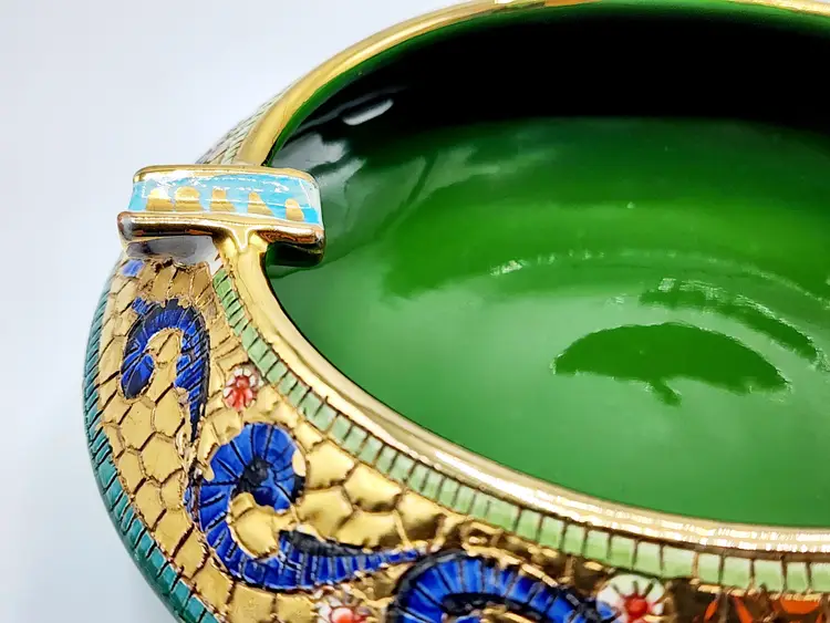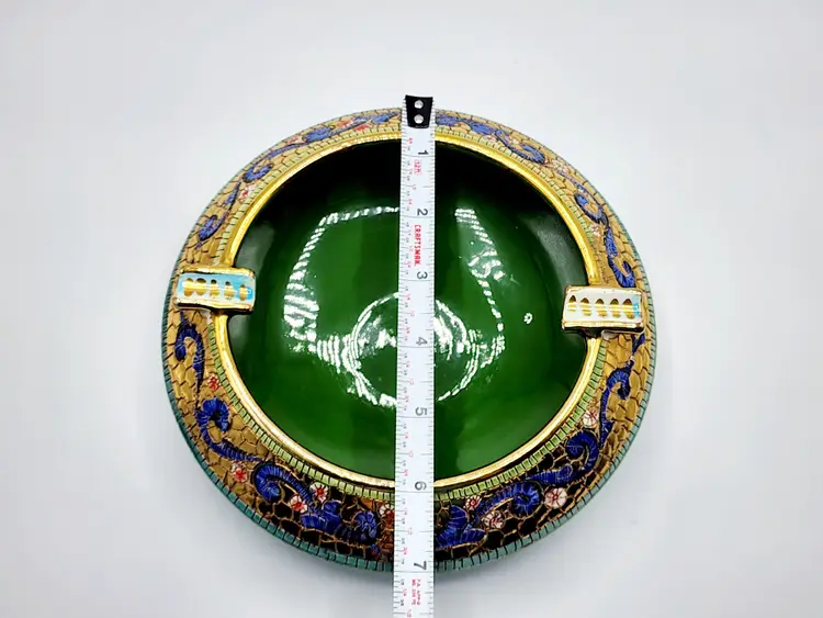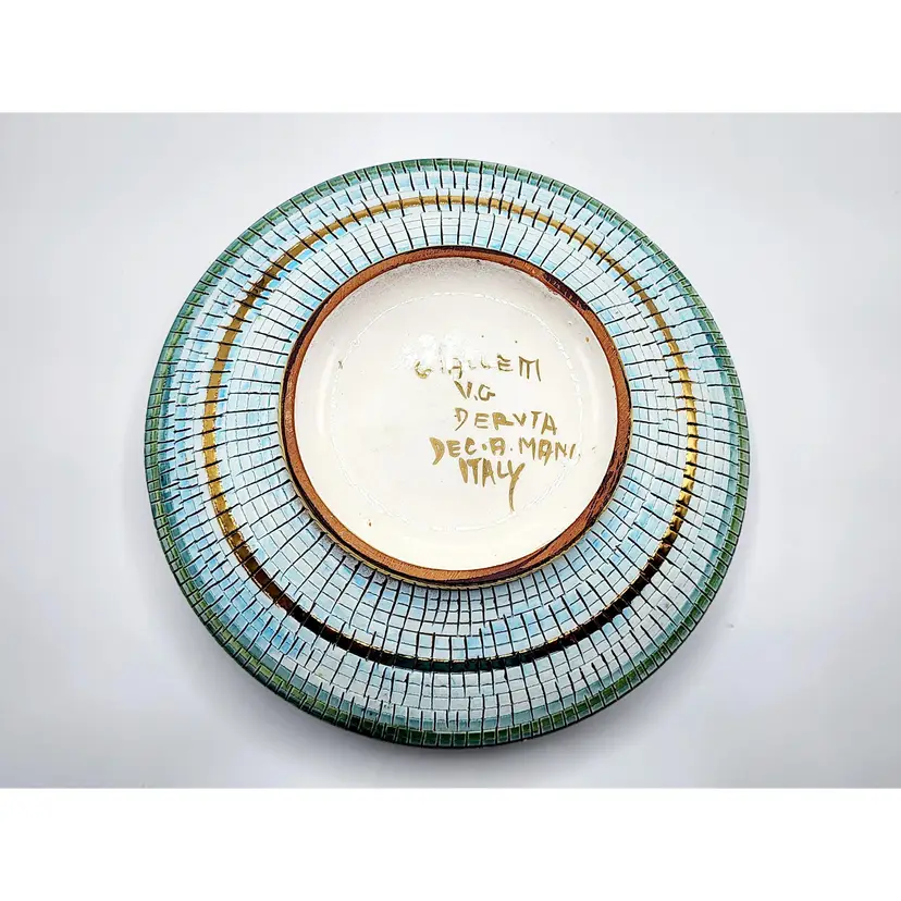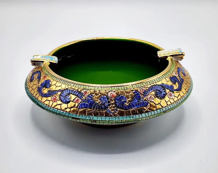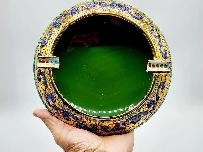 Vintage Rare Unique Handmade Piece by Gialletti Giulio - Deruta Pottery Italy - Byzantine Mosaic Ceramic Ashtray or Candy Dish, signed on the bottom. In art deco style, amazing bright vibrant colors, 24 K gilt, simulated mosaic tiles, glazed pottery, high quality. It's hard to describe in words how amazing and unique this piece is.