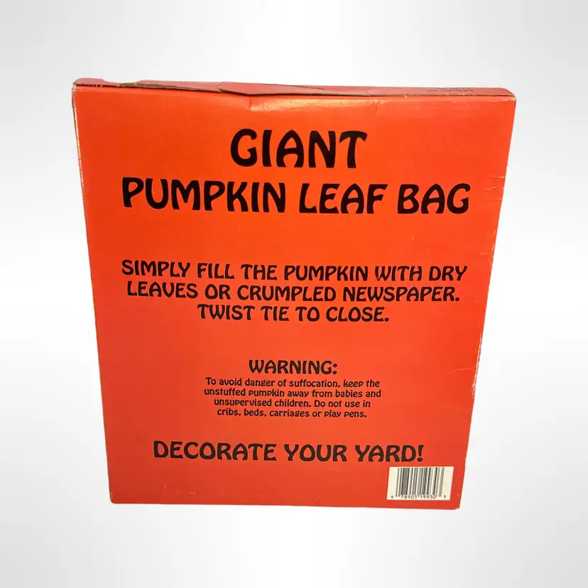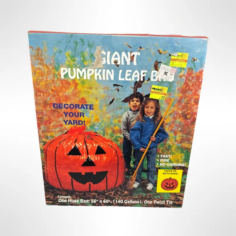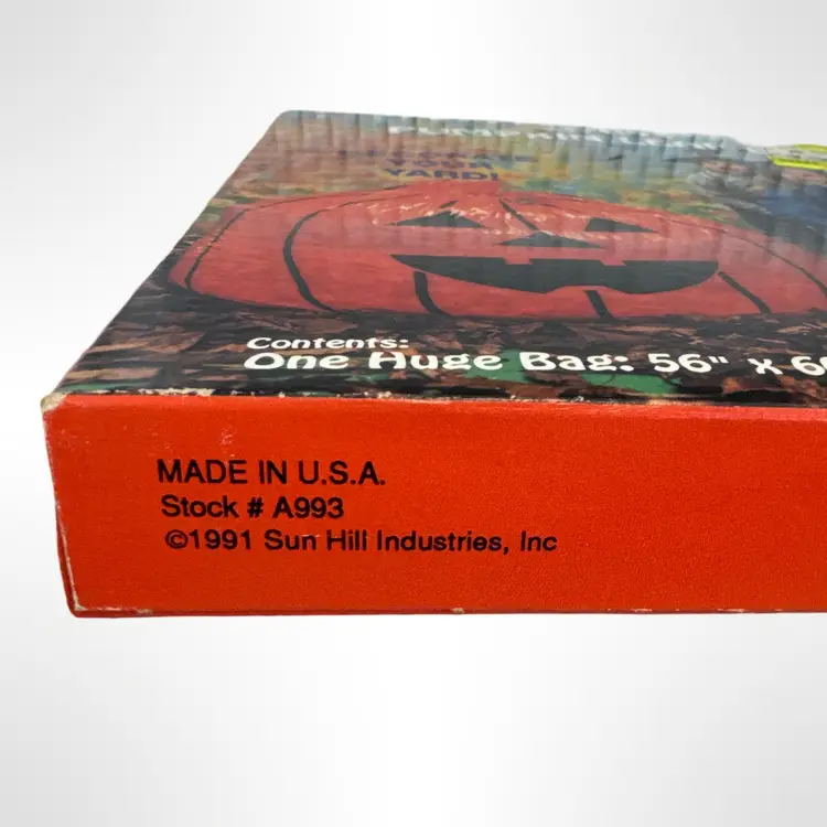 Get into the Halloween spirit with this vintage NOS Giant Pumpkin Leaf Bag! Perfect for decorating your yard, this 56" x 60" (140 gallons) bag is a fun and easy way to add a festive touch without any carving. Includes one huge bag and one twist tie. Great for creating a spooky atmosphere for trick-or-treaters!