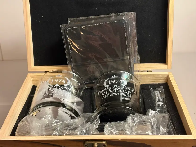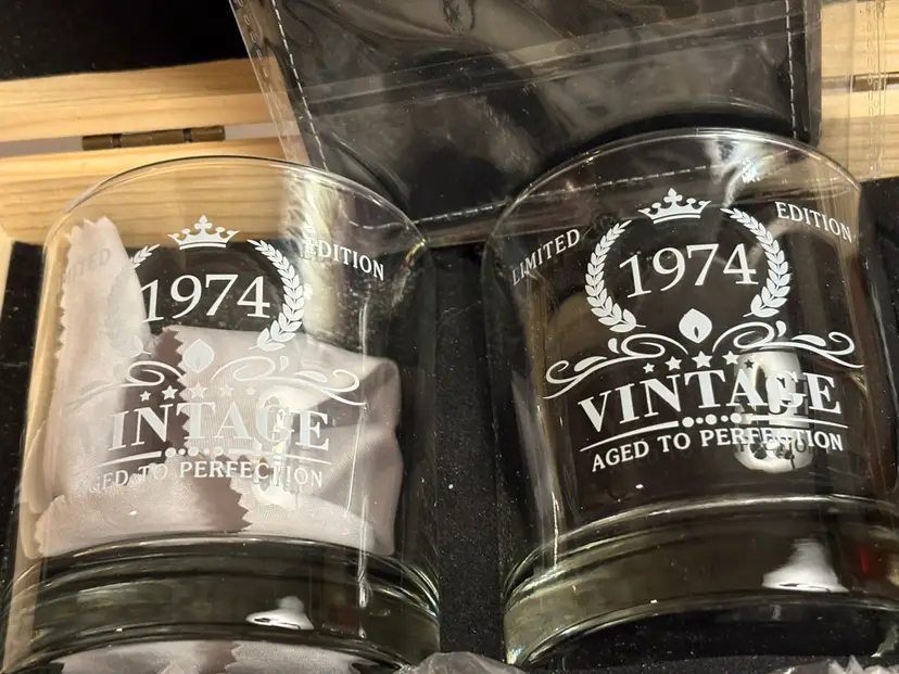 This Vintage Whiskey Glass Set is a unique and special gift for men born or retired in 1974. Made of insulated glass with a round shape and a capacity of 11 ounces, this set includes a cube of whiskey stones for a perfect chilling experience. The set features a letter print pattern, making it a perfect gift for occasions like birthdays, retirement, or Father's Day. The wood base adds a touch of elegance to this reusable glassware, making it a perfect addition to any home bar or kitchen collection.