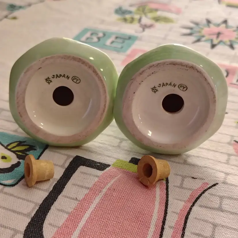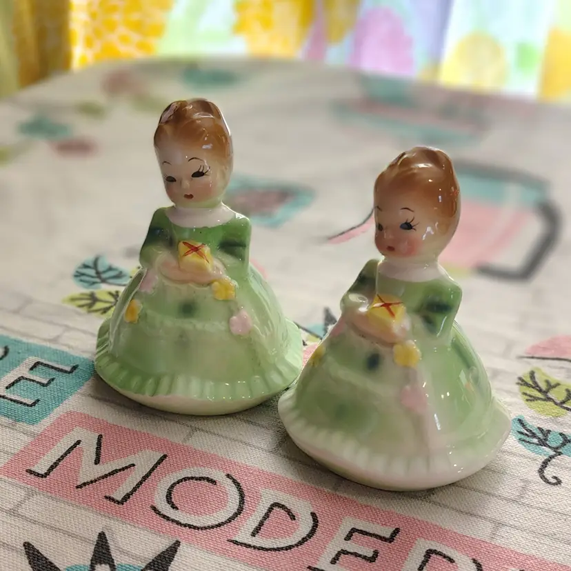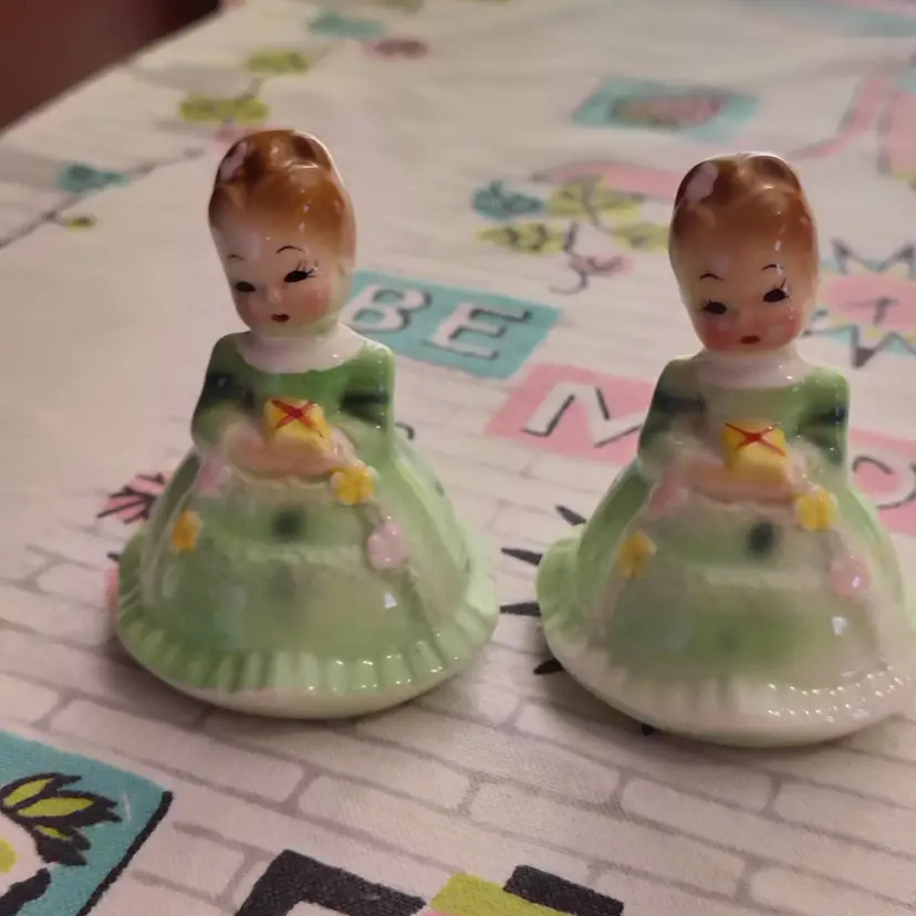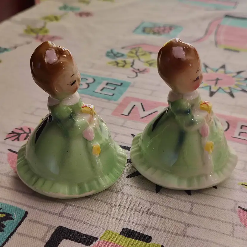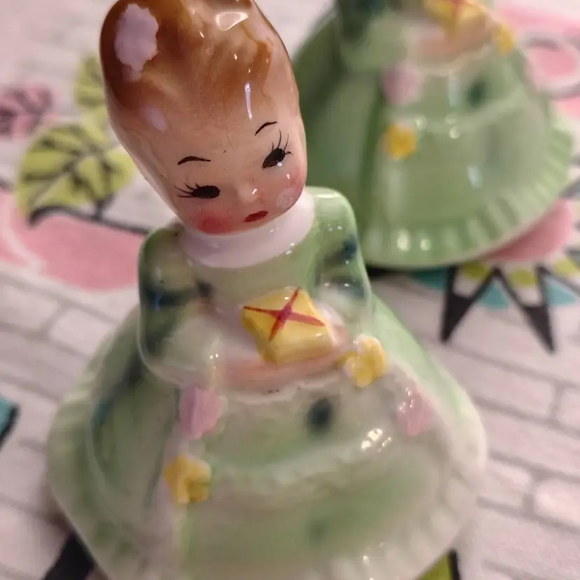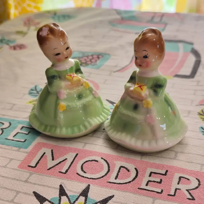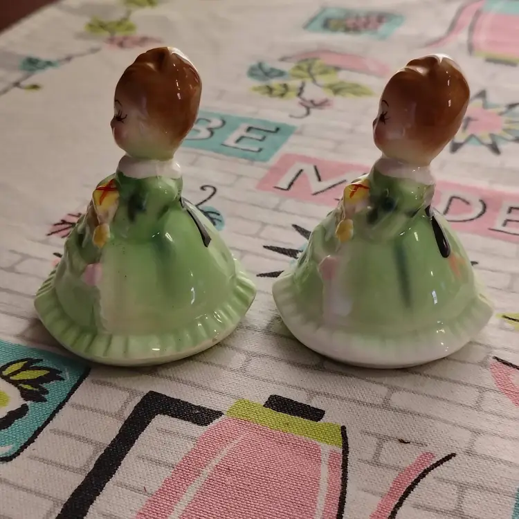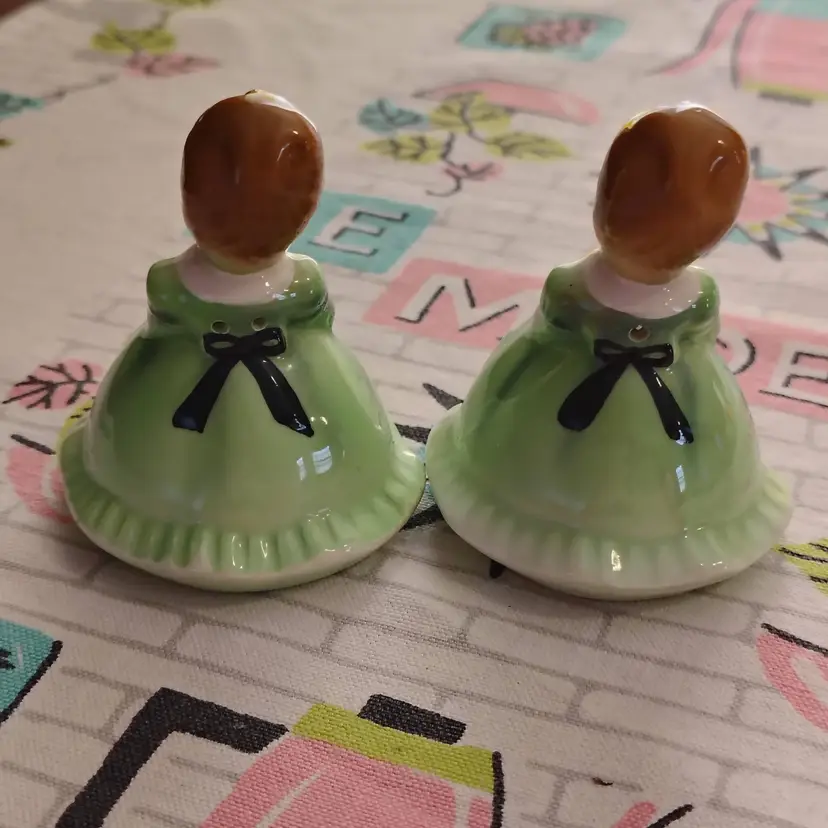 This is a vintage pair of salt and pepper shakers, shaped like gals in green dresses! Made in the 1950s by the Miyawo Company (also famously known as PY & Miyao), these little cuties were obviously inspired by those darling Josef Originals girls. They're got the look! Condition: This pair is in Excellent shape! There are no chips, cracks or any other damage, but there is the start of some crazing, which is expected for their age. They do have their original rubber stoppers but they have hardened and shrunk, and they no longer stay put. Size: Each girl measures 2" across and stands just under 3" tall.
