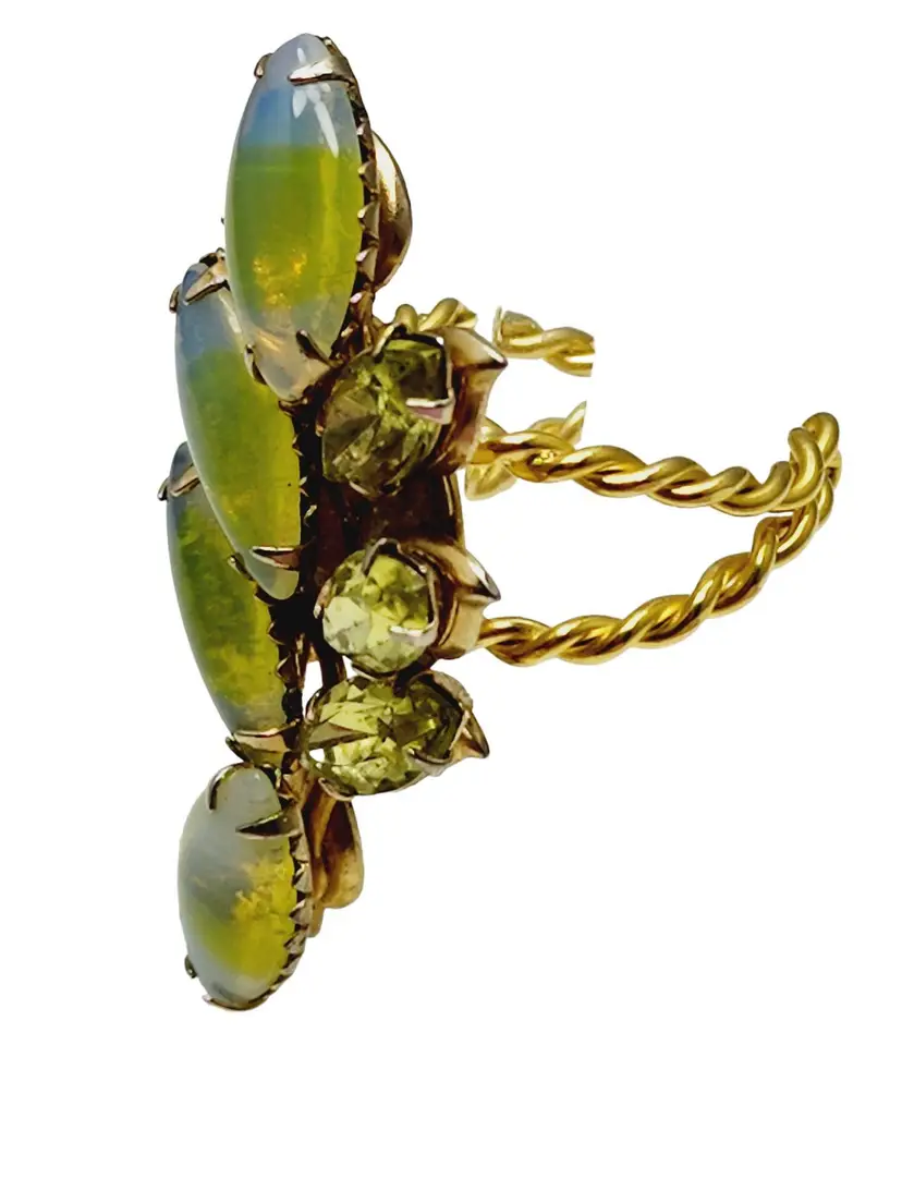 A stunning vintage ring featuring a gold-plated metal band. It showcases four marquise Giure glass stones and three marquise rhinestones. The ring is adjustable for a perfect fit and adds a touch of timeless glamour to any outfit.