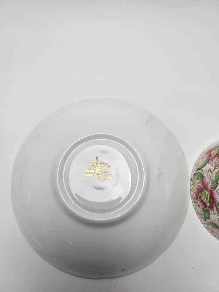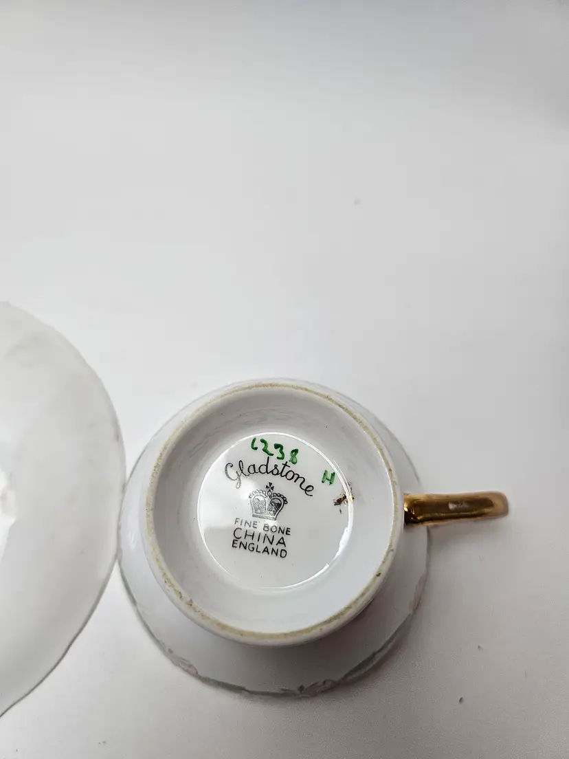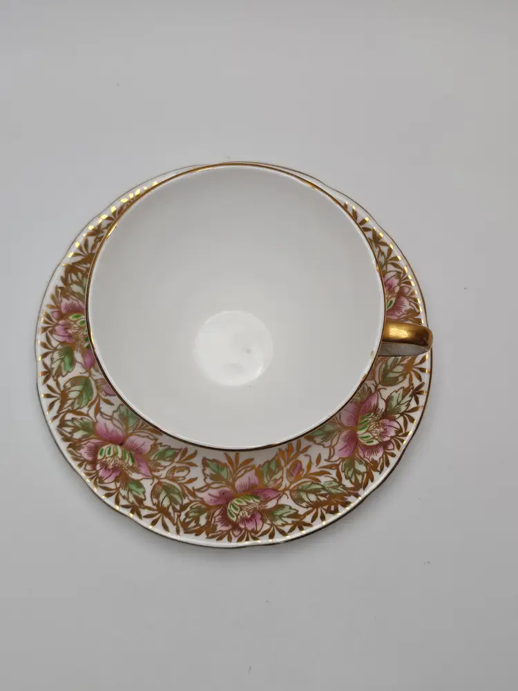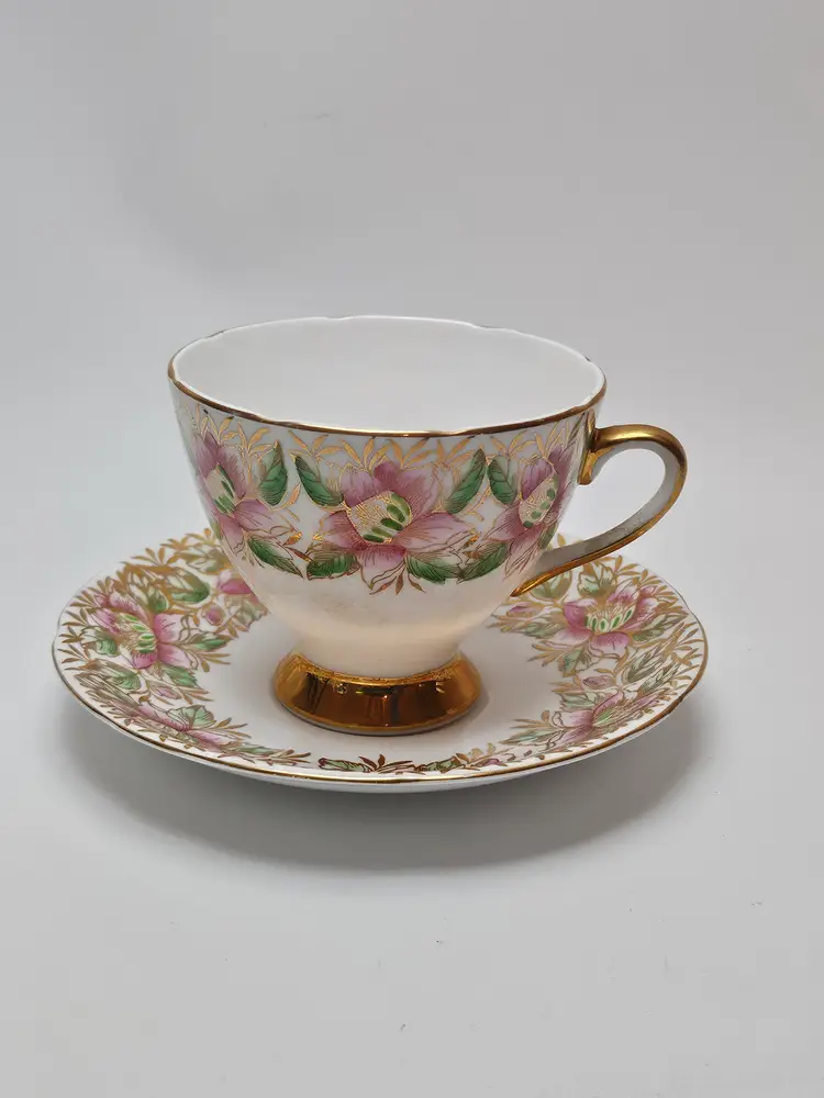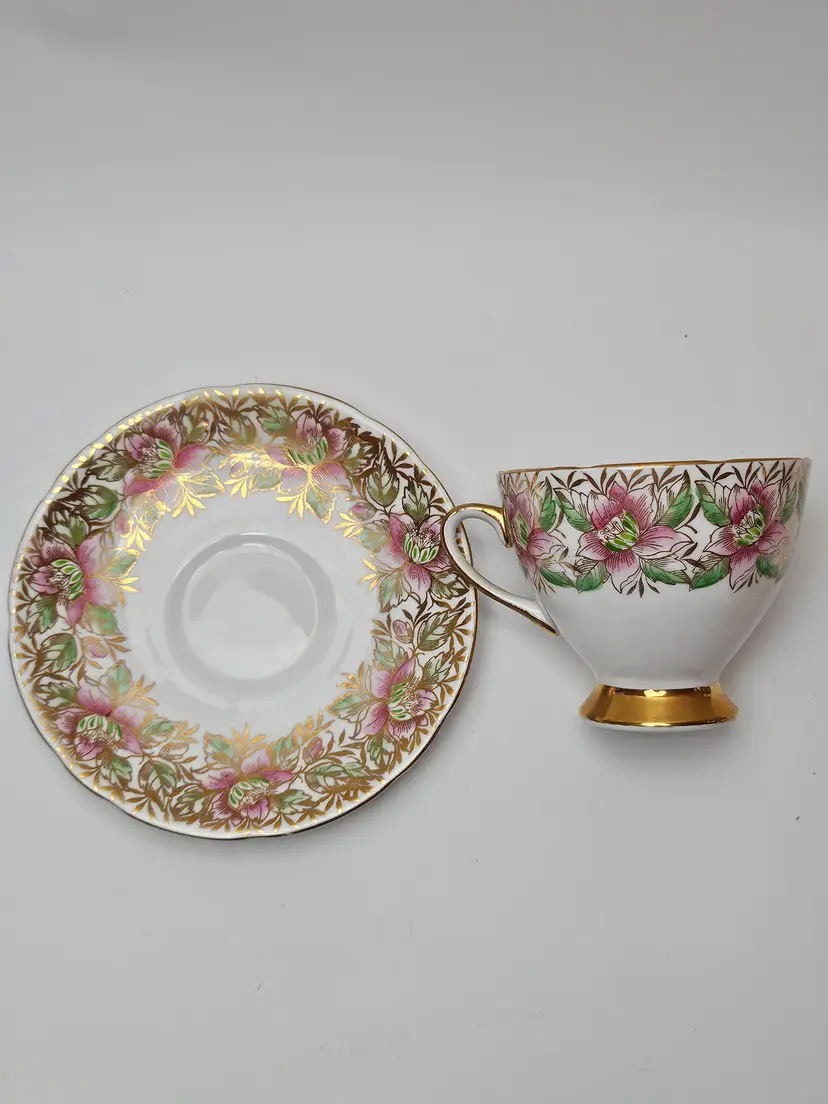 This vintage Gladstone tea cup and saucer set from the 1930s features a delicate bone china design with pink flowers and gold trim, exuding a Victorian style and floral theme. Perfect for special occasions like Easter, Christmas, anniversaries, or Mother's Day, this set is ideal for adding a touch of elegance to your tea-drinking experience. Made in the United Kingdom by the Gladstone brand, this collectible set is a unique and decorative addition to any collection, making it a thoughtful gift for a special someone or a charming piece for your own home.