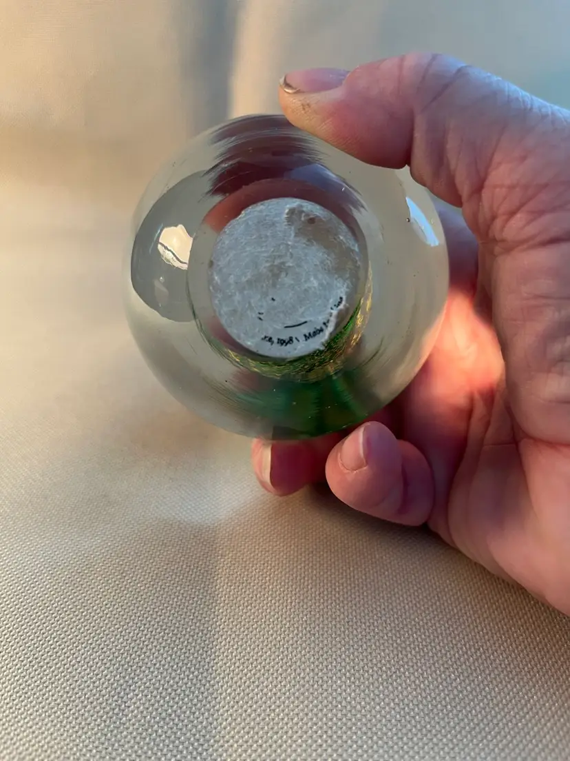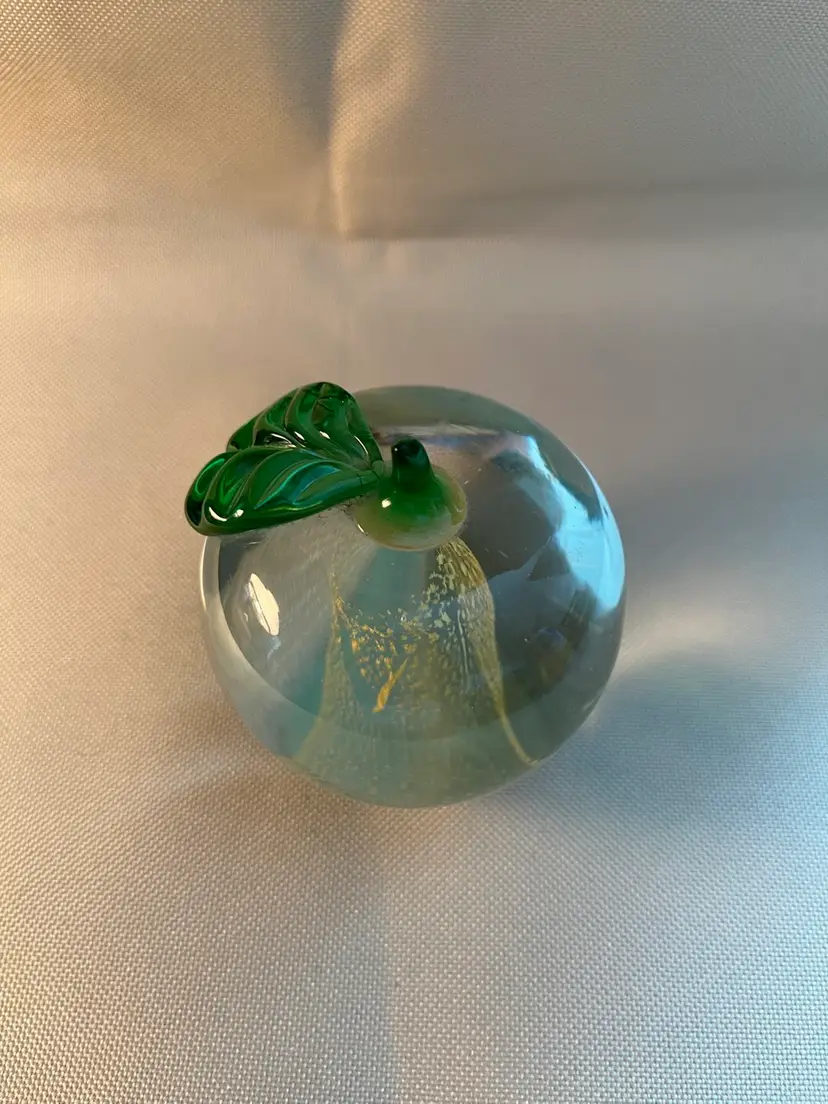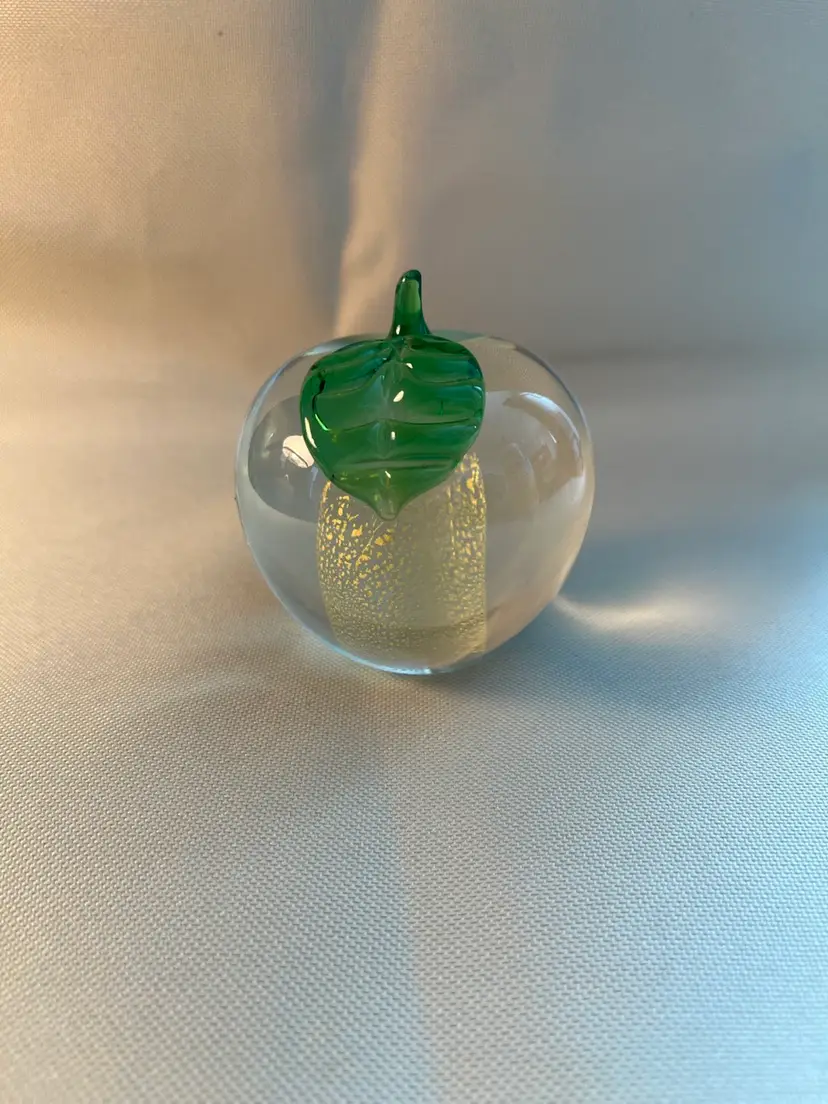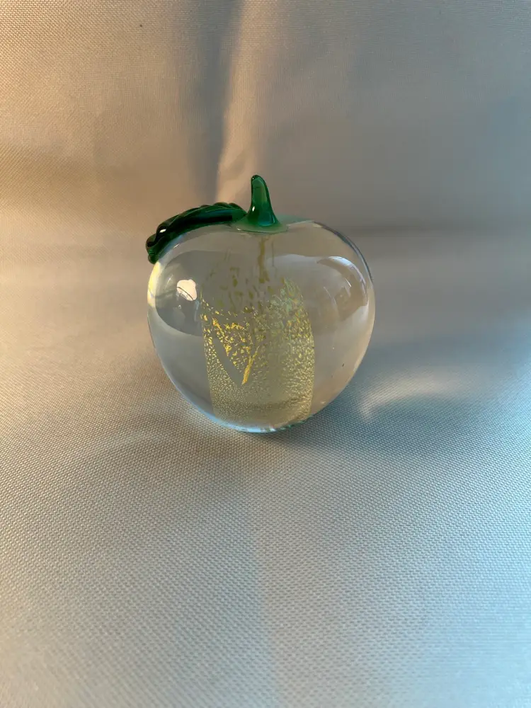 Vintage glass apple with gold glitter/flake inside and green steam and leaf. Much prettier in person in great condition no chips or cracks or bruises.