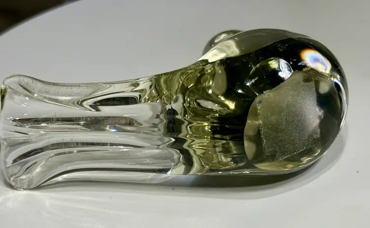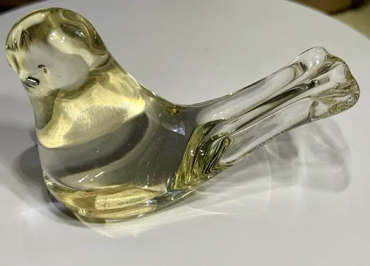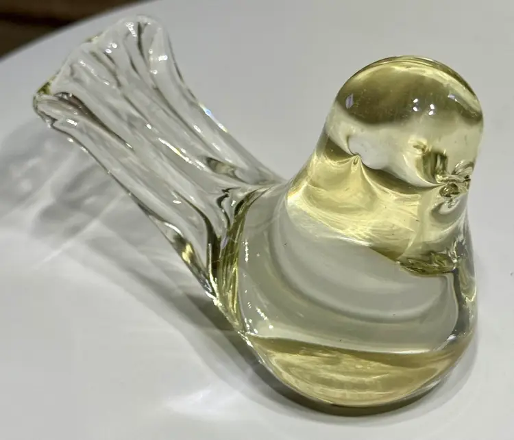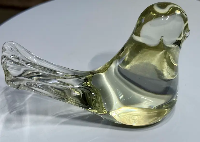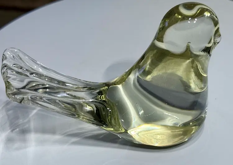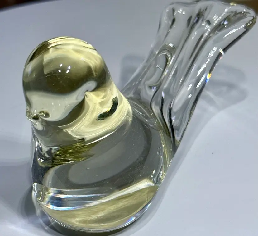 Bring elegance and tranquility to your home décor with this stunning vintage glass bird figurine. Expertly handcrafted, the piece is made from clear glass with a delicate yellow tint that catches and reflects the light beautifully. Its smooth, sculpted form gives it a timeless and graceful appeal, making it perfect as a centerpiece, display accent, or collectible art glass piece.