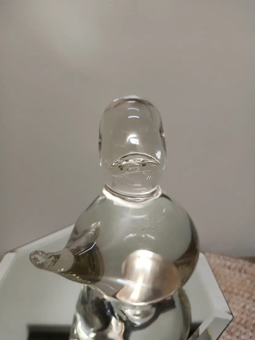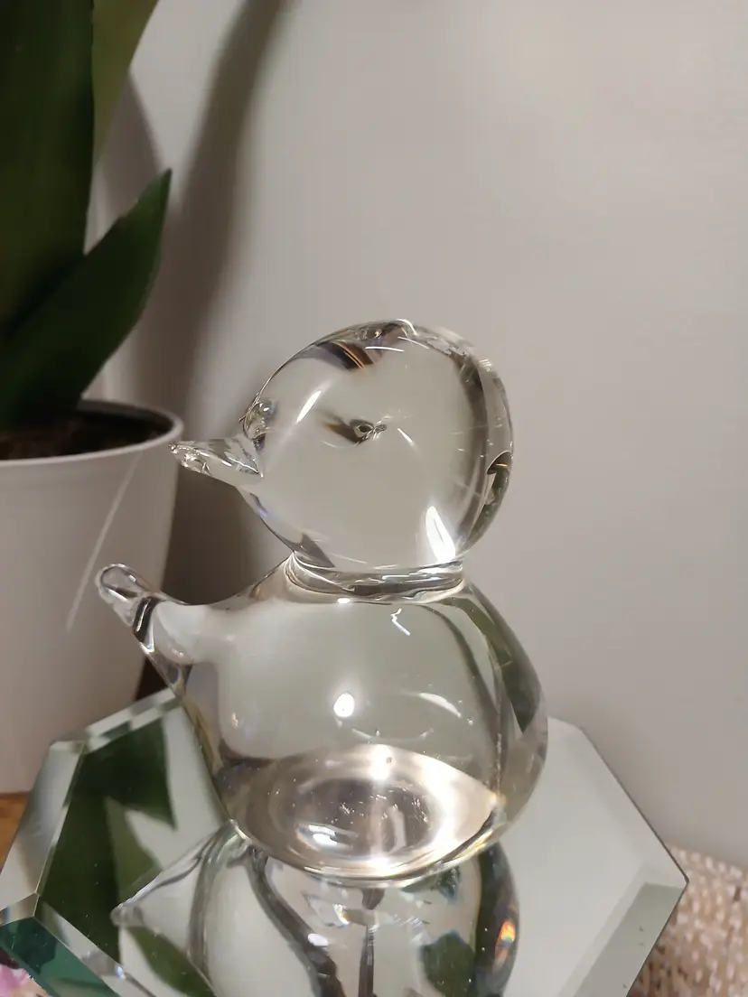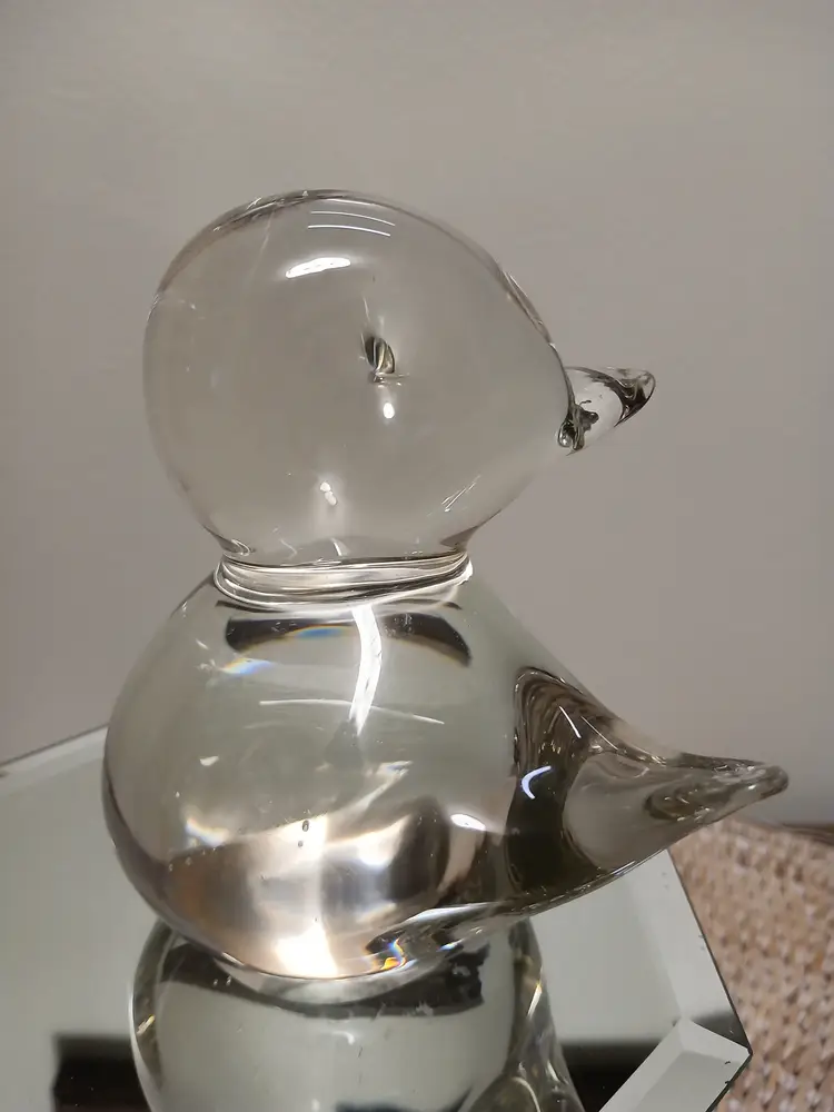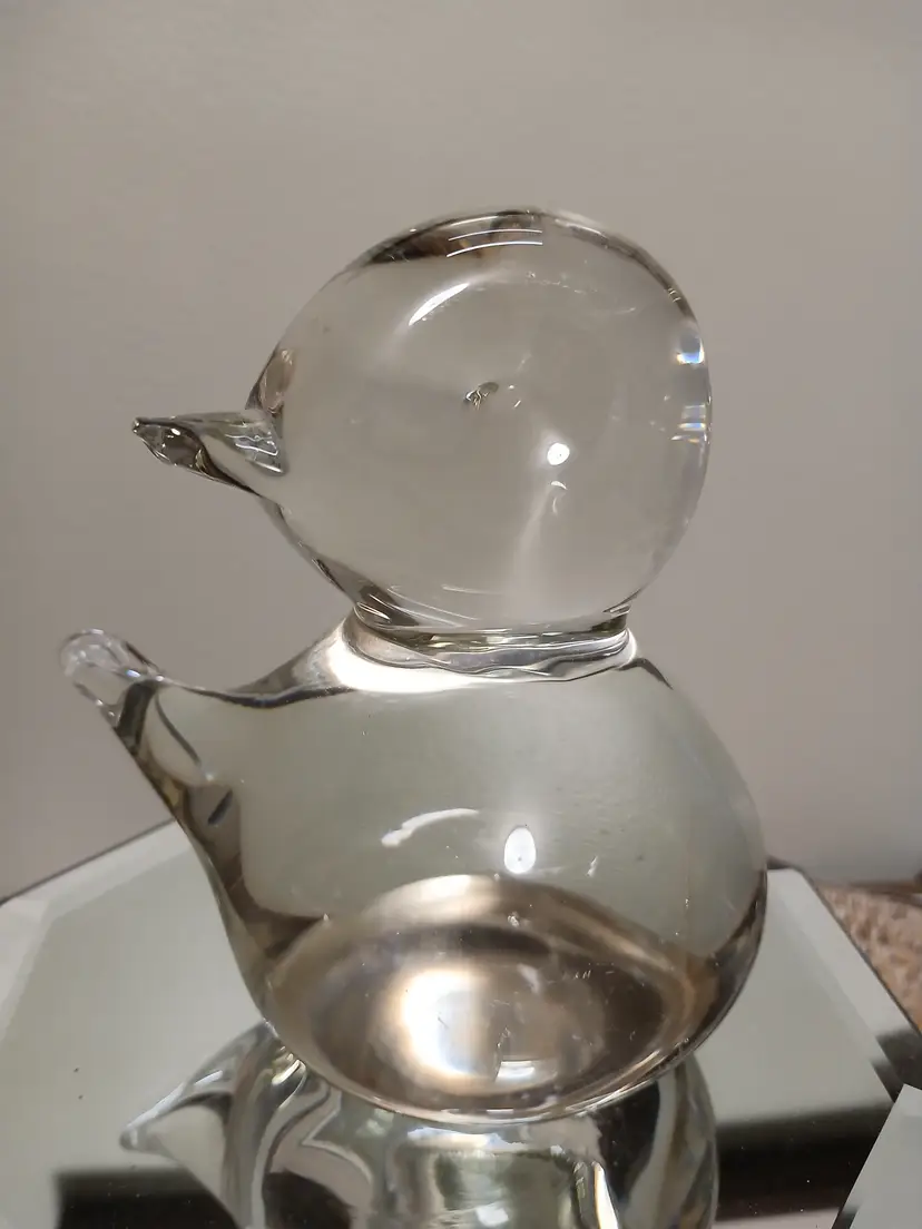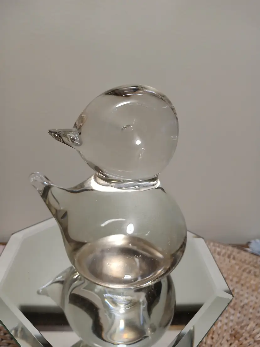 This charming glass bird figurine is a delightful addition to any collection. Its smooth, clear design captures light beautifully, making it a standout piece for your tabletop or shelf. Perfect for bird lovers and collectors alike, this piece adds a touch of whimsy and elegance to your decor. 4 1/2 " x 5"