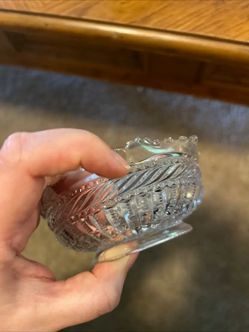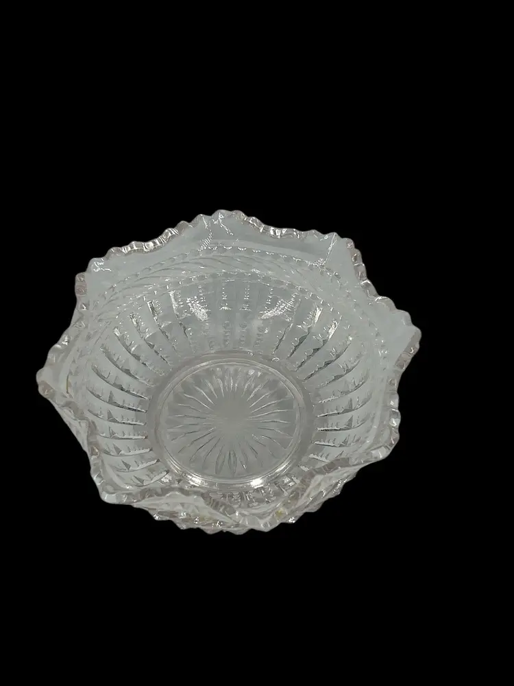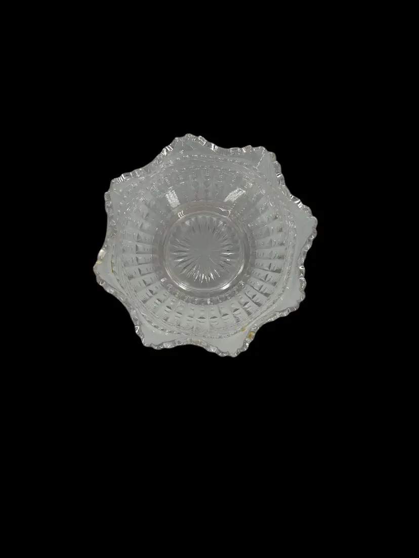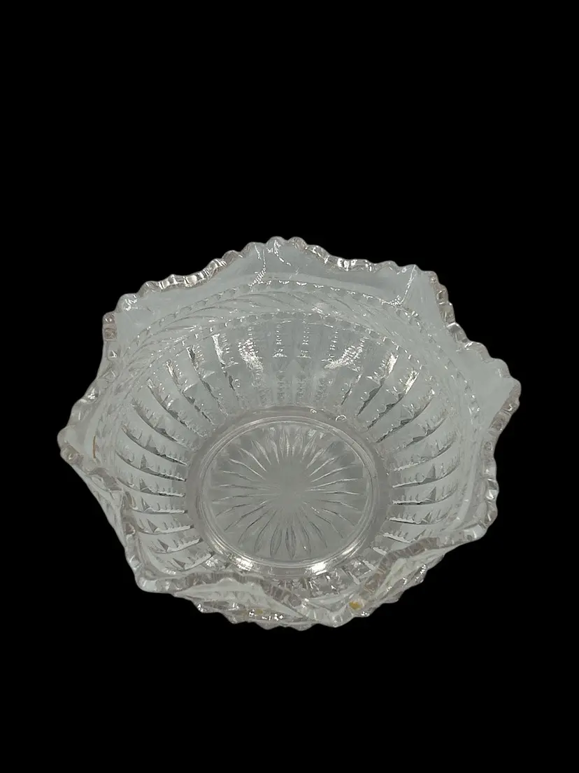 Charming and functional, this vintage clear glass bowl features a beautiful ruffled edge design and is perfect for serving candy, nuts, or as a dainty trinket holder. With a timeless look, it fits right into vintage kitchenware collections or elegant table displays. • Unknown maker, vintage pressed glass • Approx. 2” tall x 4” wide • Ruffled edge adds a delicate touch • Great for entertaining or vanity decor • Pre-owned, Fair Condition- Two chips, one near the rim and one on the side of the bowl. See Pictures.
