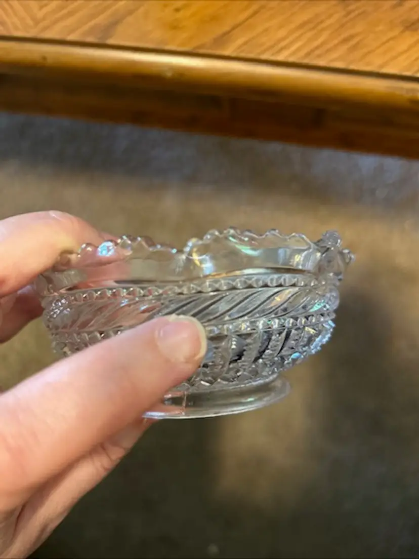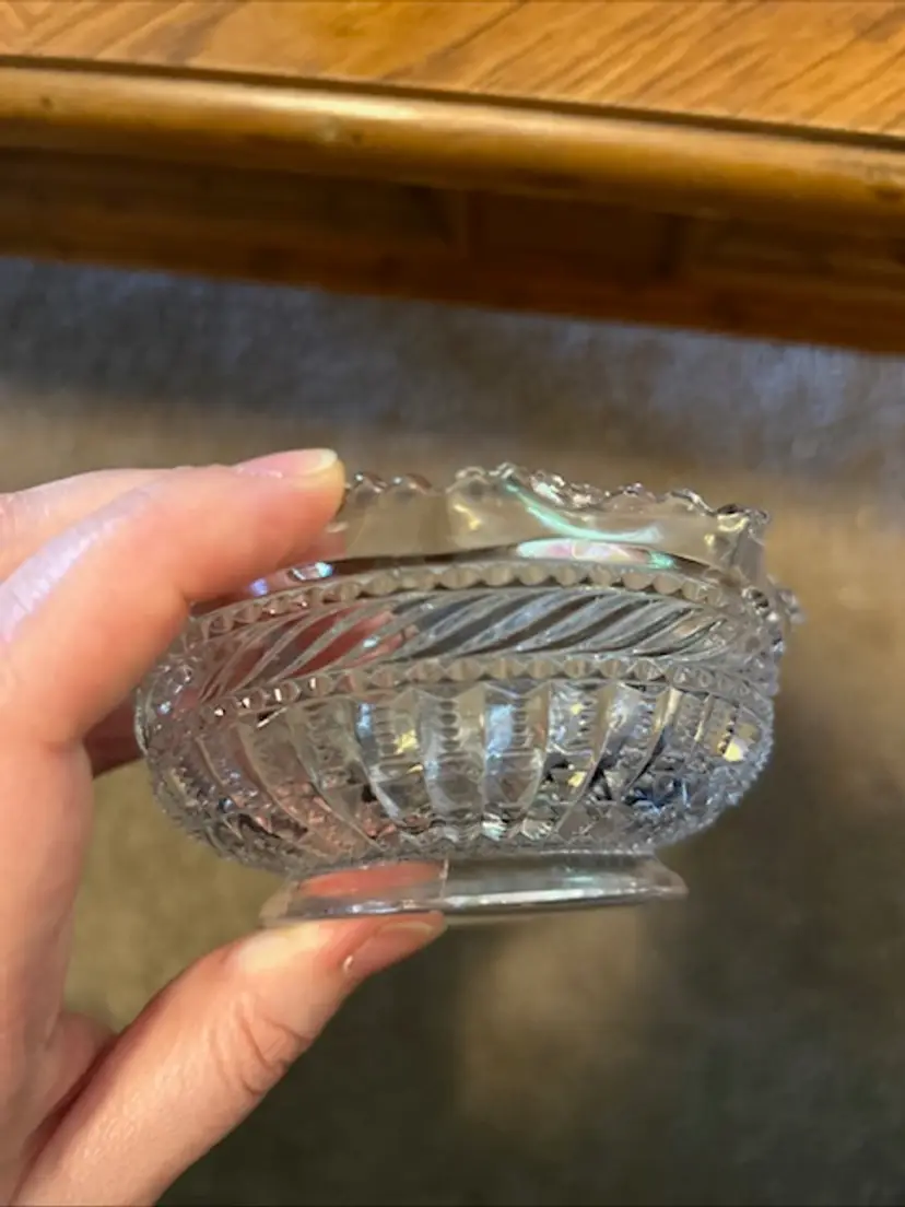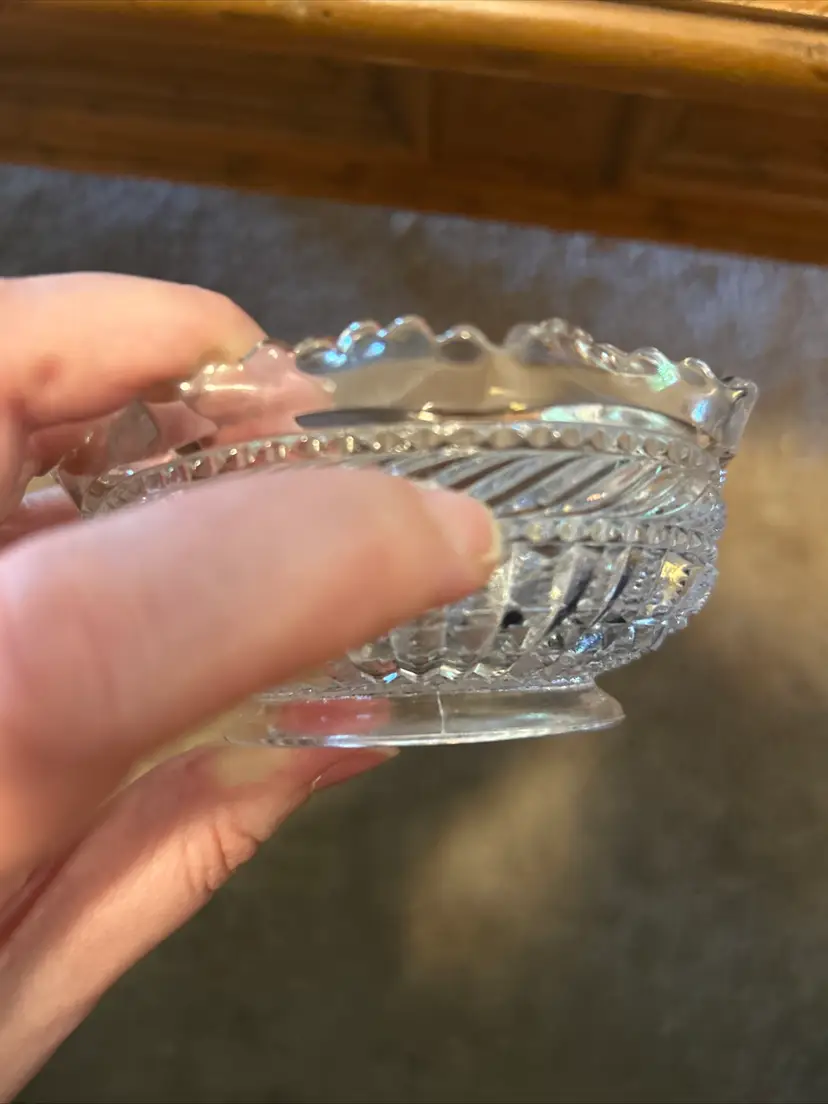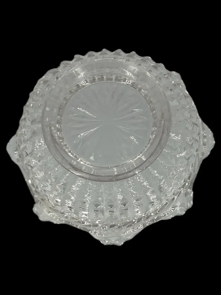 Charming and functional, this vintage clear glass bowl features a beautiful ruffled edge design and is perfect for serving candy, nuts, or as a dainty trinket holder. With a timeless look, it fits right into vintage kitchenware collections or elegant table displays. • Unknown maker, vintage pressed glass • Approx. 2” tall x 4” wide • Ruffled edge adds a delicate touch • Great for entertaining or vanity decor • Pre-owned, Fair Condition- Two chips, one near the rim and one on the side of the bowl. See Pictures.