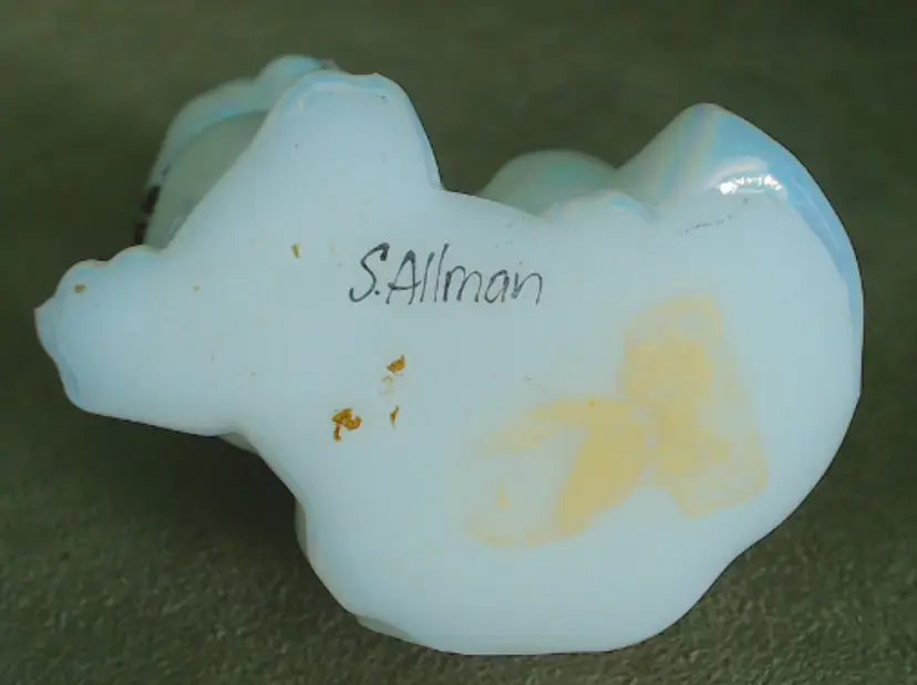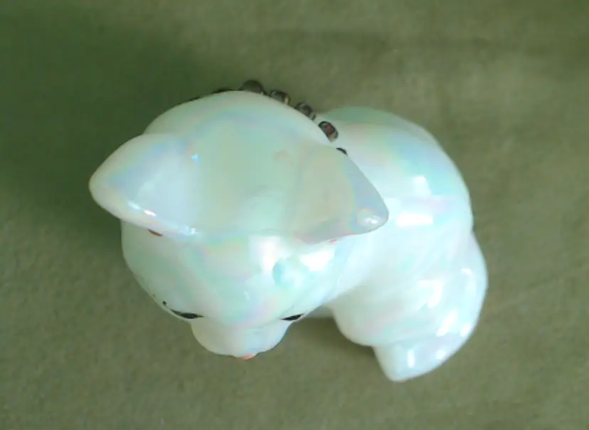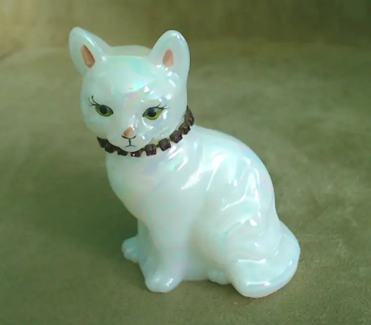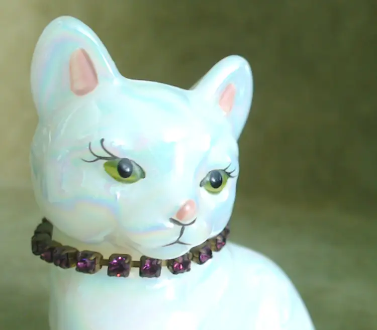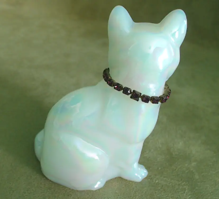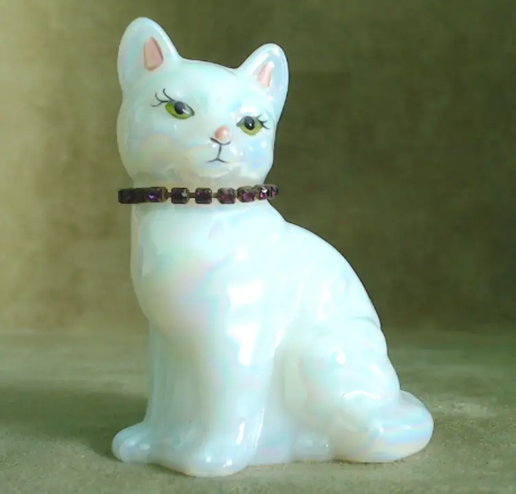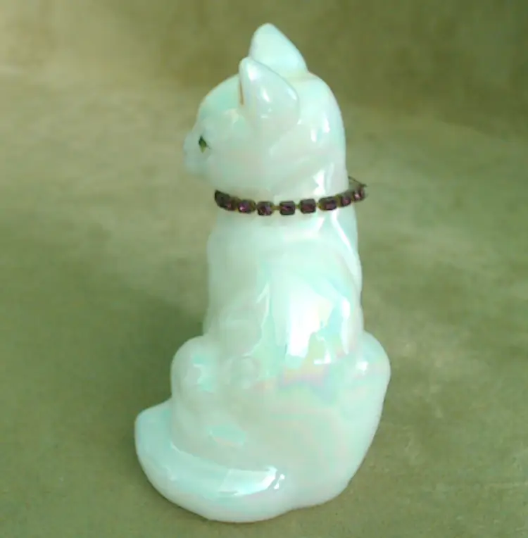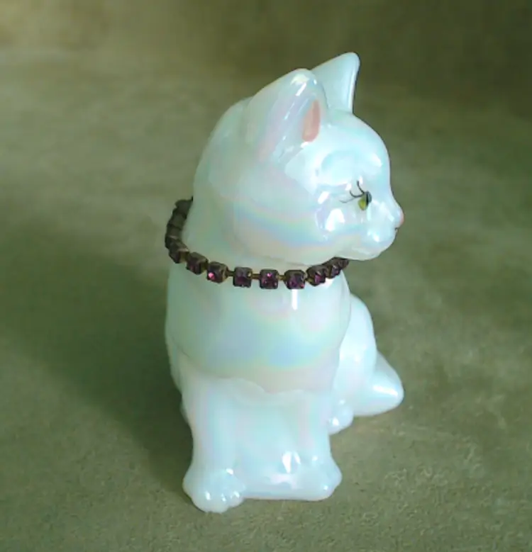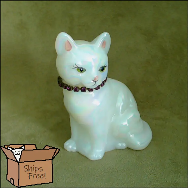 This is a vintage glass cat, with a gorgeous rainbow shimmer AND a sparkling necklace! Made by Fenton during the 1990s, and signed by Stacy Williams (as S. Allman), this pretty kitty was part of a calendar cats collection. This cat's "amethyst" necklace is made from shiny little purple rhinestones. A great gift for any February baby, whether human or kitten! What, you don't buy presents for your cats?! Condition: This cat is in excellent shape. There are no chips, cracks, or any other damage that I could find. Her necklace has all stones, and her painted face is in perfect order. Size: The cat measures about 2¾" across, is 1¾" wide, and sits just over 3½" tall.