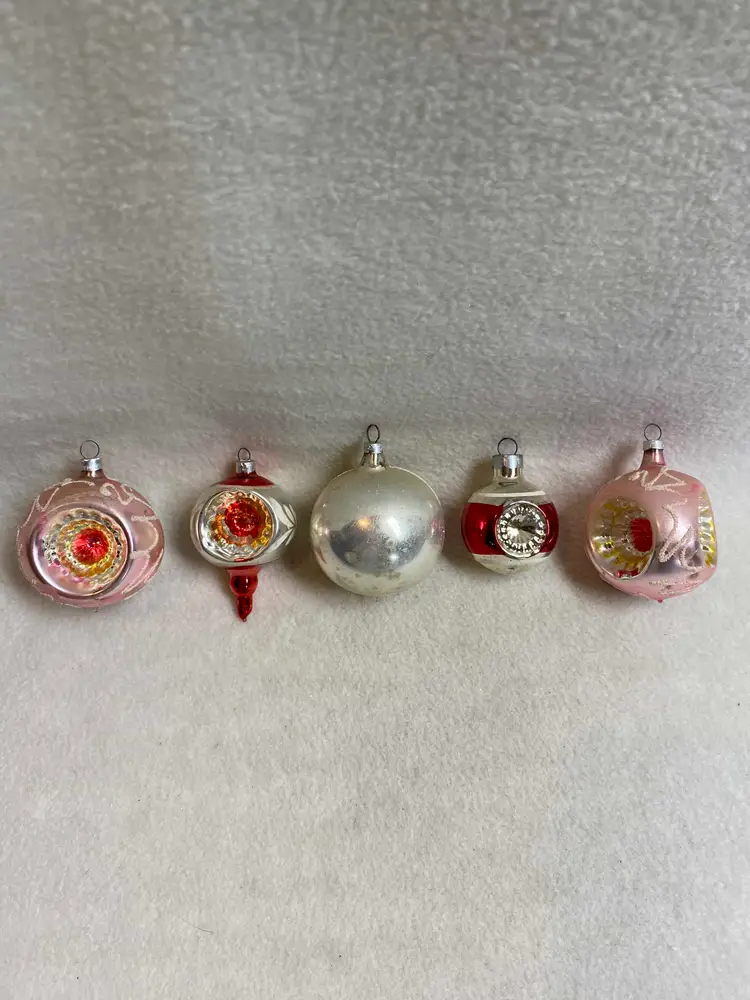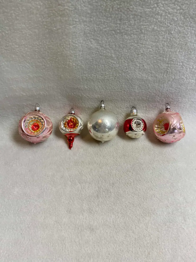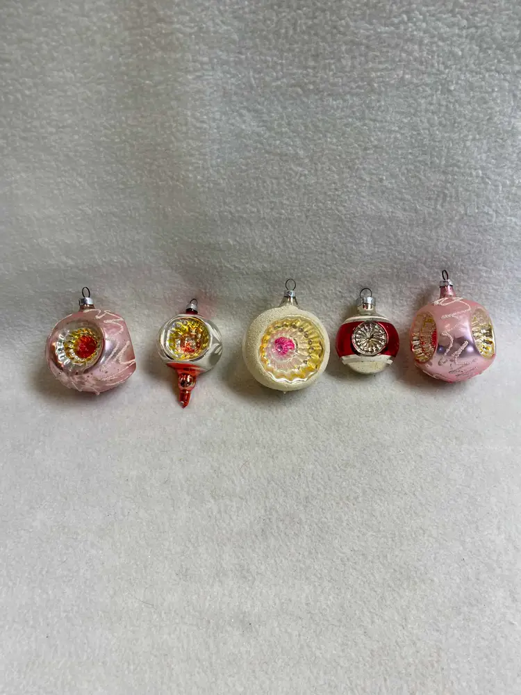 This is a set of 5 vintage indented glass ornaments. All were made in West Germany. The two pink ones are indented on three sides. Overall, they are in good condition for their age.