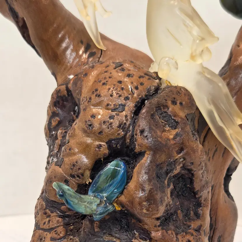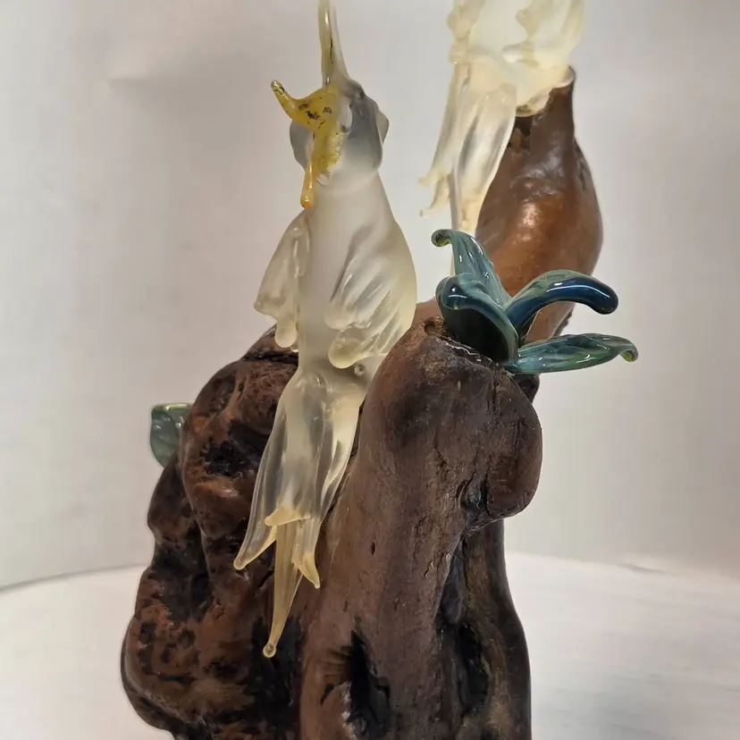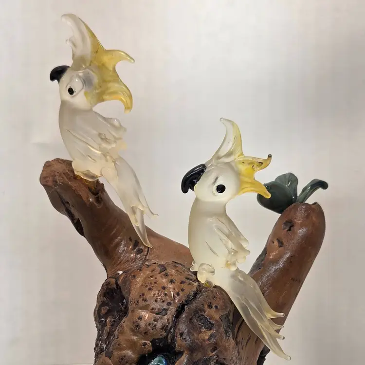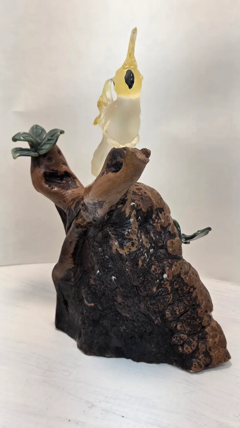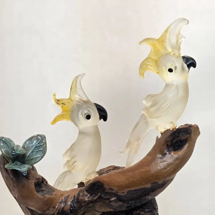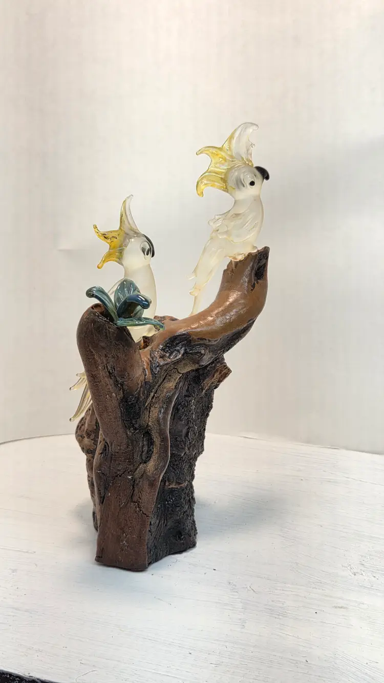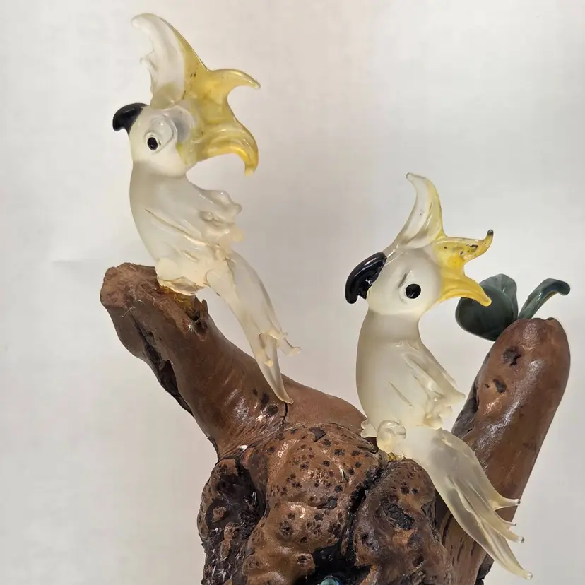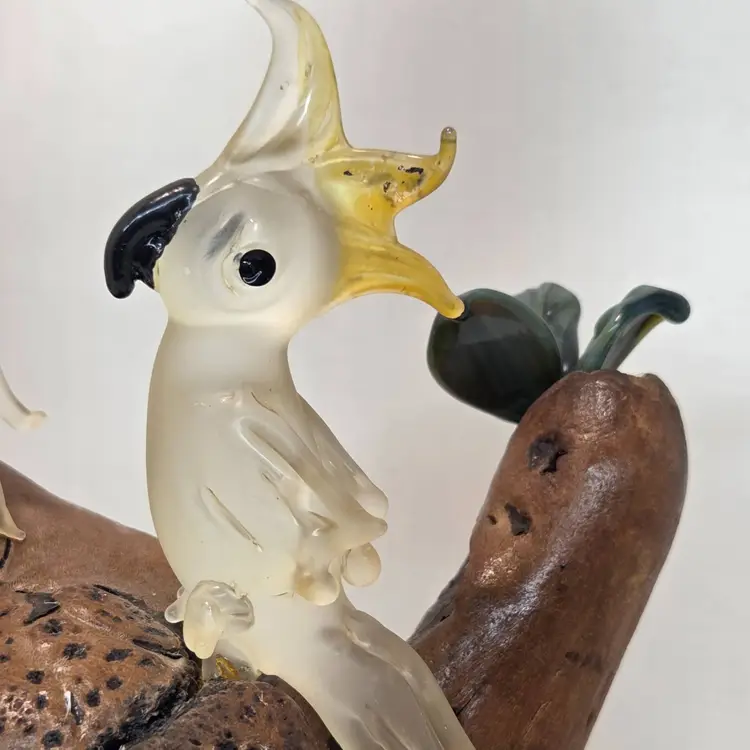 ONE OF THE PETALS IS BROKEN ON THE GLASS PLANTS. SEE PIC. approximately 8inches in height. Unsure of maker. Birds are about 2inches in height. C1