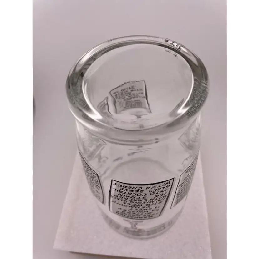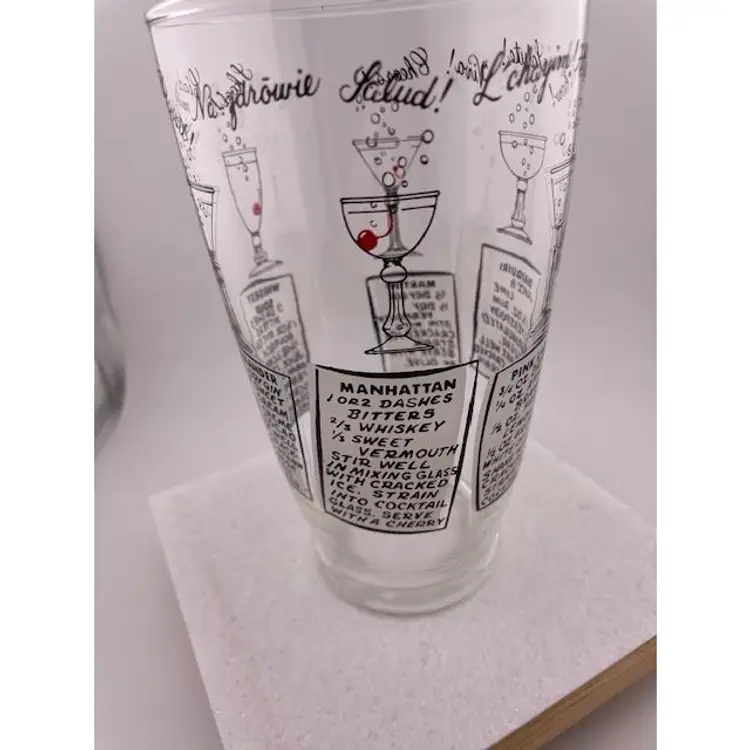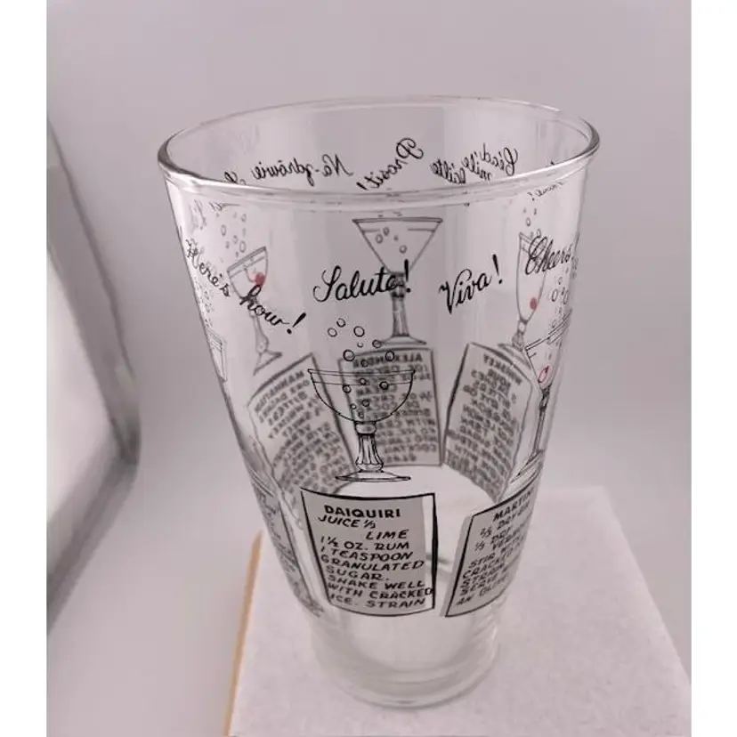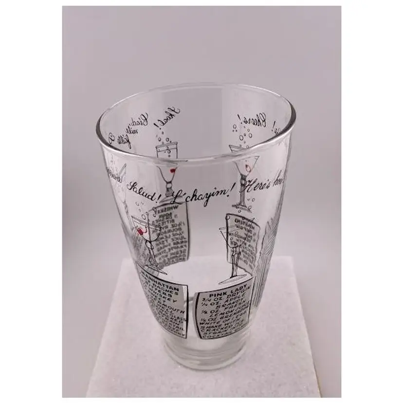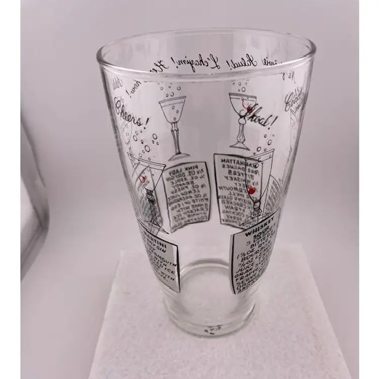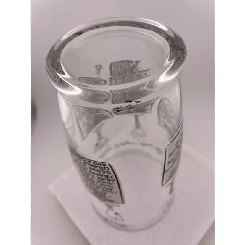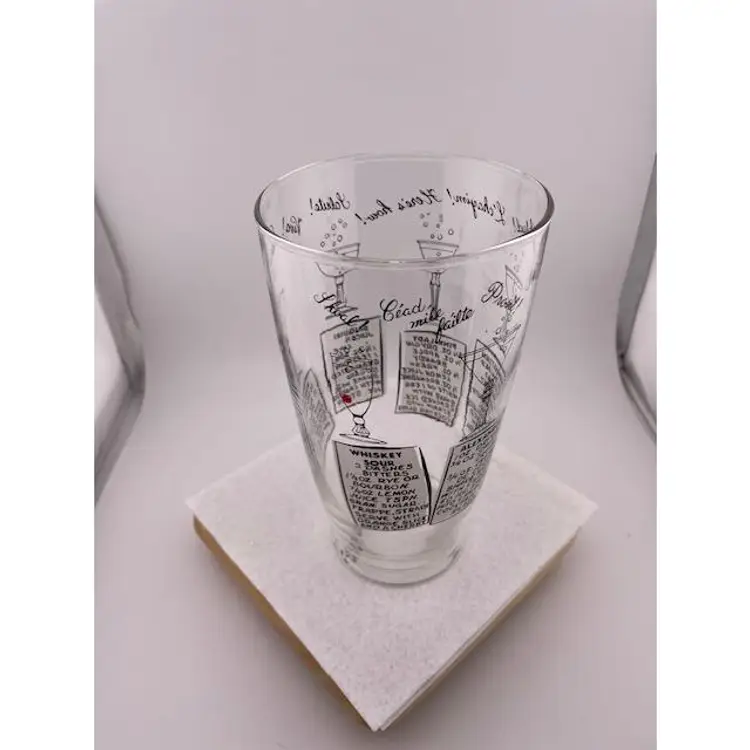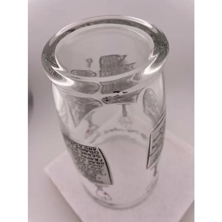 Holds 24 ounces of liquid. It does have a black mark towards the bottom of the glass, it does not impact the ability to use it in any way.
