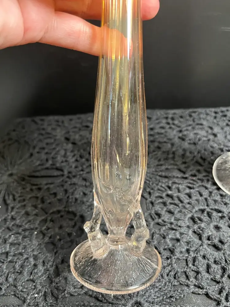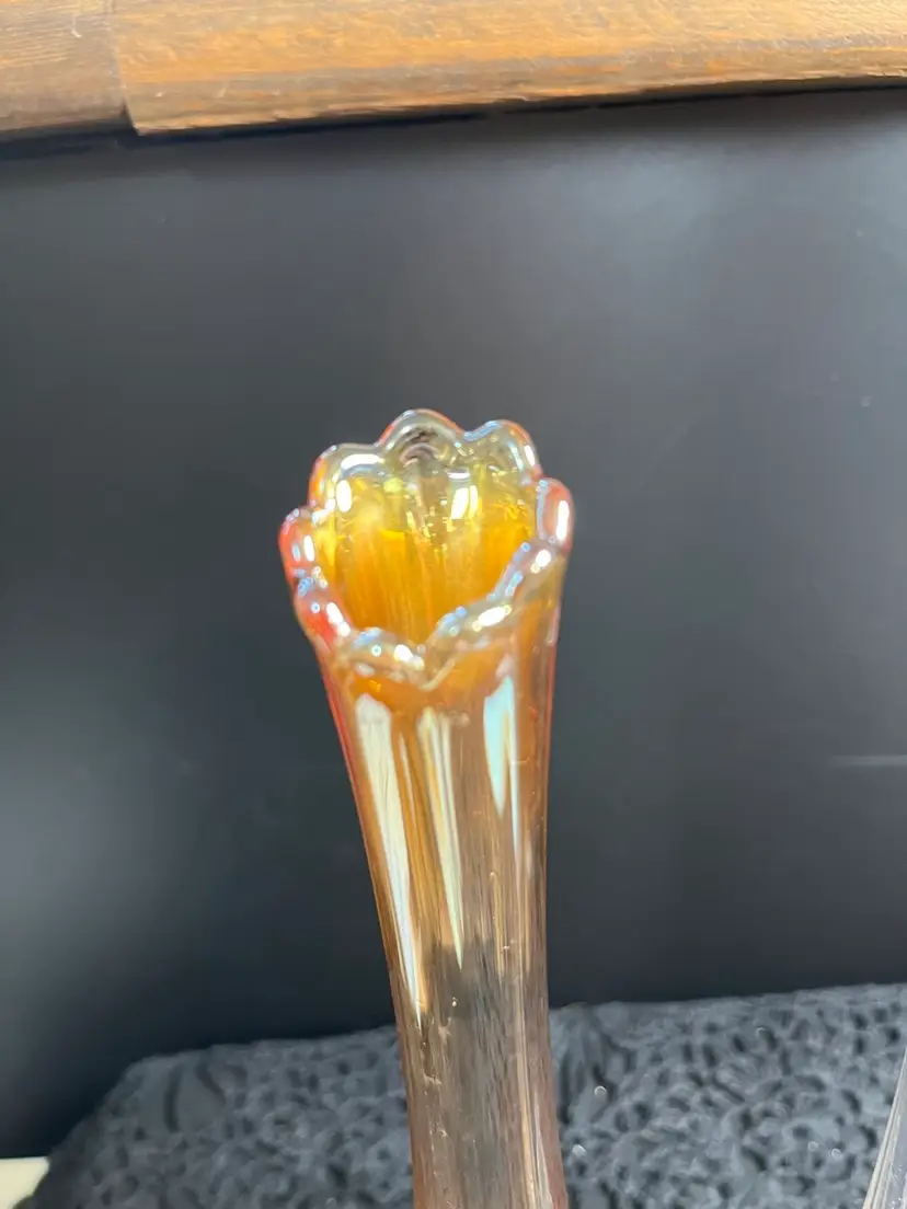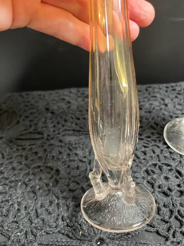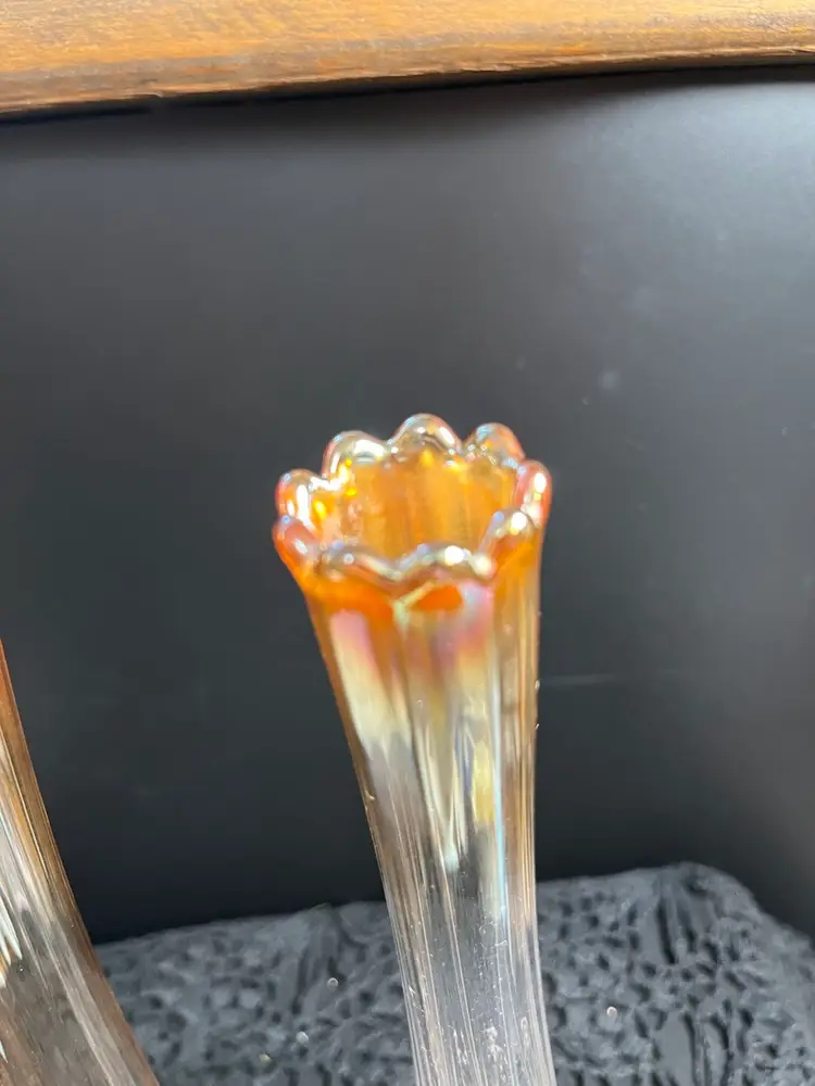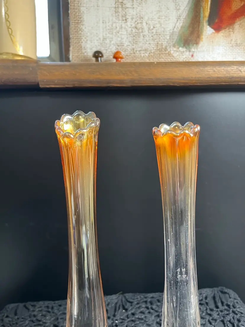 One is slightly taller than the other. Asymmetrical mouth. Very vibrant and pretty. 9.75" x 2". Approx 12.2 Oz. Lot 21