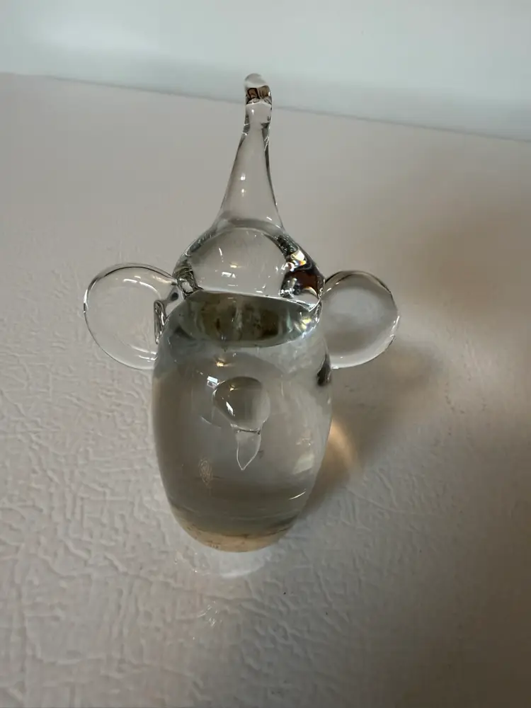 This is a special vintage clear glass elephant. He'll make a beautiful addition to your collection or use him as a paperweight. He's got his trunk raised in the air and his hears are sticking out. There is a simplicity about him that is adorable.