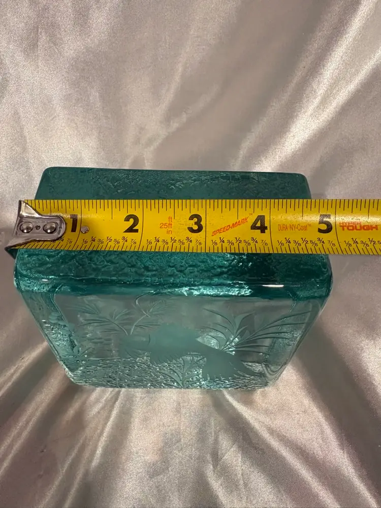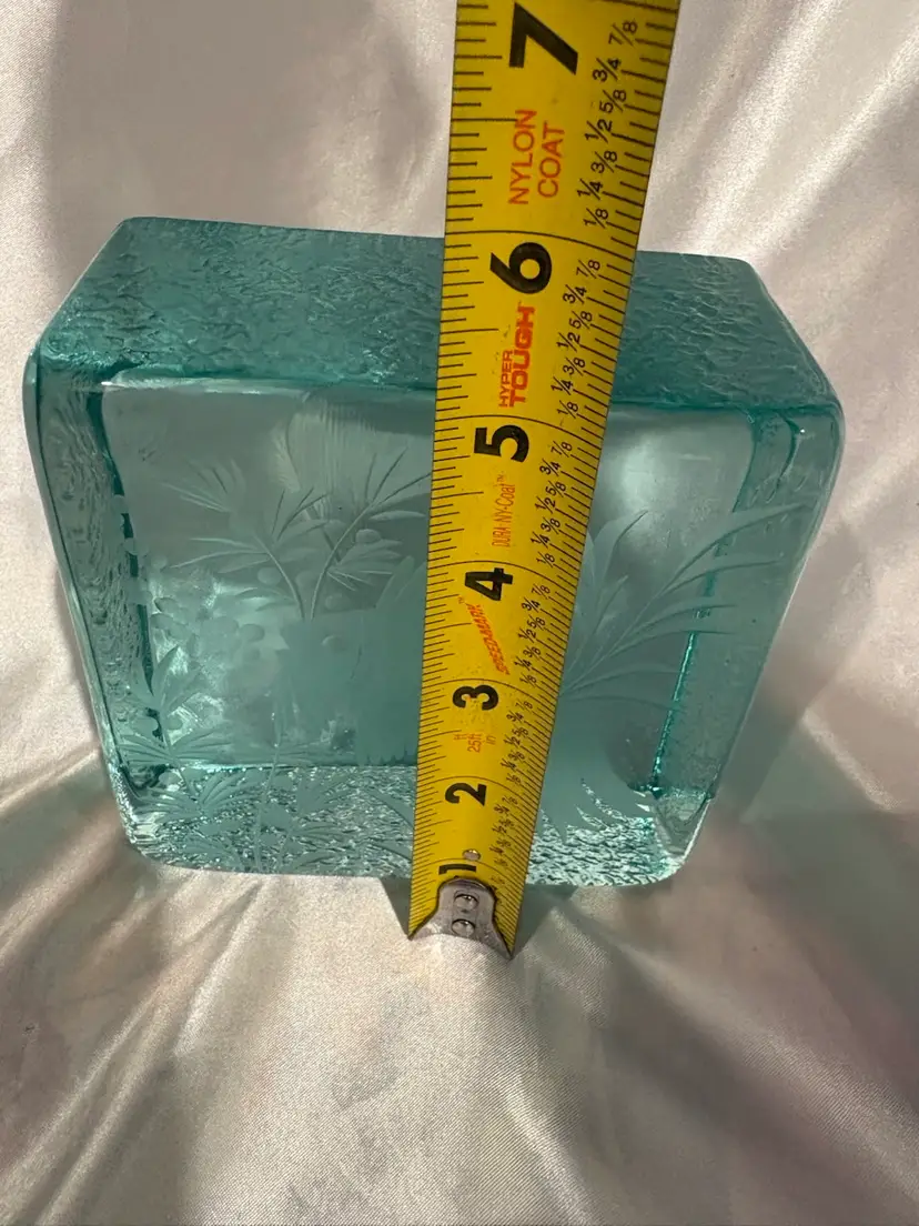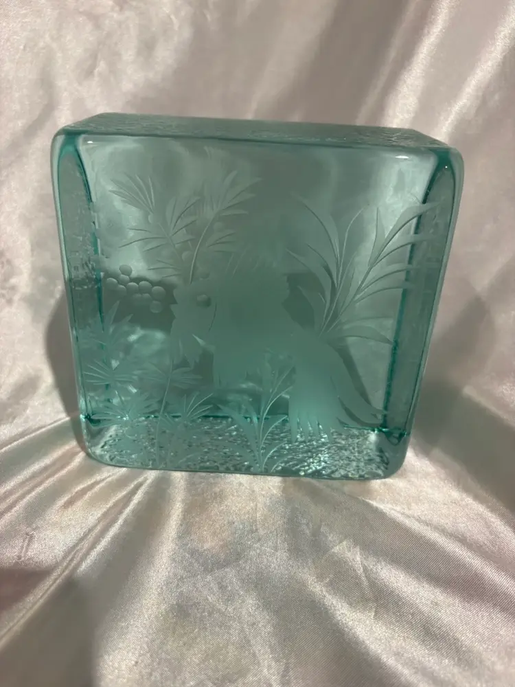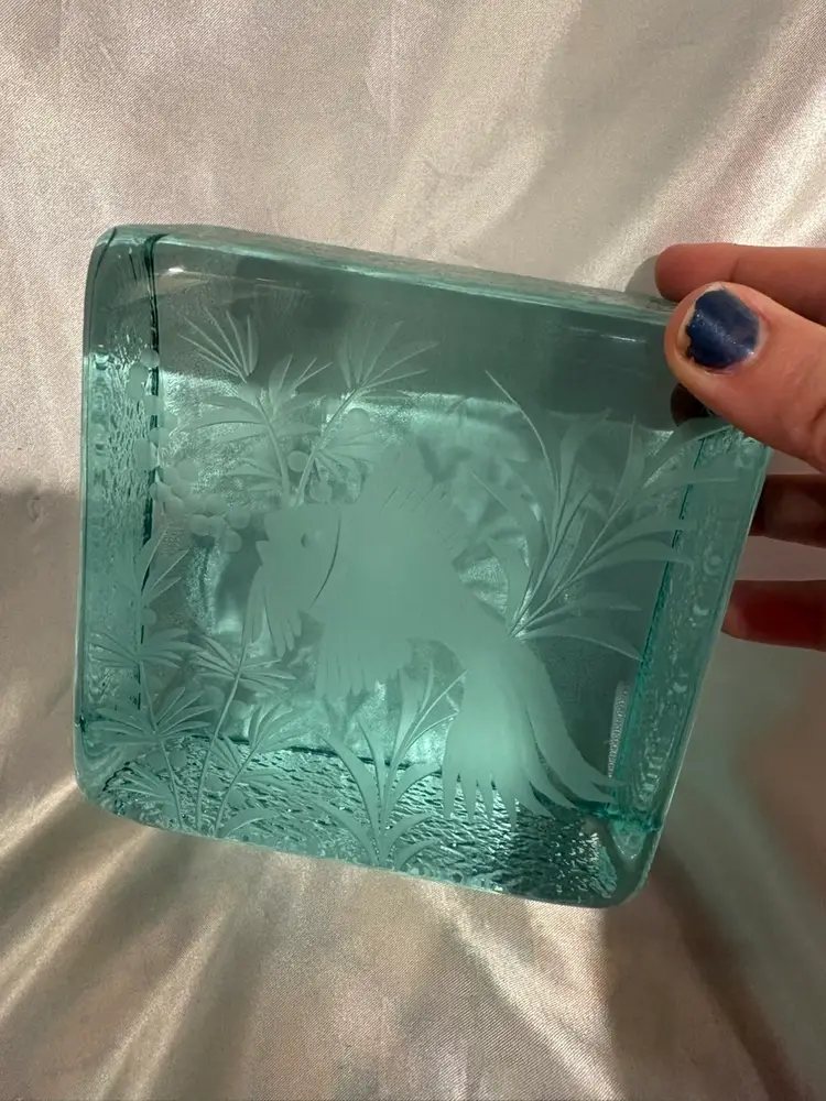 Vintage Glass Etched Fish Design Paperweight Block ?Czech glass