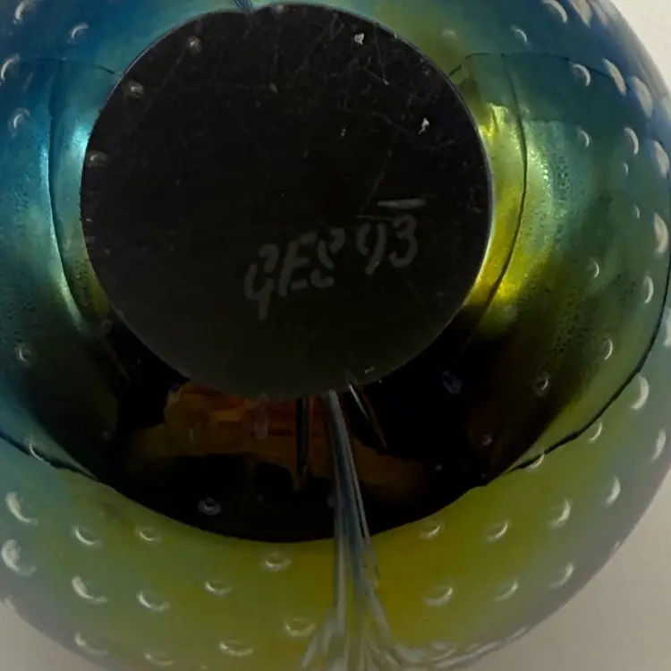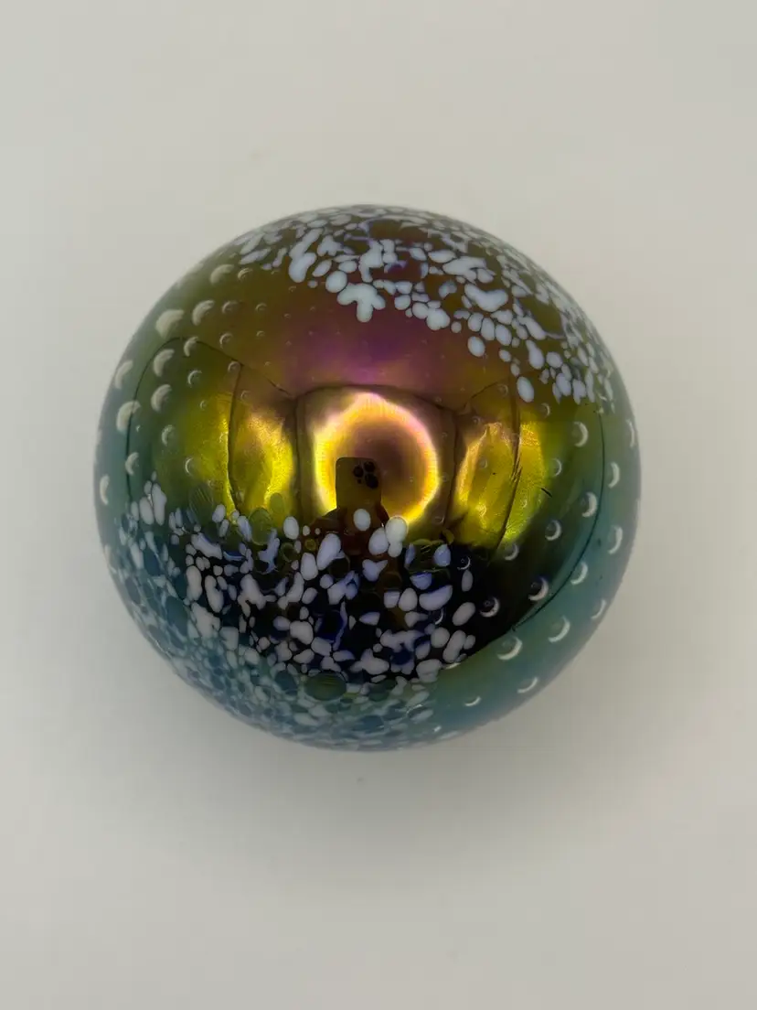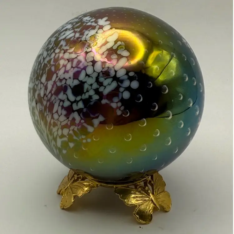 Vintage 1993 GES paperweight is a beautiful example of controlled bubble, bullicante style glass . The rainbow iridescent color make it extra special. No chips or cracks . Light scratches on bottom (Display not included) 3” round