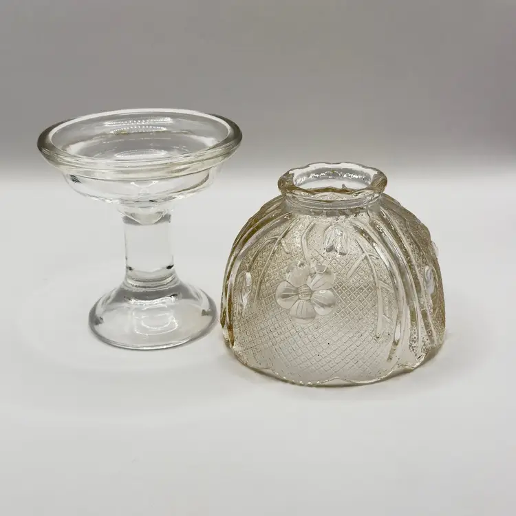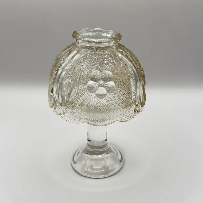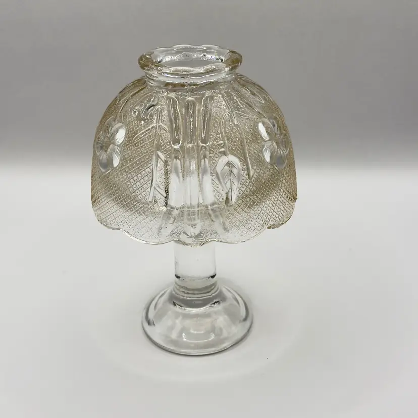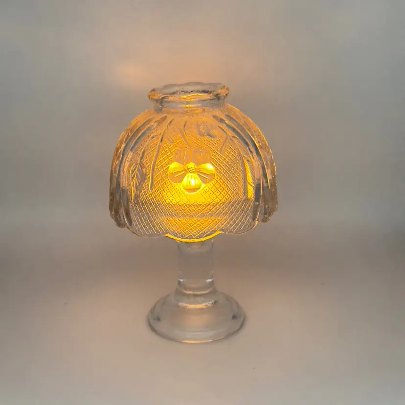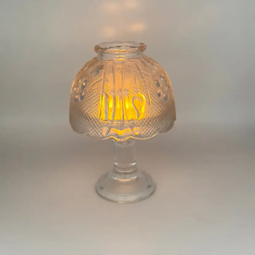 Illuminate your space with this charming vintage glass fairy lamp votive tealight holder. Featuring an intricate floral design, it casts a warm, ambient glow perfect for cozy evenings. A delightful addition to any home decor, this piece is in excellent condition with no chips or cracks. Measures 6x4x4 inches. Weighs 1lb 6oz.