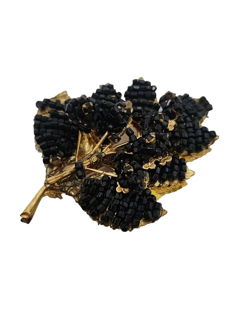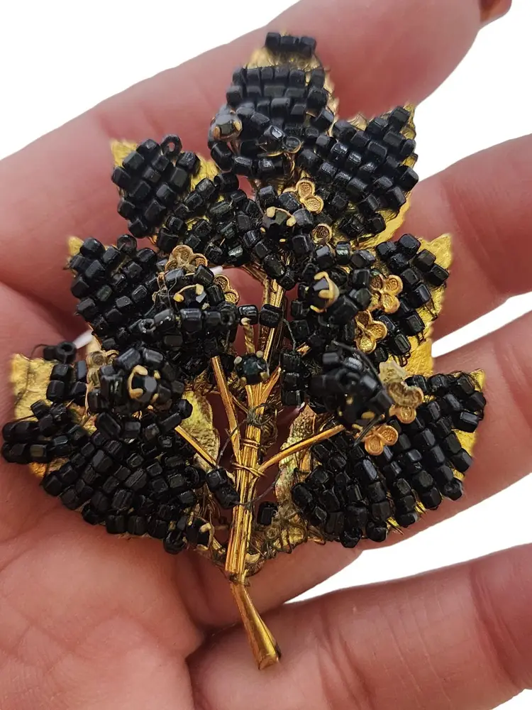 Size: 3" Color: Gold, Black Condition: Good vintage Signed: None Details: Some beads are missing but still in nice condition.