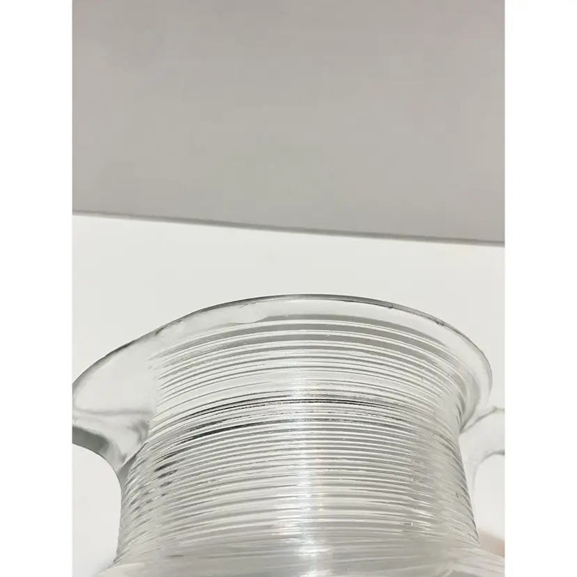 Vintage glass juice pitcher with bubbles in the glass. Refer to picture of what appears to be chips but they are smooth and seem like imperfections instead. Measures 7.25" by 5".