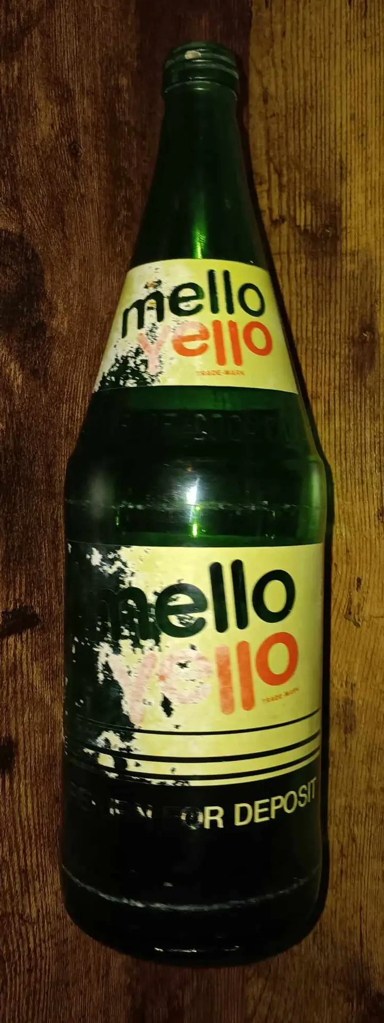 Vintage glass Mellow Yellow bottle. Has wear from use. Good used display condition. It measures 11 ¾ inches tall and 3.5 inches wide at the bottom.