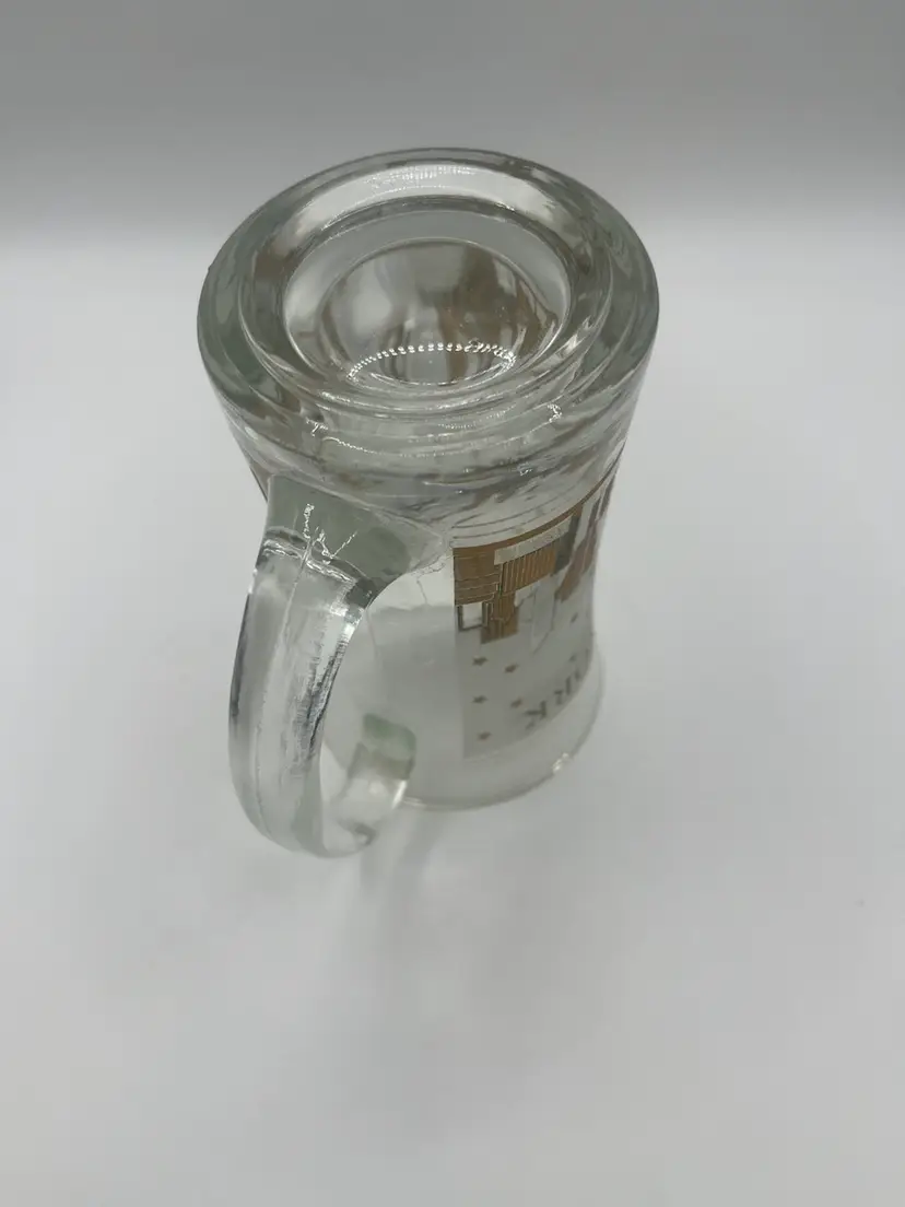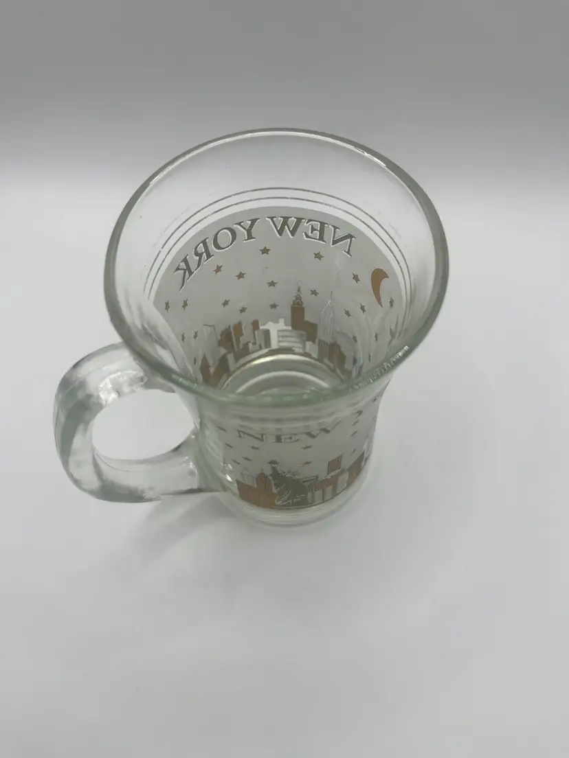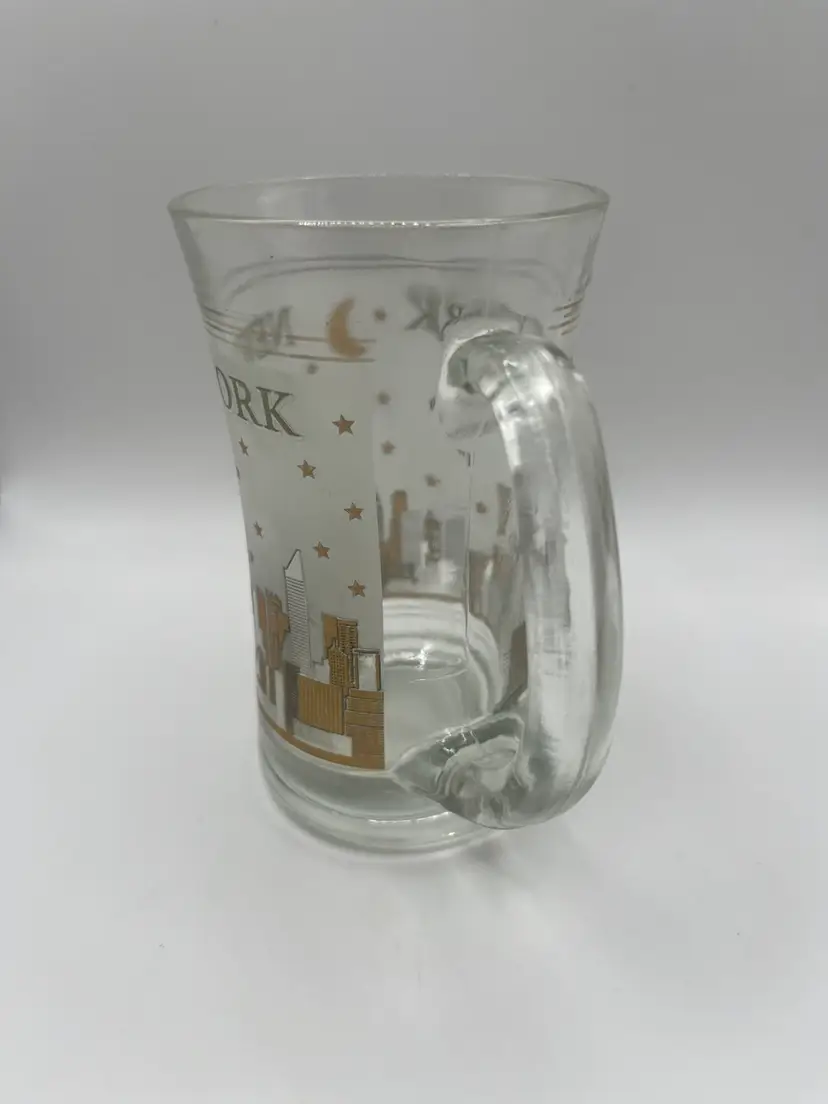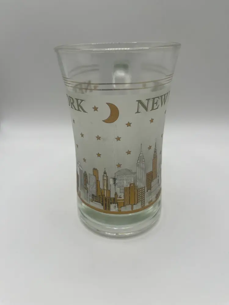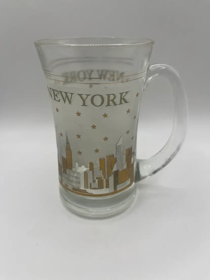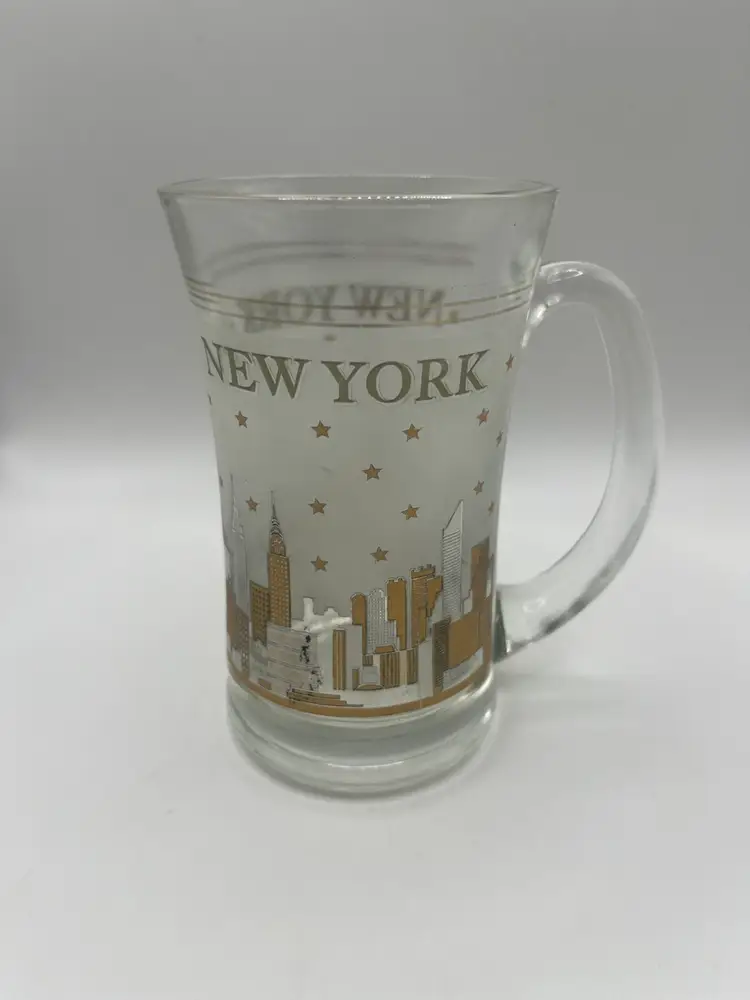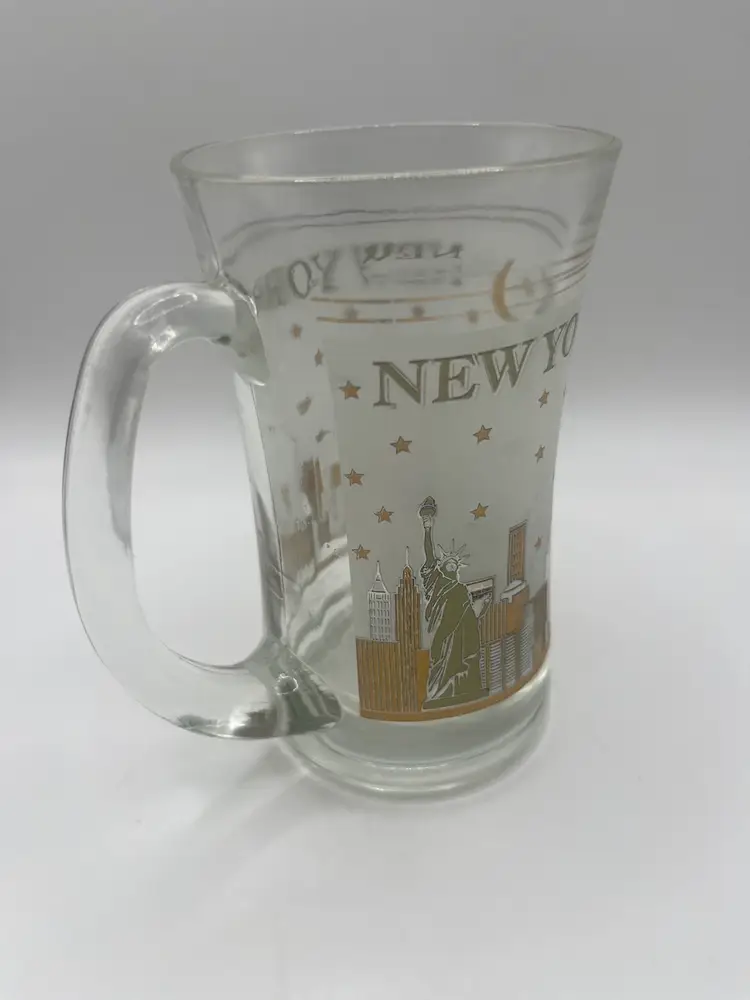 This vintage glass mug features a frosted depiction of the New York City skyline, likely from the mid-20th century. It is a collectible souvenir item. The mug shows the New York City skyline, including the Statue of Liberty, and other buildings. The design is in frosted glass with gold trim and stars. The text "NEW YORK" is printed on the mug. It is a vintage item, possibly dating back to the 1960s or earlier. 5” tall Great condition for vintage age.