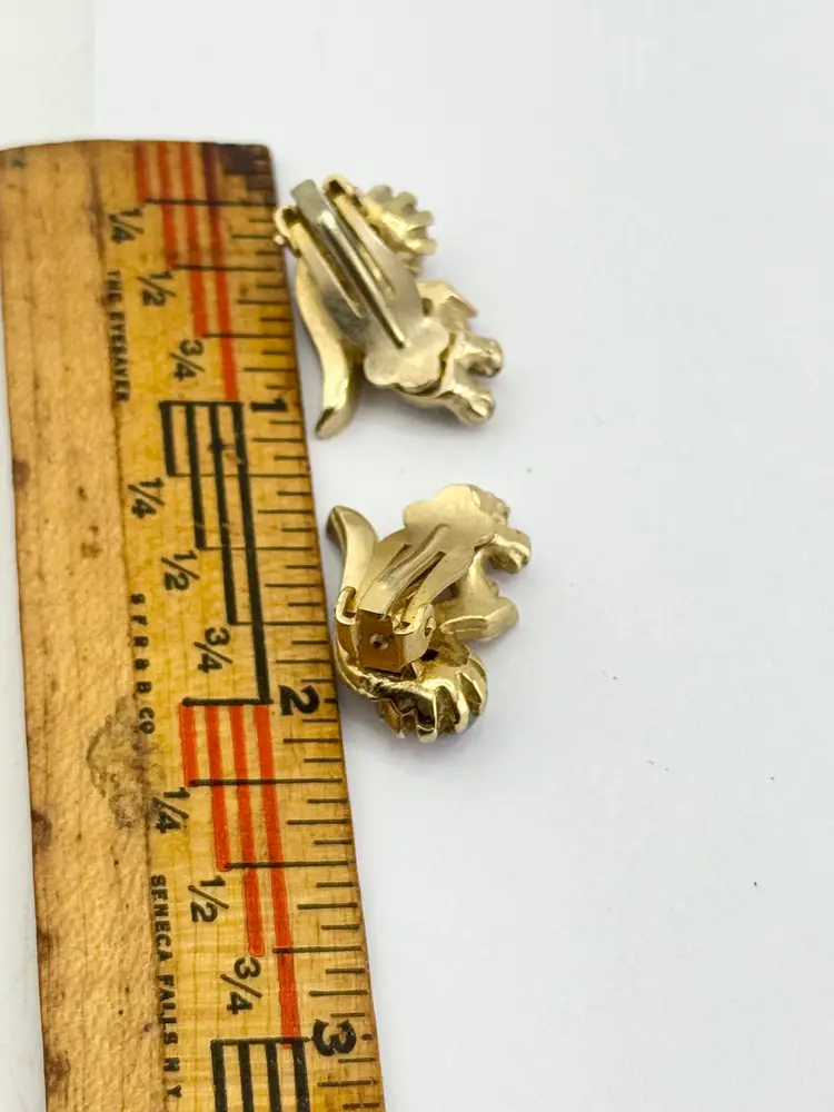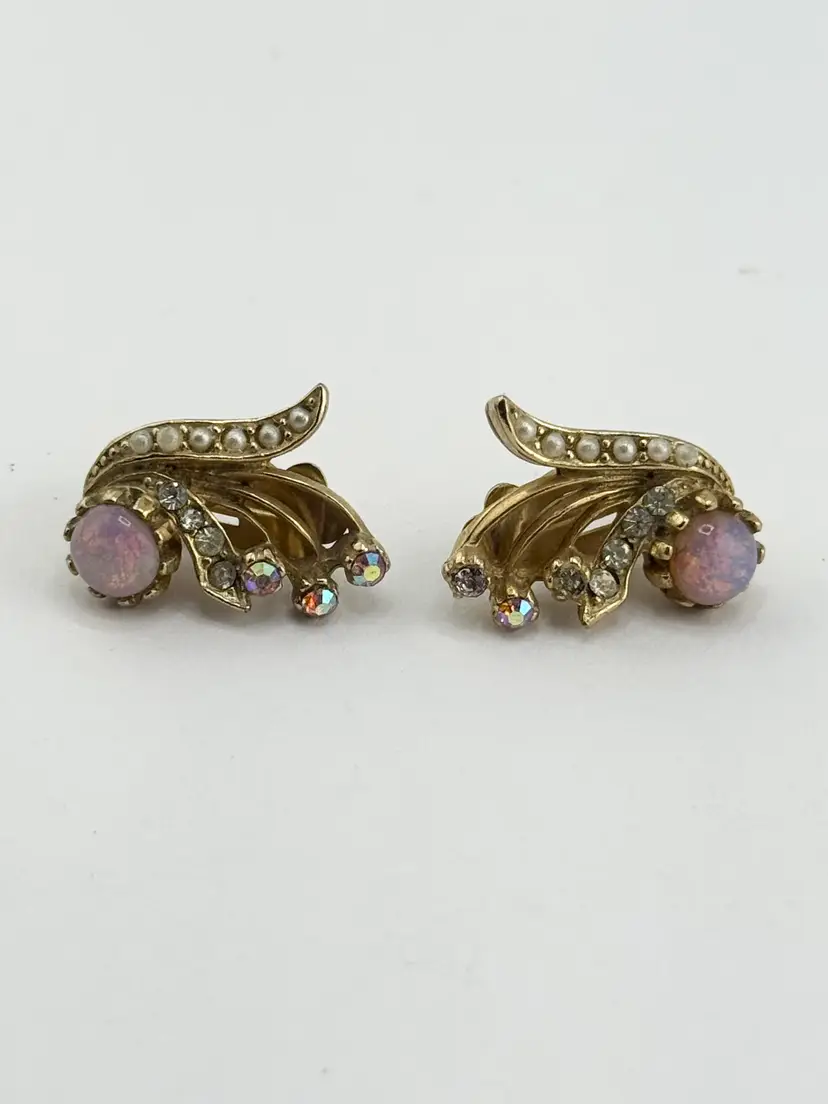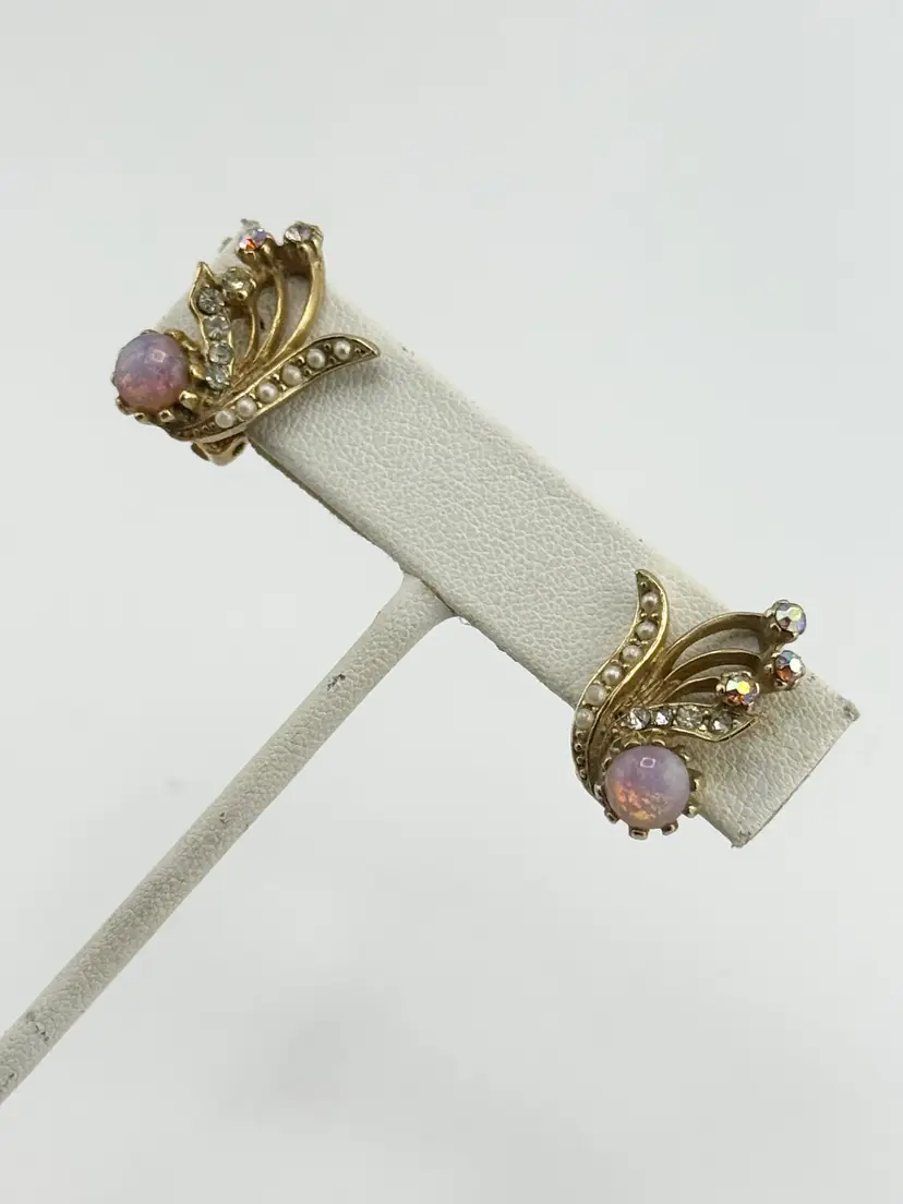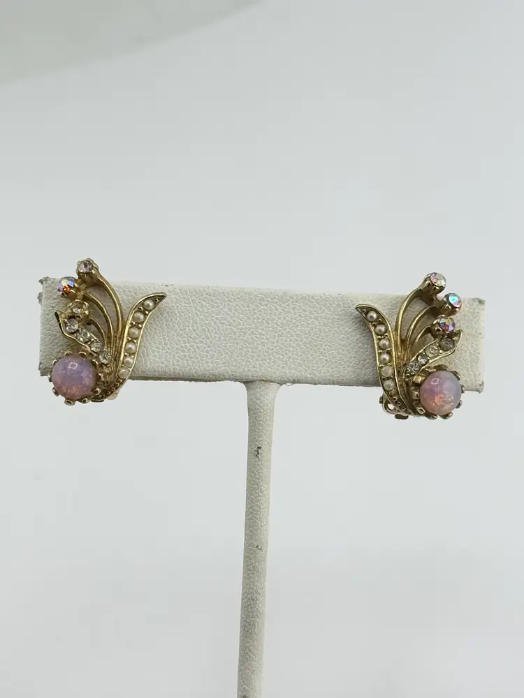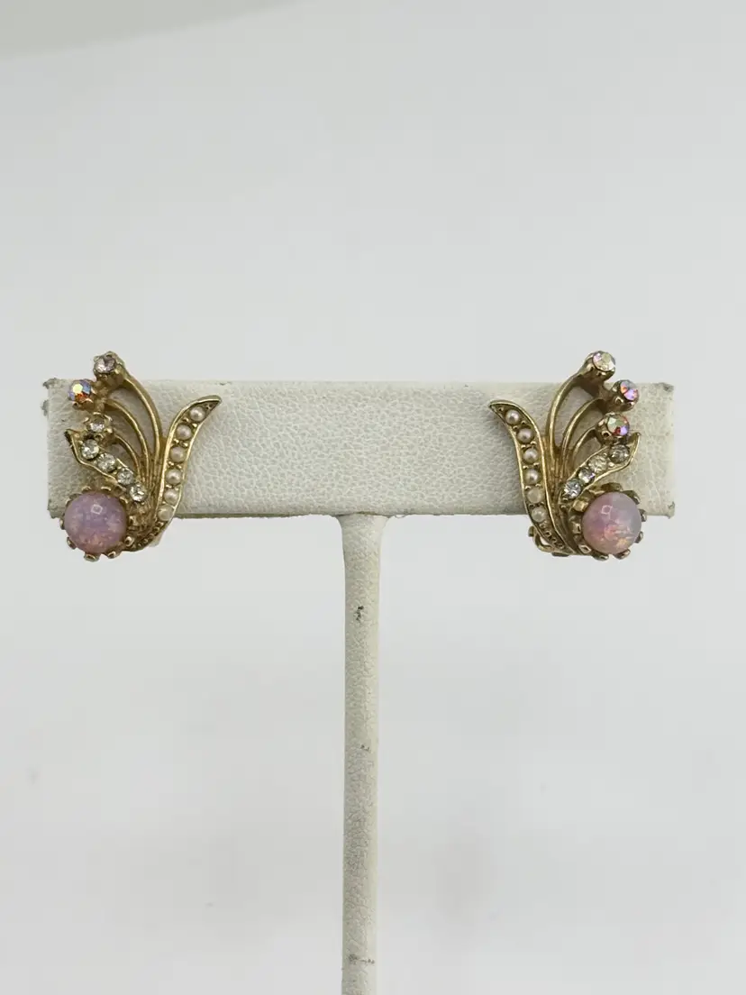 Vintage glass opal rhinestone clip on earrings. Gold tone clip on vintage earrings. Glass opal rhinestone design. Floral design. MN53GH.
