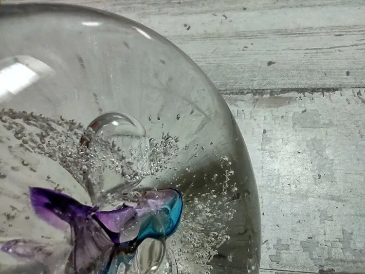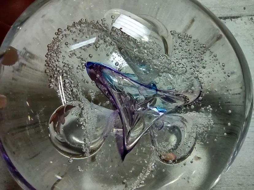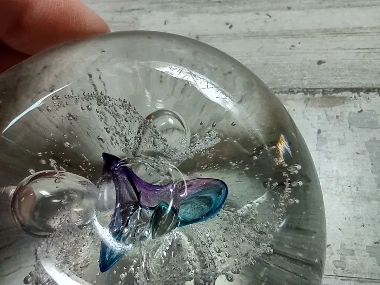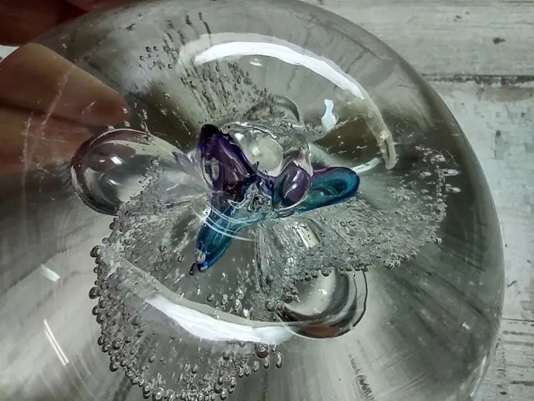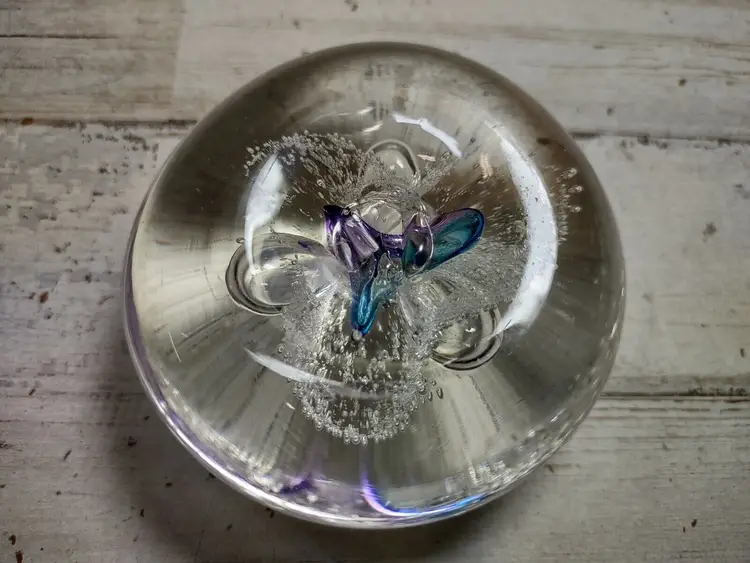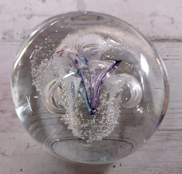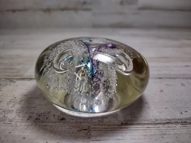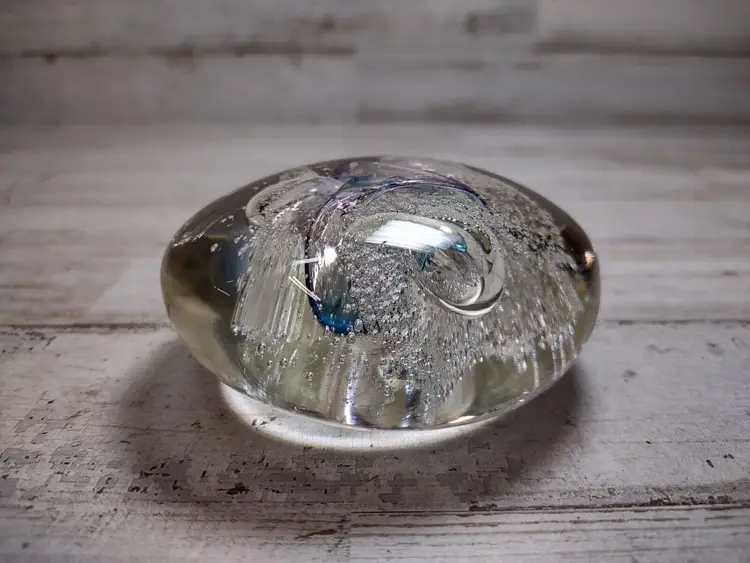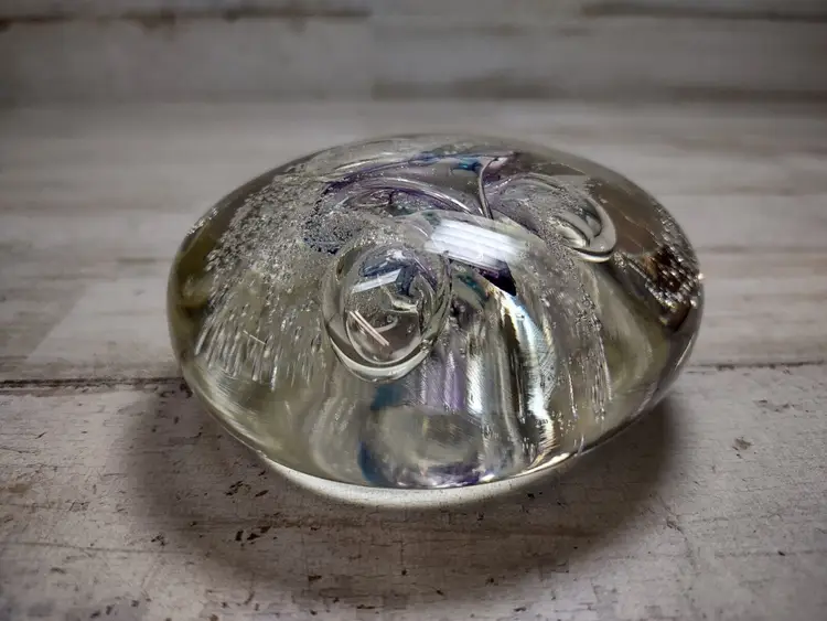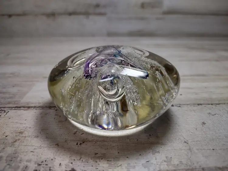 Used vintage condition with light wear or scuffing. Paperweight is not perfectly round and has an uneven surface due to manufacturing. Measures approximately 3" in diameter and 1.25" tall. See photos for more detail.