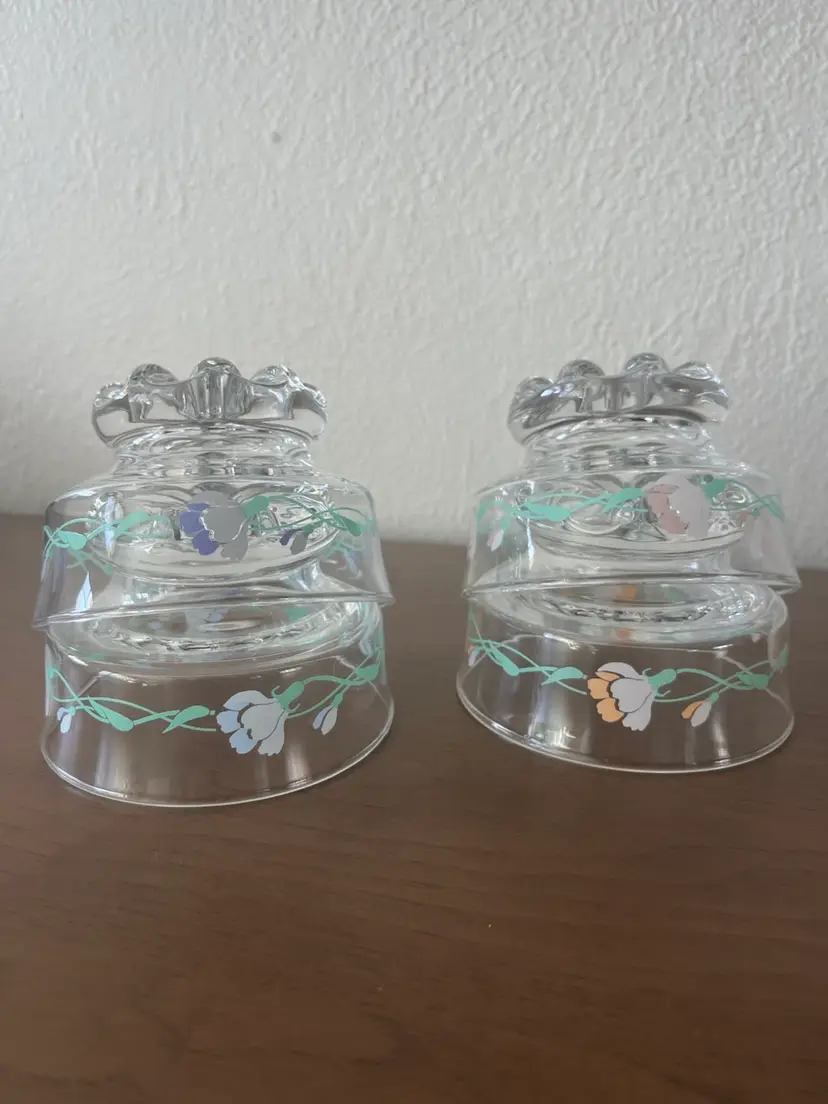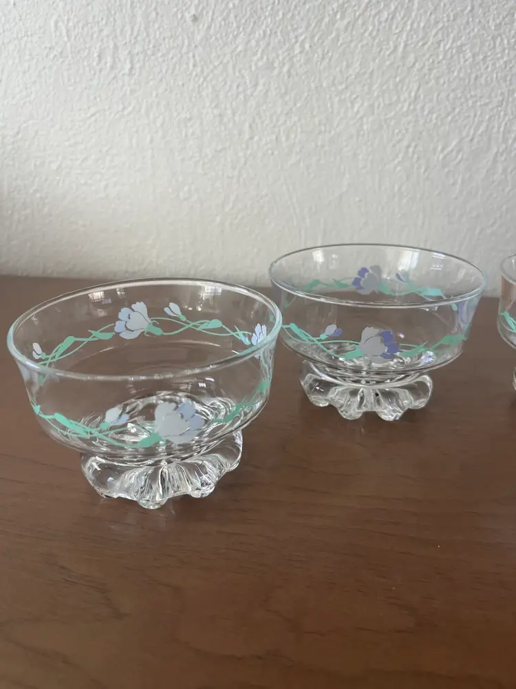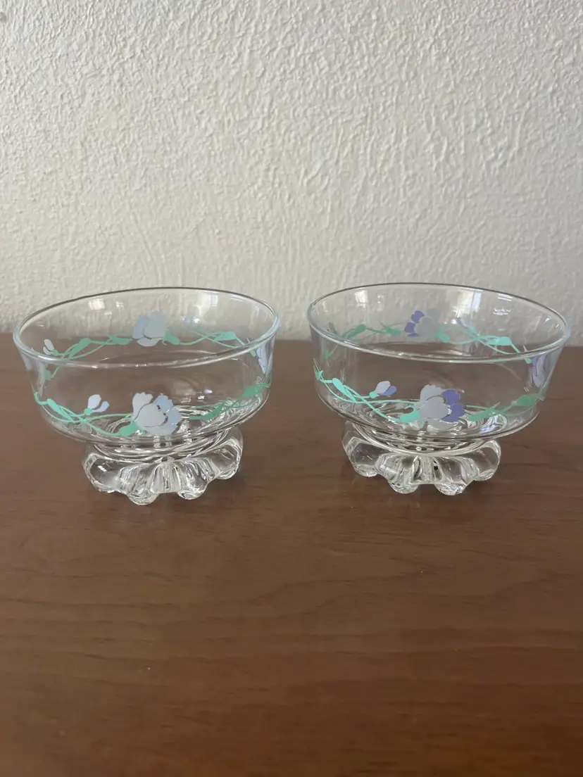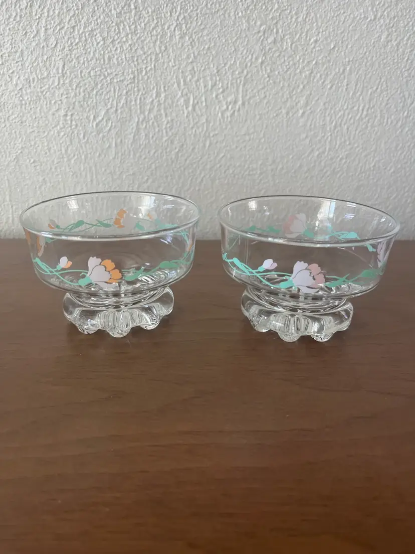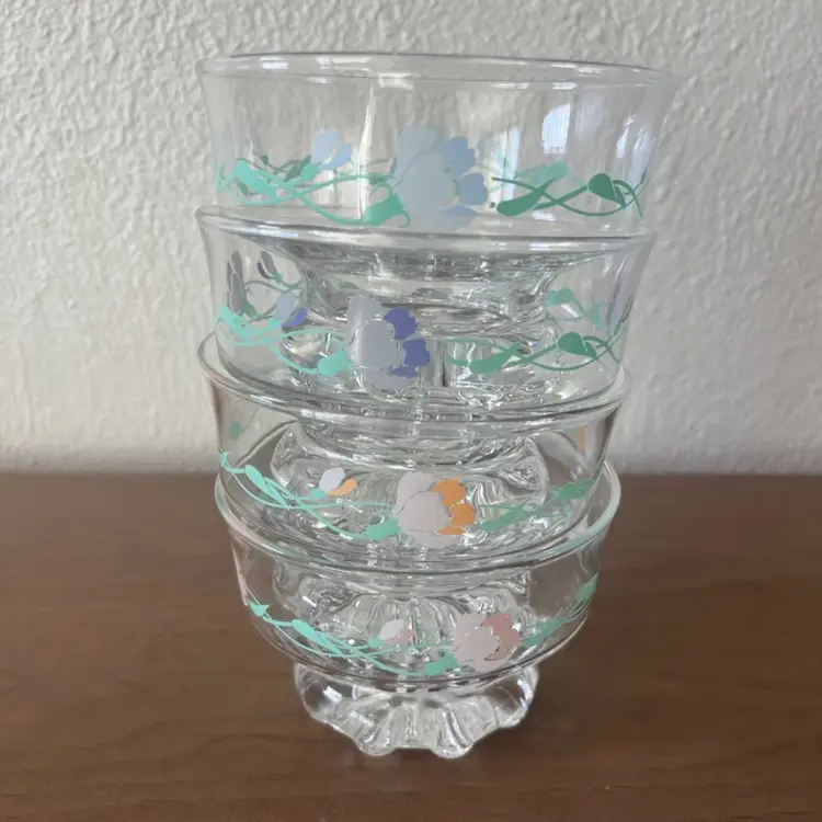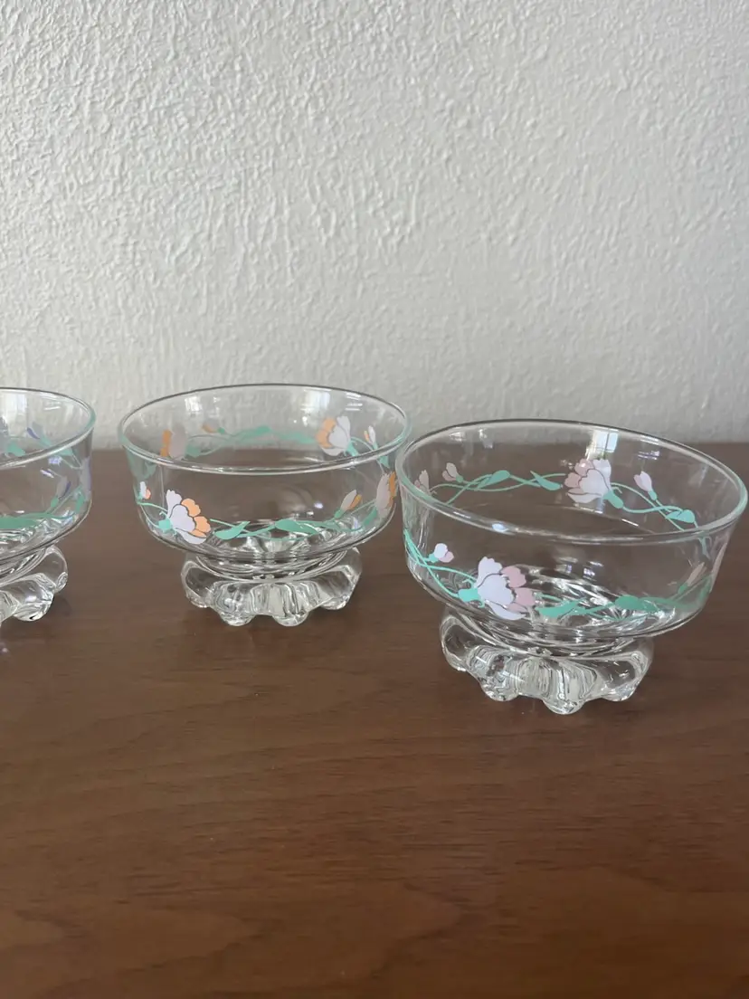 Set of 4 vintage glass footed dessert bowls feature a delicate pastel floral pattern and are commonly used for serving sundaes, sorbet, or pudding.