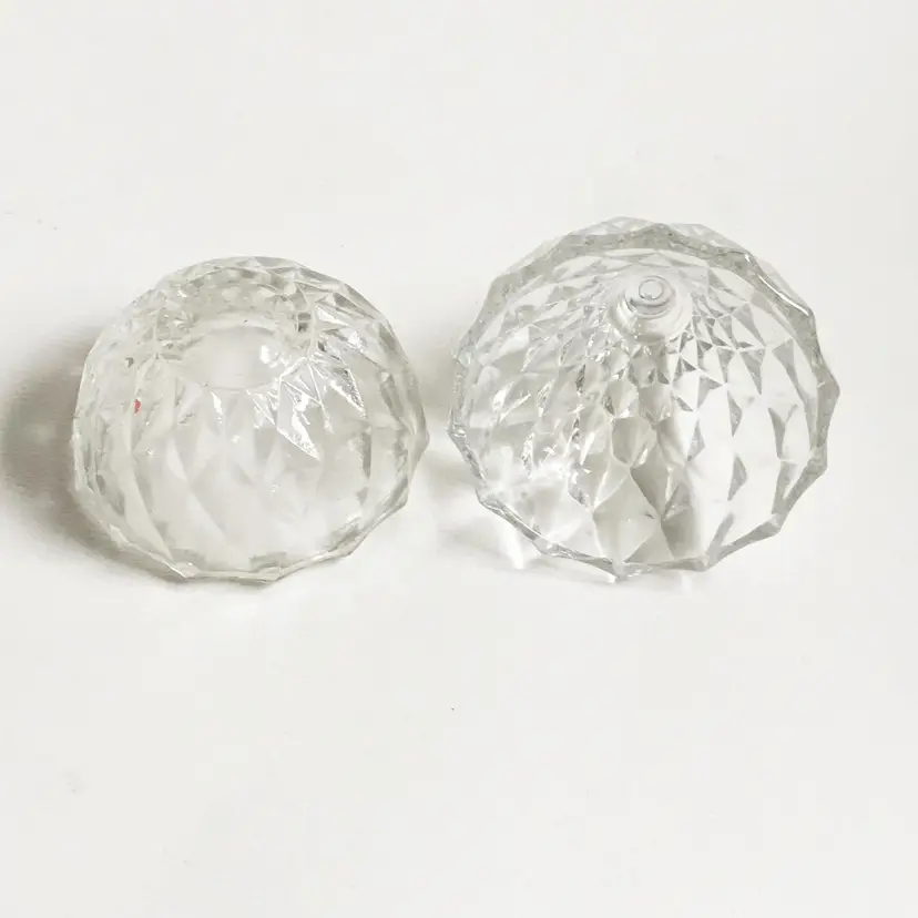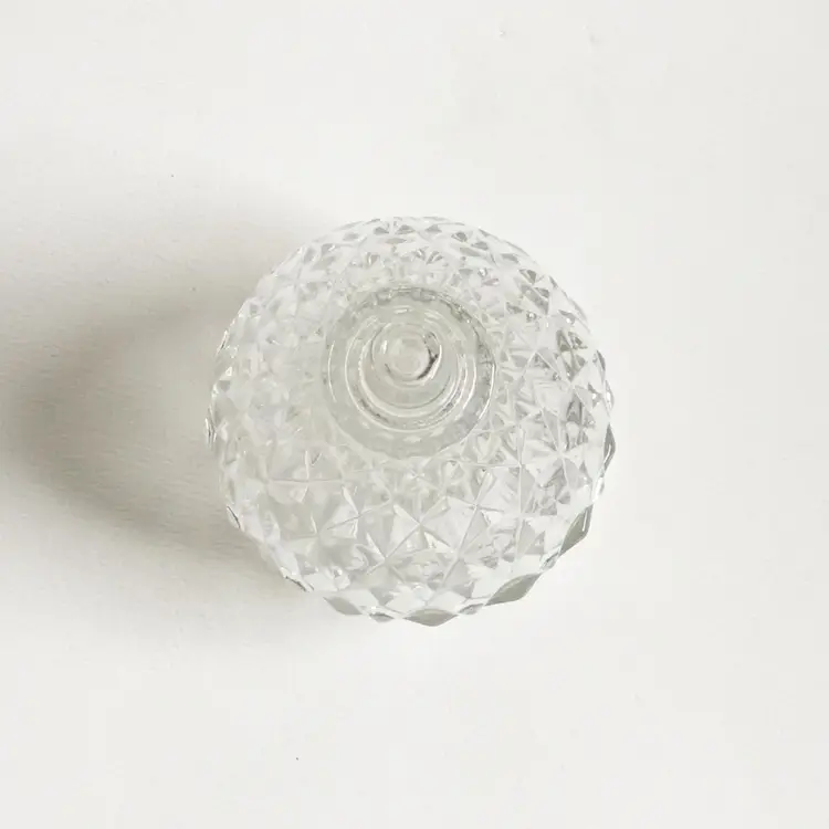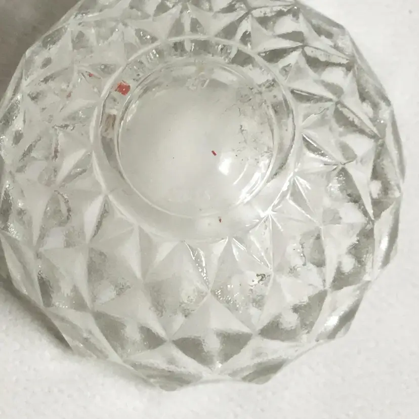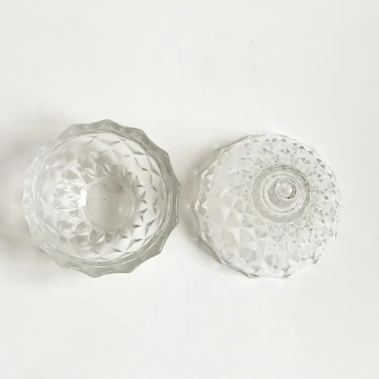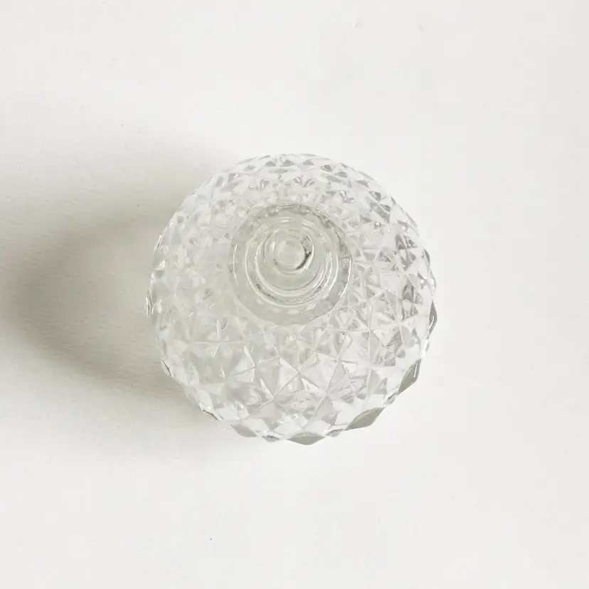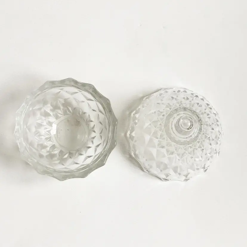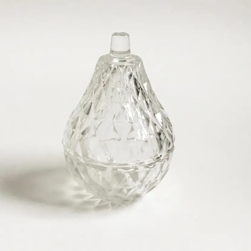 This two-piece clear glass pear shaped trinket box features a diamond pattern throughout. In great condition. No chips or cracks. Marked "Italy" on the bottom.