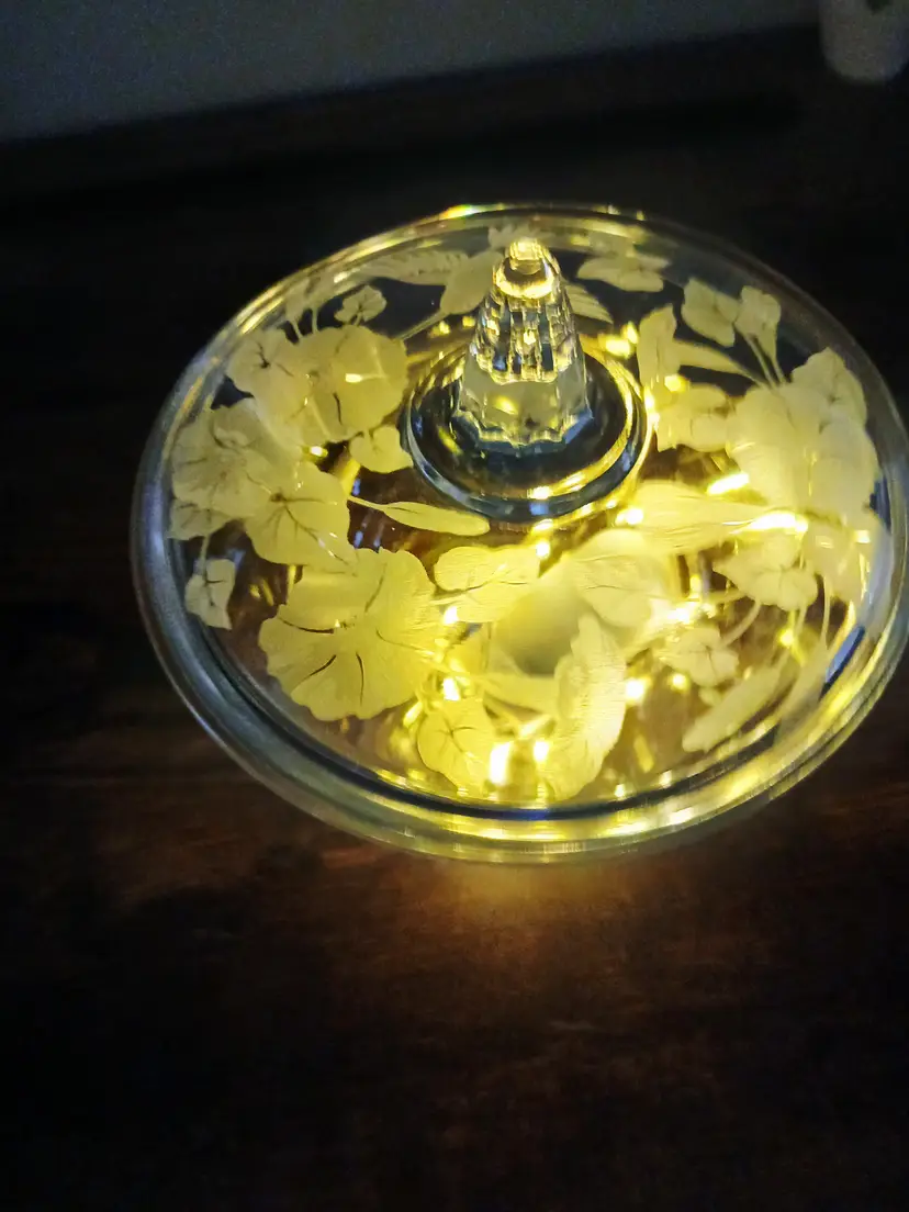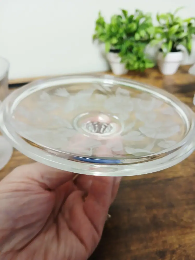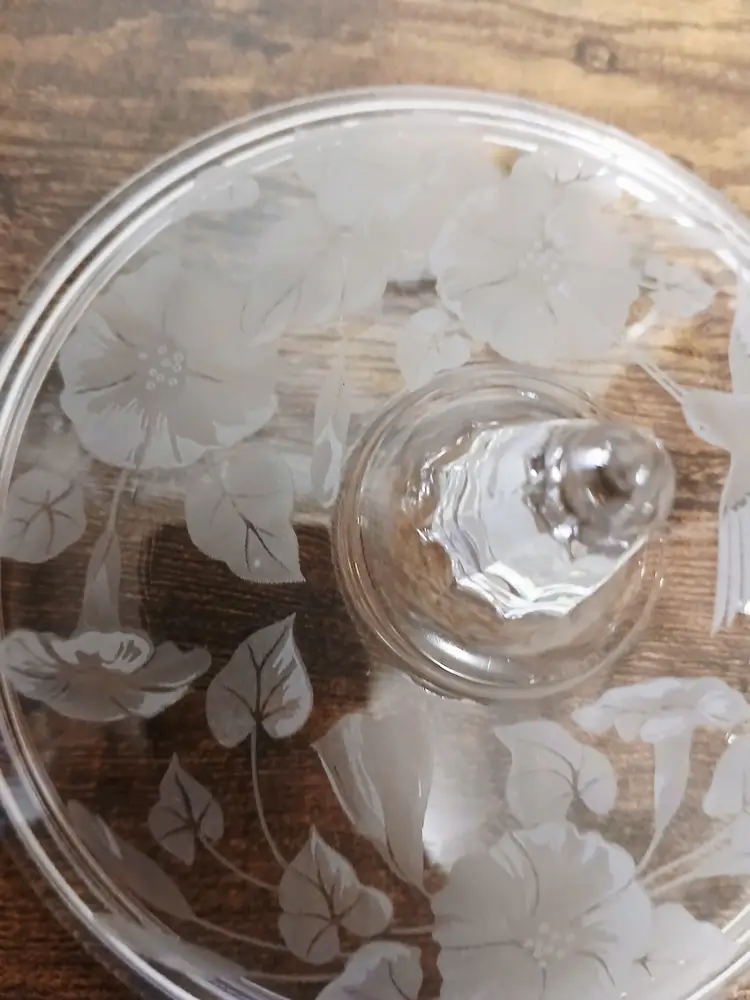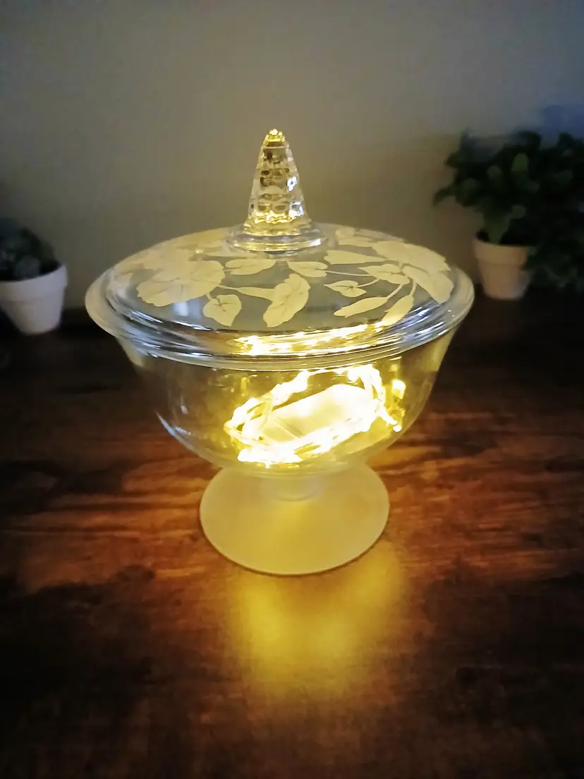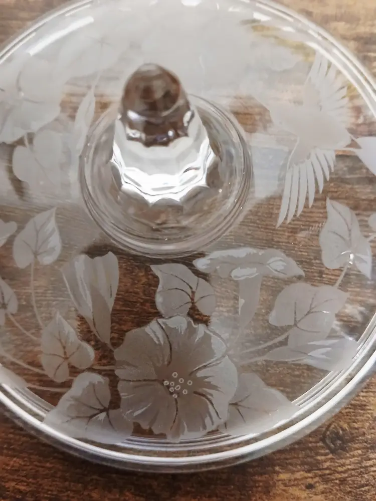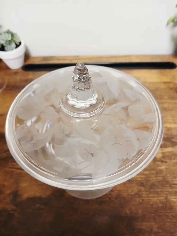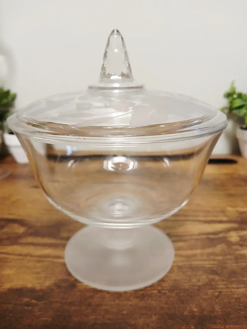 Add a touch of elegance to your decor with this vintage glass candy dish. Featuring a classic pedestal design and a matching lid, it's perfect for storing treats or as a decorative centerpiece. Approximately 6 1/2" x5"