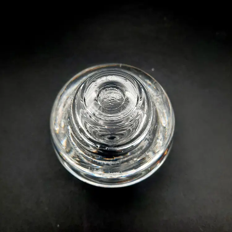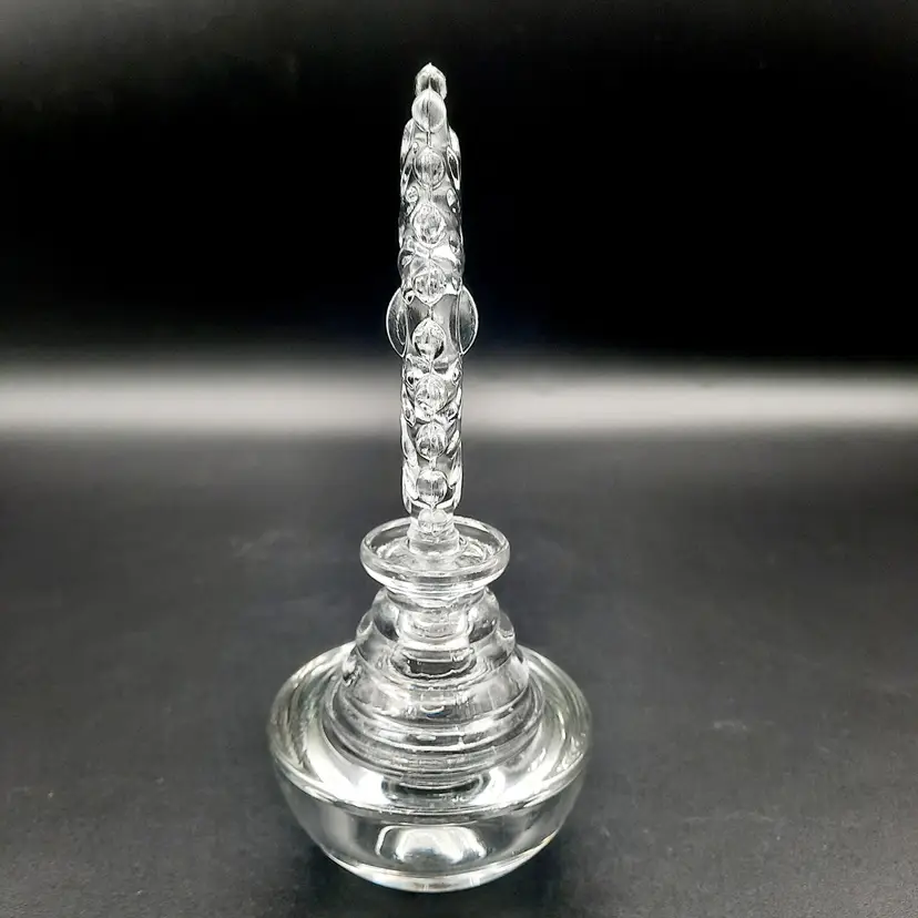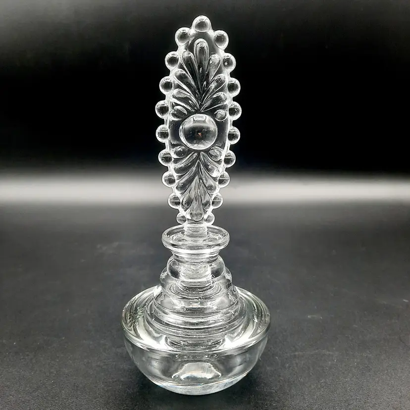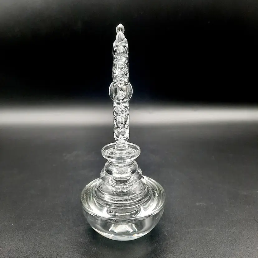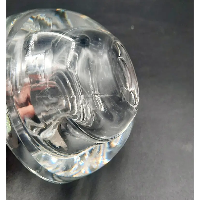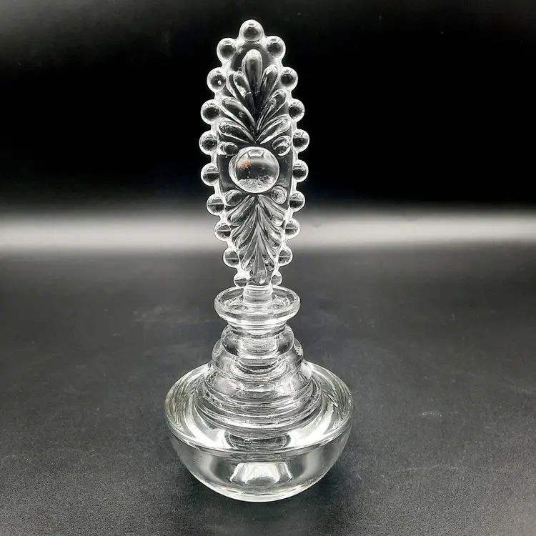 6 3/4"H, bottle is 2 3/4"W, stopper is 4", overall great condition with a few fleabites on edge of bottle, line in bottle doesn't look or feel like a crack, most likely a mfg flaw