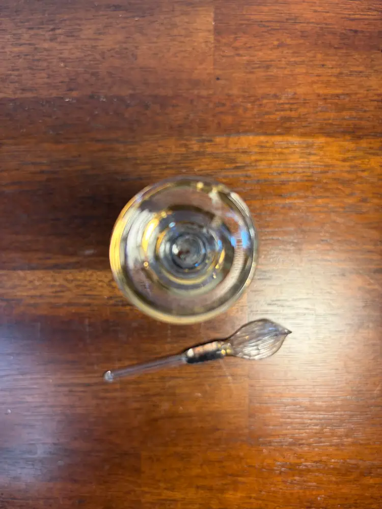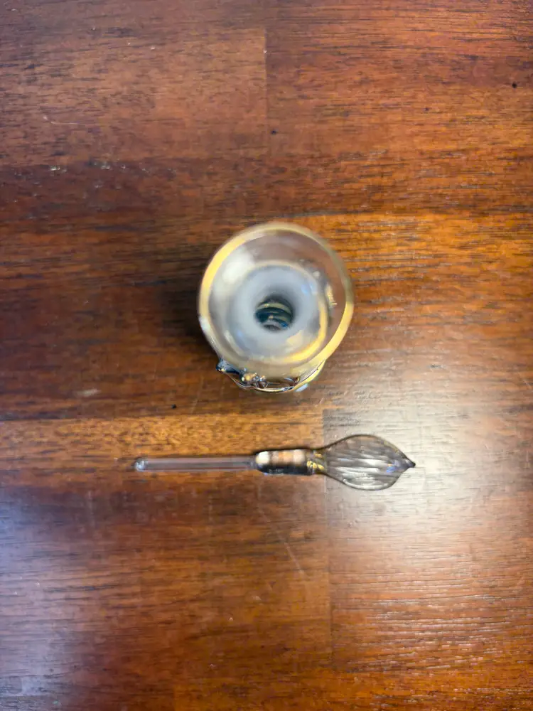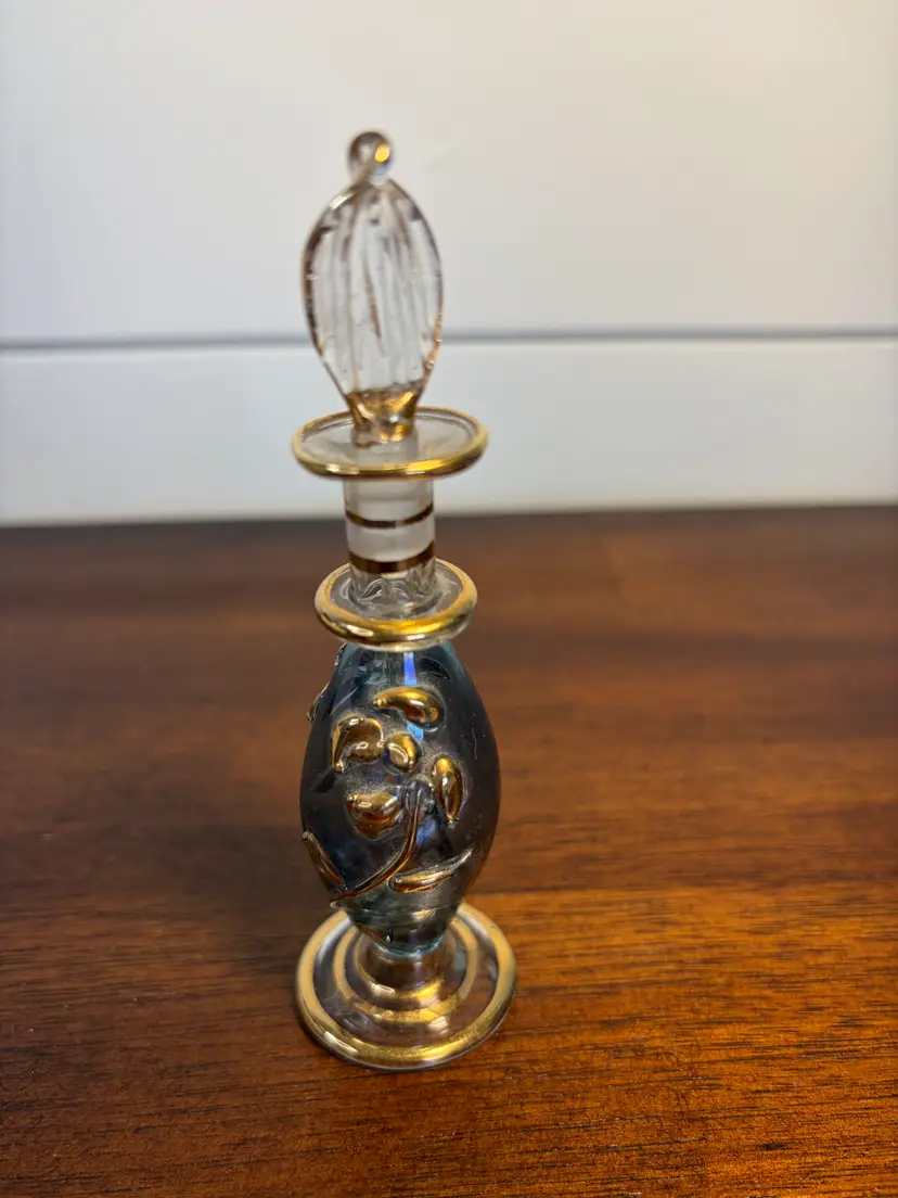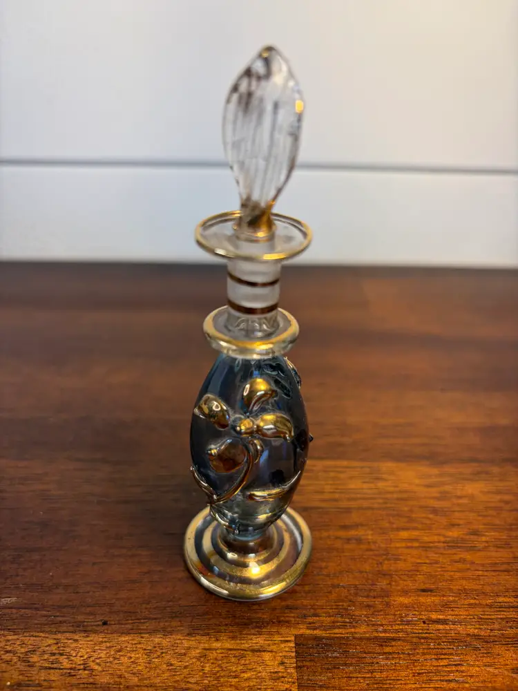 Elegant vintage glass perfume bottle with a detailed stopper. Perfect for adding a touch of classic charm to your vanity. 4.5 inches tall No chips or cracks.