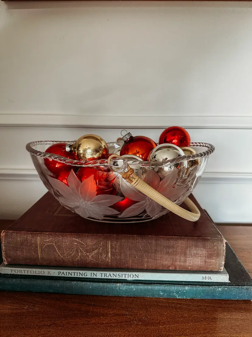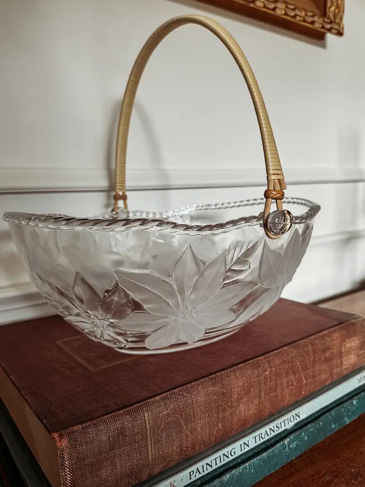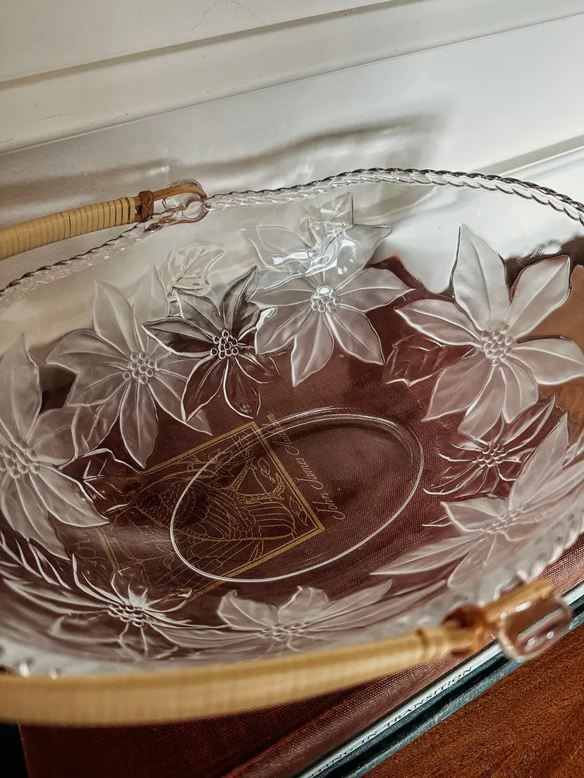 Large and heavy oval shaped glass bowl basket. 3D embossed poinsettia design and bamboo handle. Measures 12” x 9” x 4.5” and weighs over 3.5 lbs. Great condition with no chips or cracks. Ornaments not included