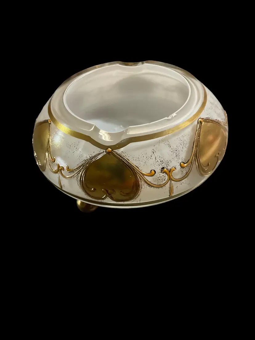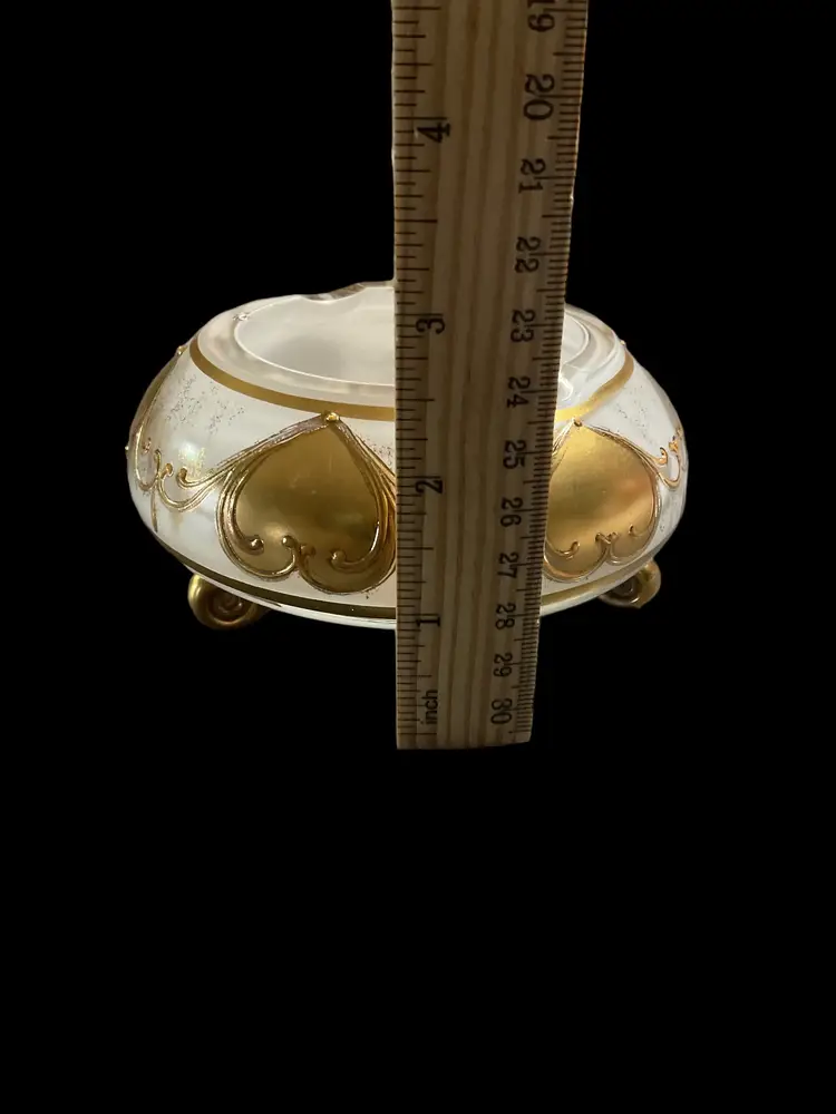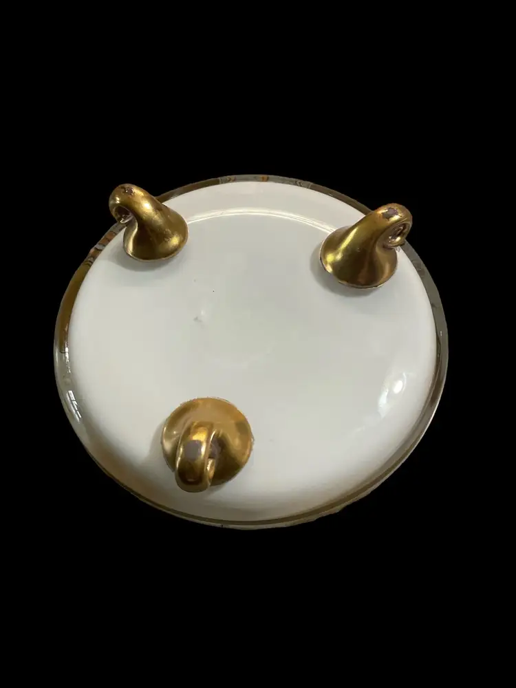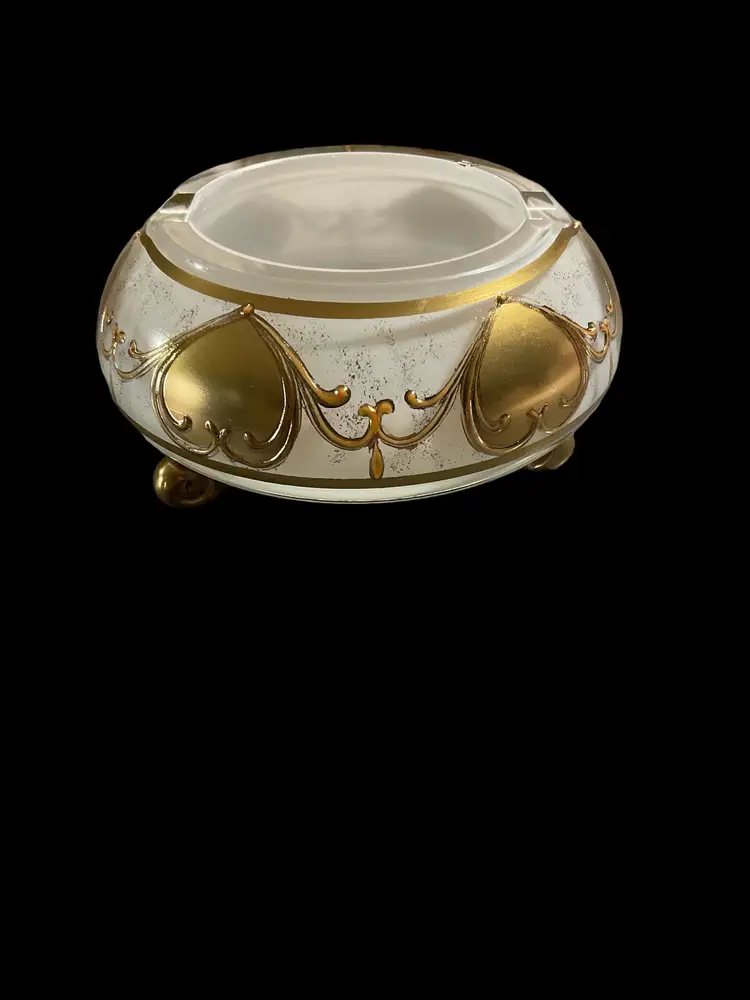 This vintage ashtray exudes elegance with its white and gold trim. The round footed design adds a touch of sophistication to any room. Its country/region of manufacture is unknown, adding to its mystery and charm. Perfect for any collector of ashtrays or tobacciana items, this piece will make a great addition to your collection.