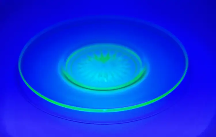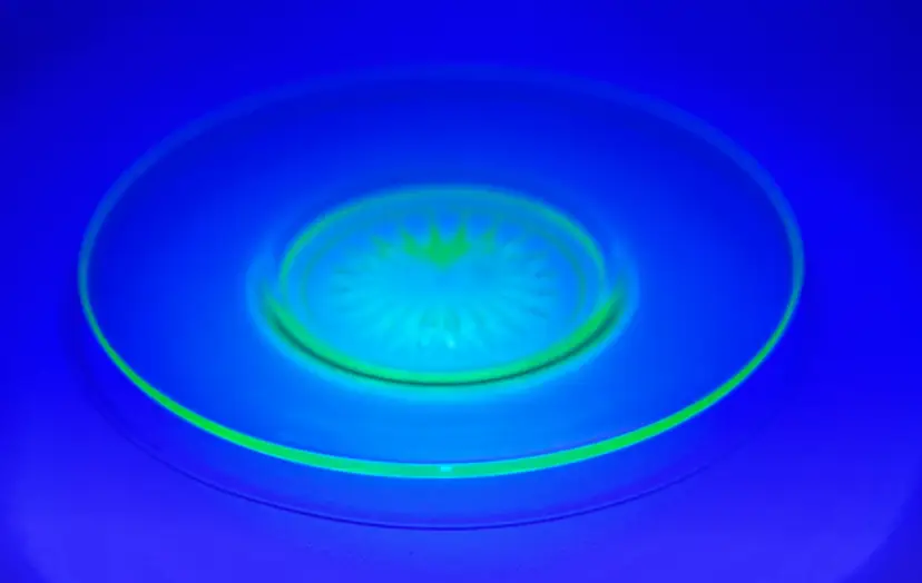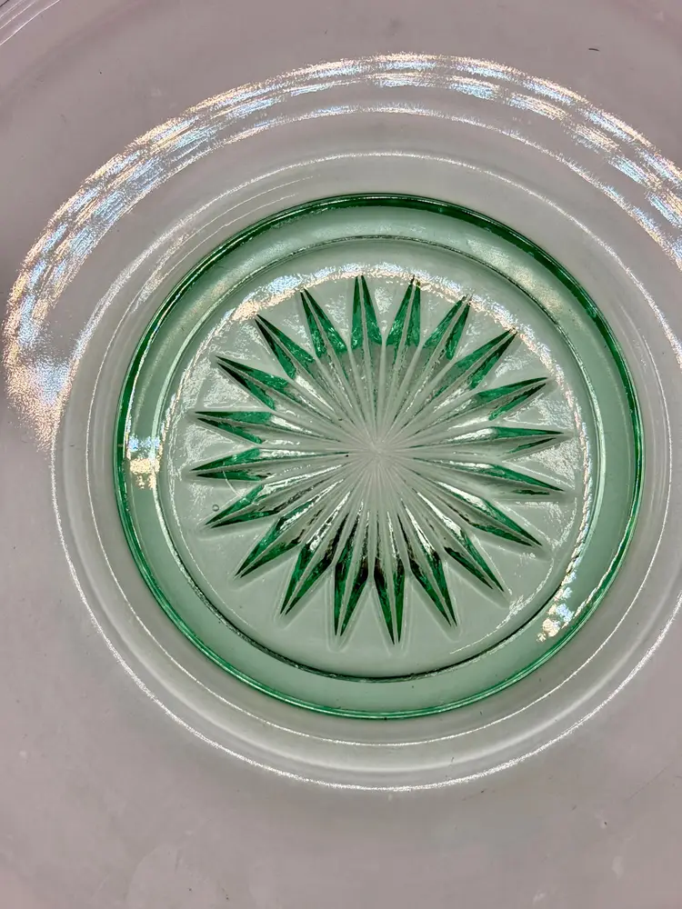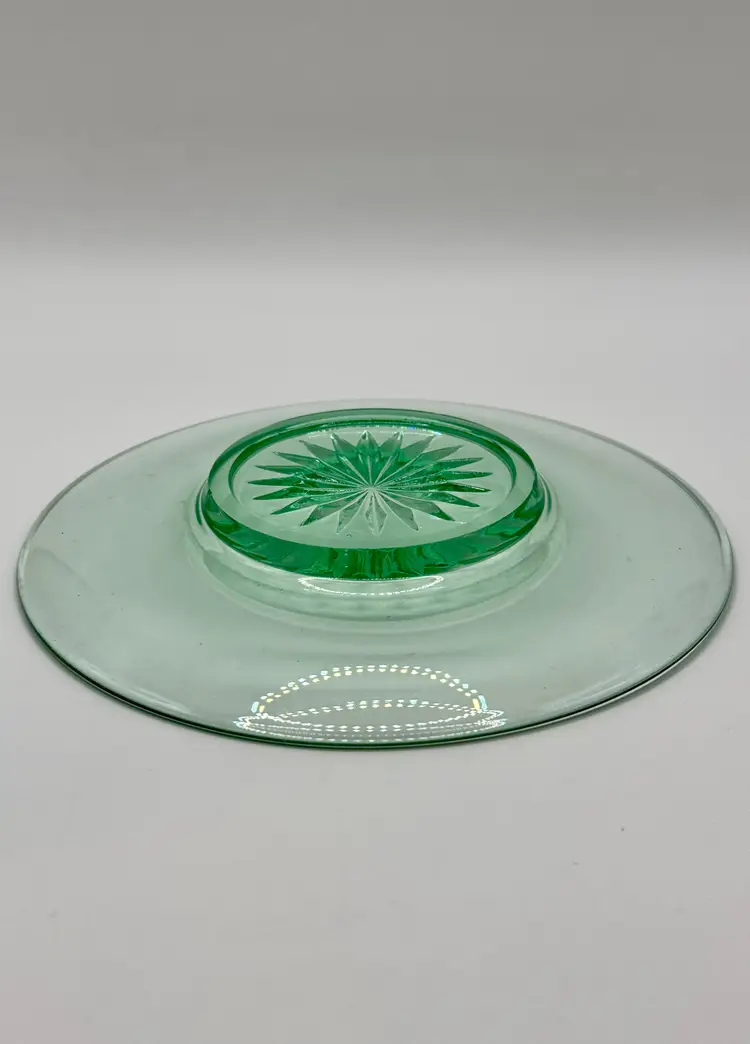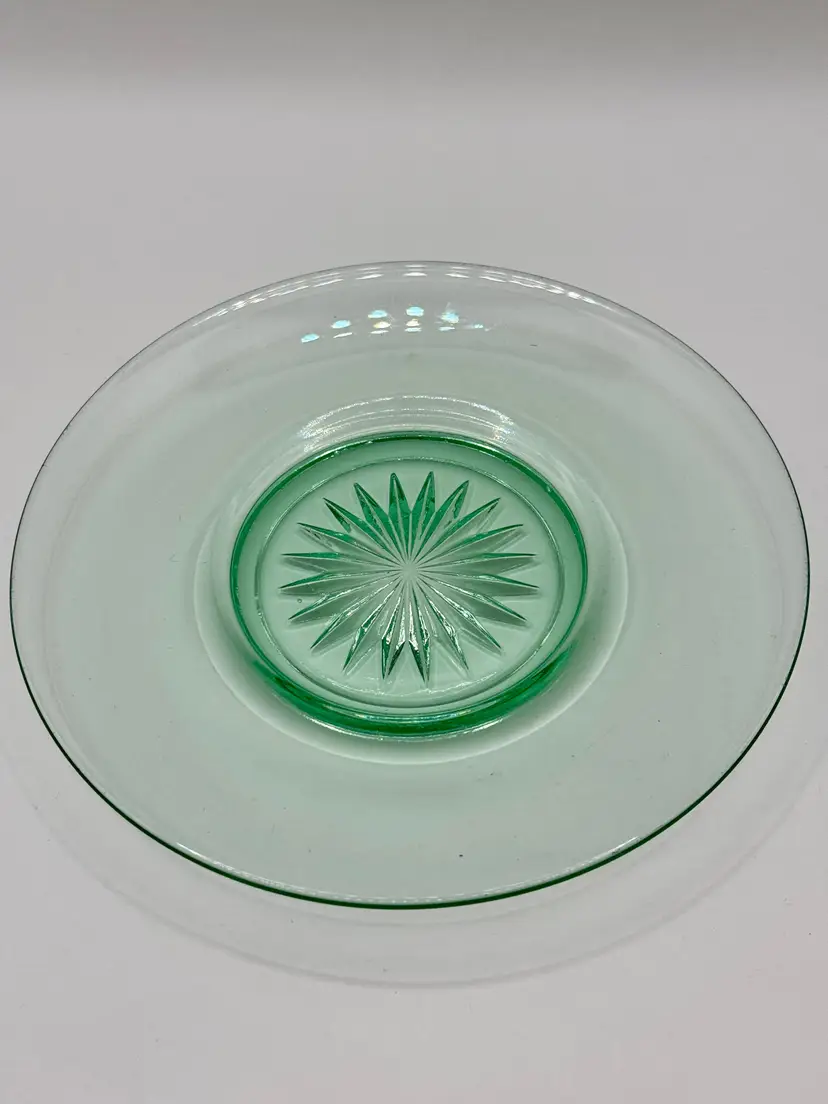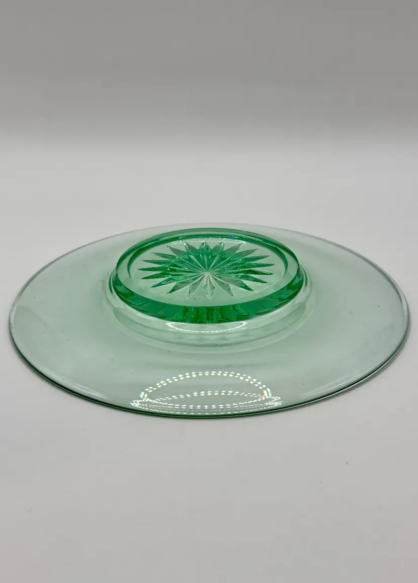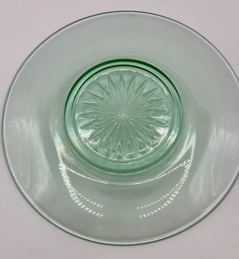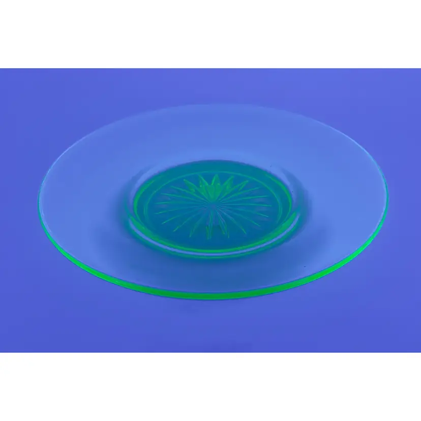 Vintage glass small saucer size round plate, sunburst pattern, ultra violet UV glows, made in USA. Very beautiful, perfect for any occasion or room. No chips or cracks. Measures 6”. Weighs 8oz.