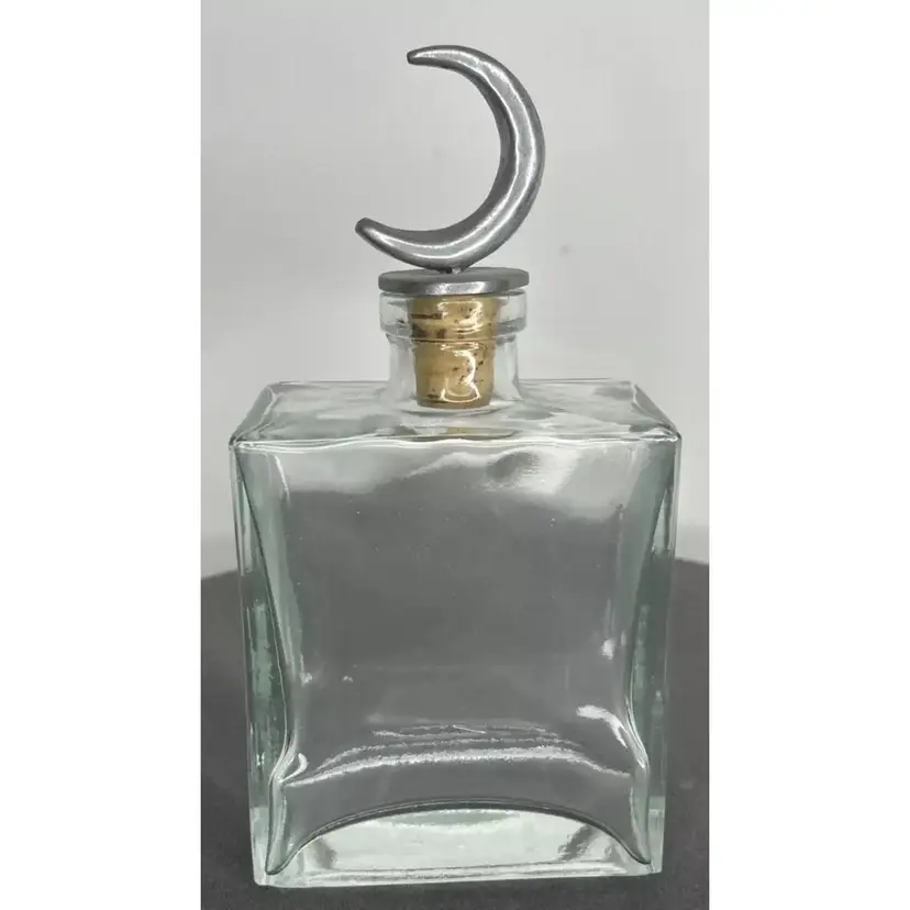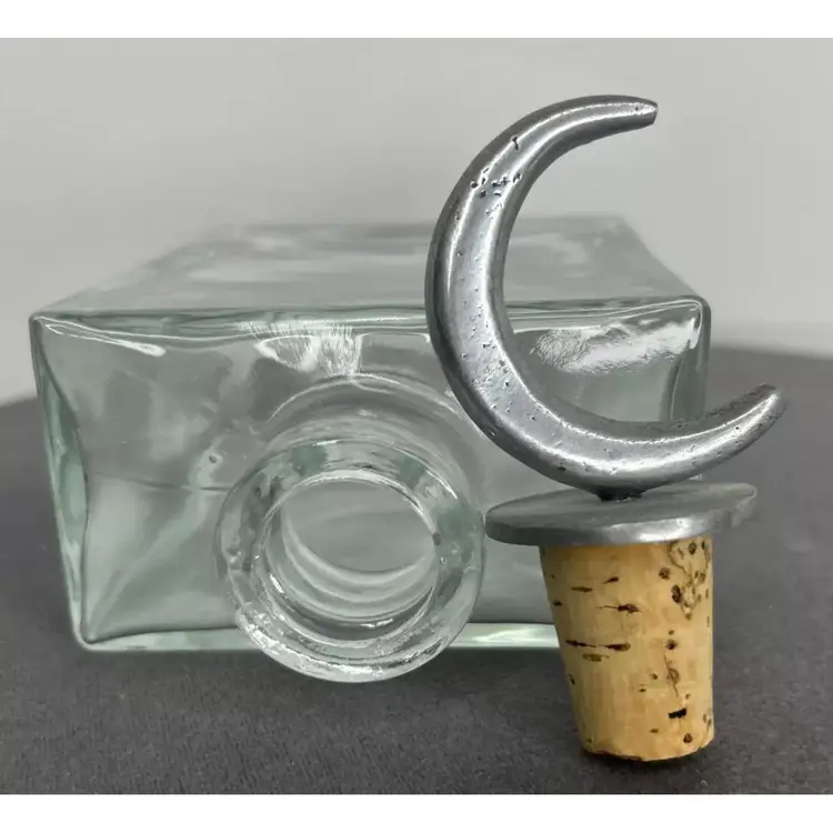 Vintage Glass Square Decanter with a half-moon silver cork stopper, standing at 8.5 inches tall and 2.5 inches wide. This Mid-Century Modernism piece from the 1970s features a unique Galaxy theme, making it perfect for all occasions. Crafted from clear thick glass, this decanter can hold your favorite liquor or just as a display piece on your bar area. This is a unique piece that exudes a stylish and elegant vibe that will add character and charm to your space.