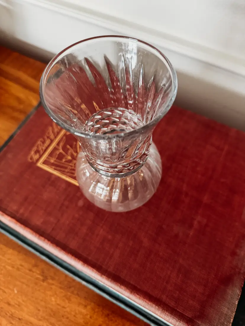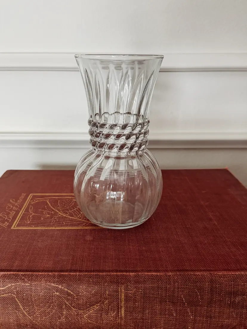 This is a vintage clear glass swirl optic bud vase. It features a ribbed, bulbous base and a fluted neck. A braided or twisted band detail separates the top and bottom sections. The approximate height is 6.5 inches. Almost looks like crystal, but it's definitely glass