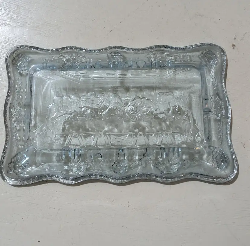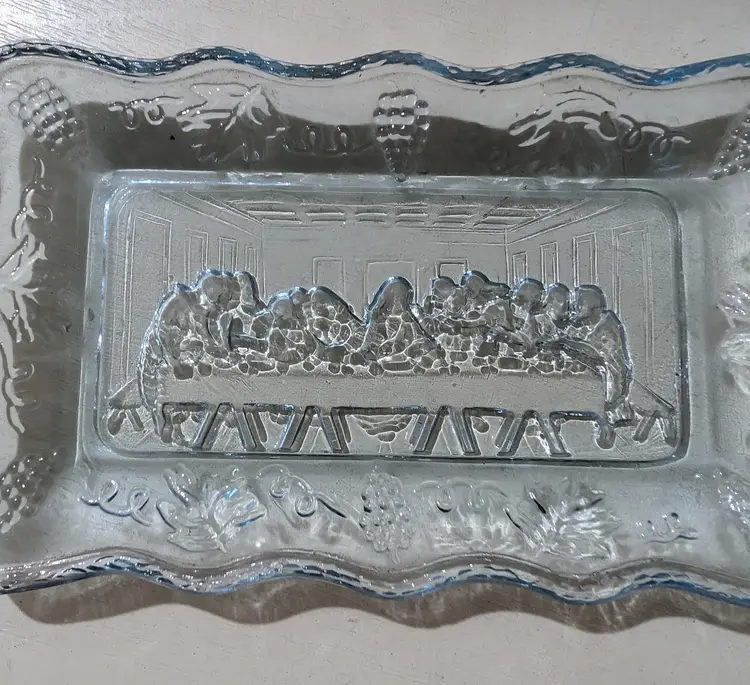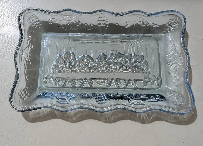 Beautiful vintage glass tray featuring an intricate depiction of the Last Supper. This piece is used but in excellent condition with no cracks or chips. The tray has a scalloped edge and grapevine details, adding to its charm. Perfect for display or serving small items. The tray measures approximately 5.5 inches in length and 3.5 inches in width. A unique addition to any collection.