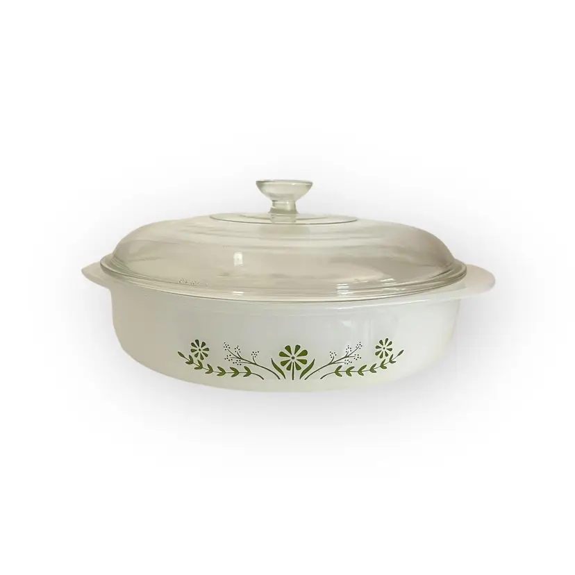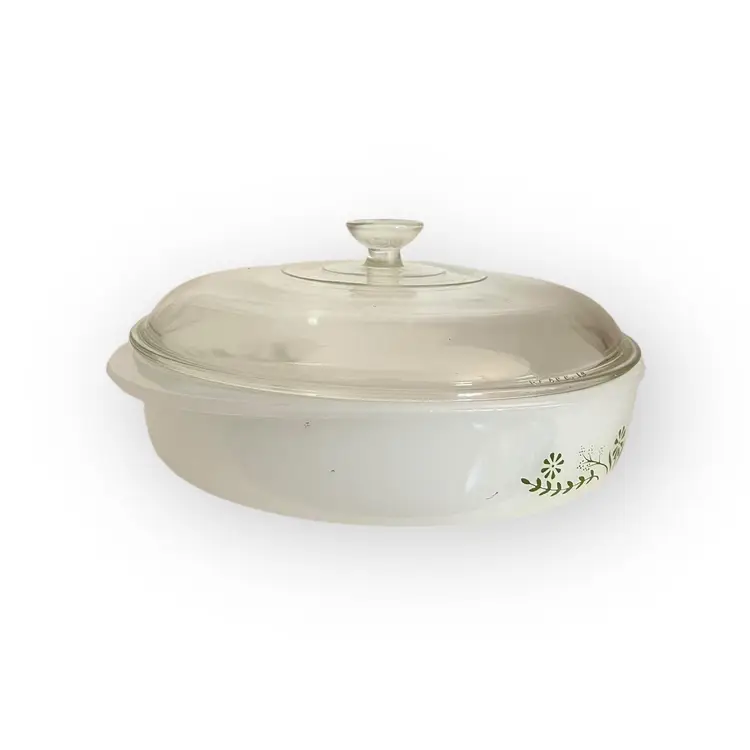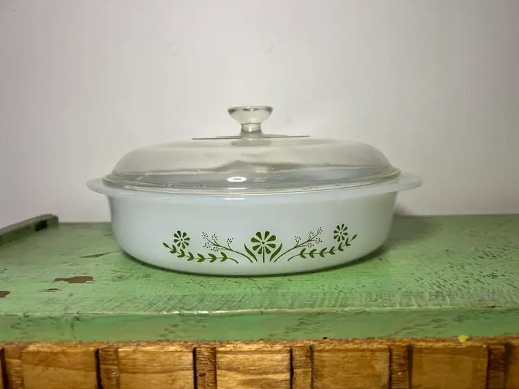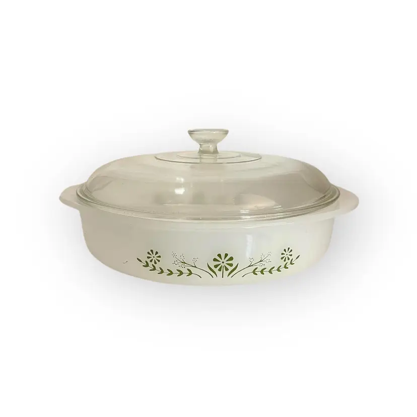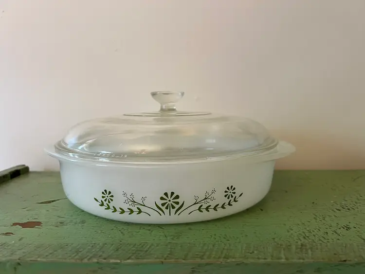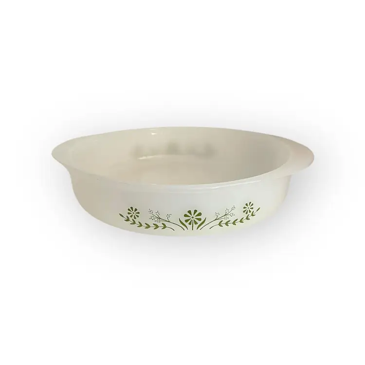 Vintage Glassbake Milk Glass Casserole Dish - Green Daisy (1960s) - 8.25" Dish is marked J2429 The lid is Pyrex 644CC-19. This is obviously a married lid. It is not original but it matches to the dish and fits well.