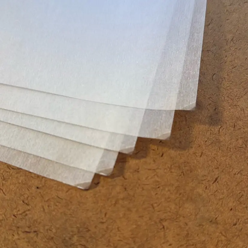 Each order will receive five 9”x11 3/4” size New Old Stock white pages of this lovely authentic vintage glassine paper with 2-hole post punched. Note the color on a bright white surface in photo. Single thickness on top and 5 stacked on the bottom of the photo. Note one corner has a tiny dog-ear. All details in photos.