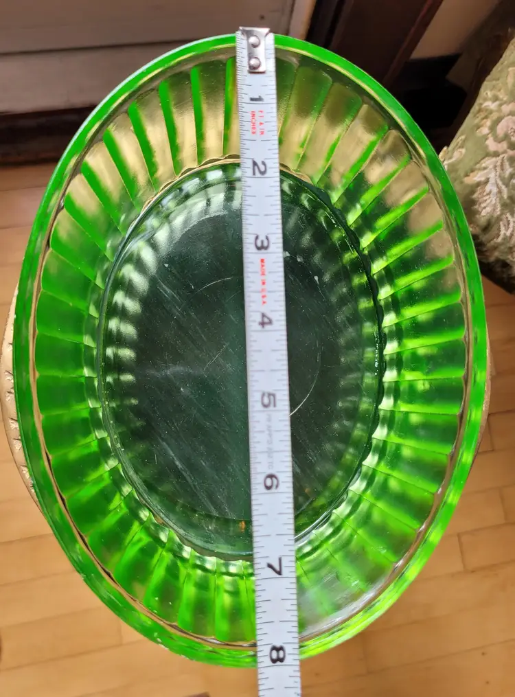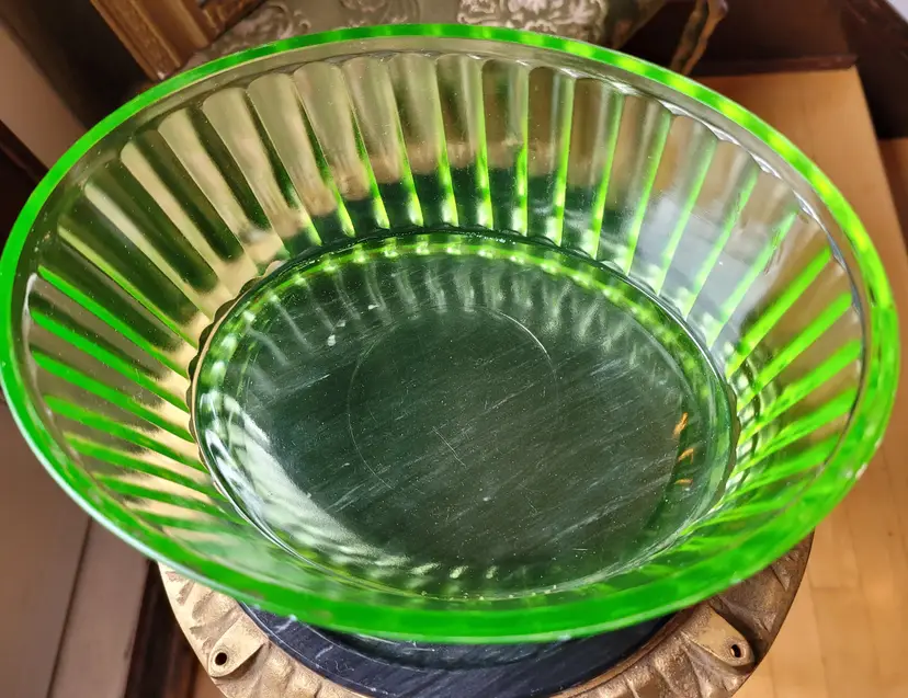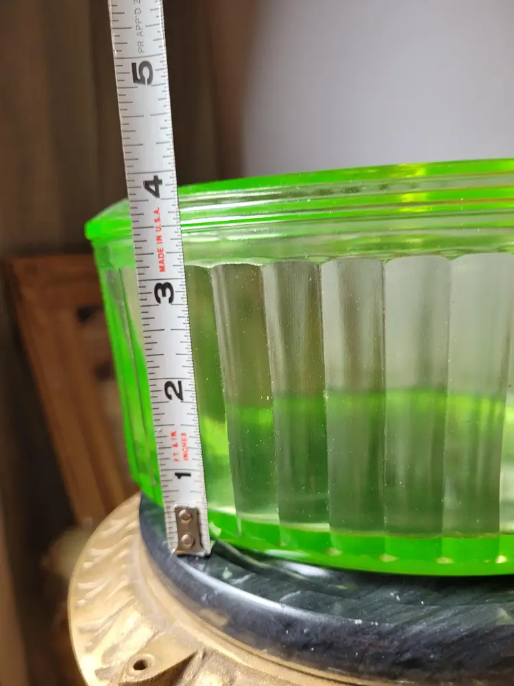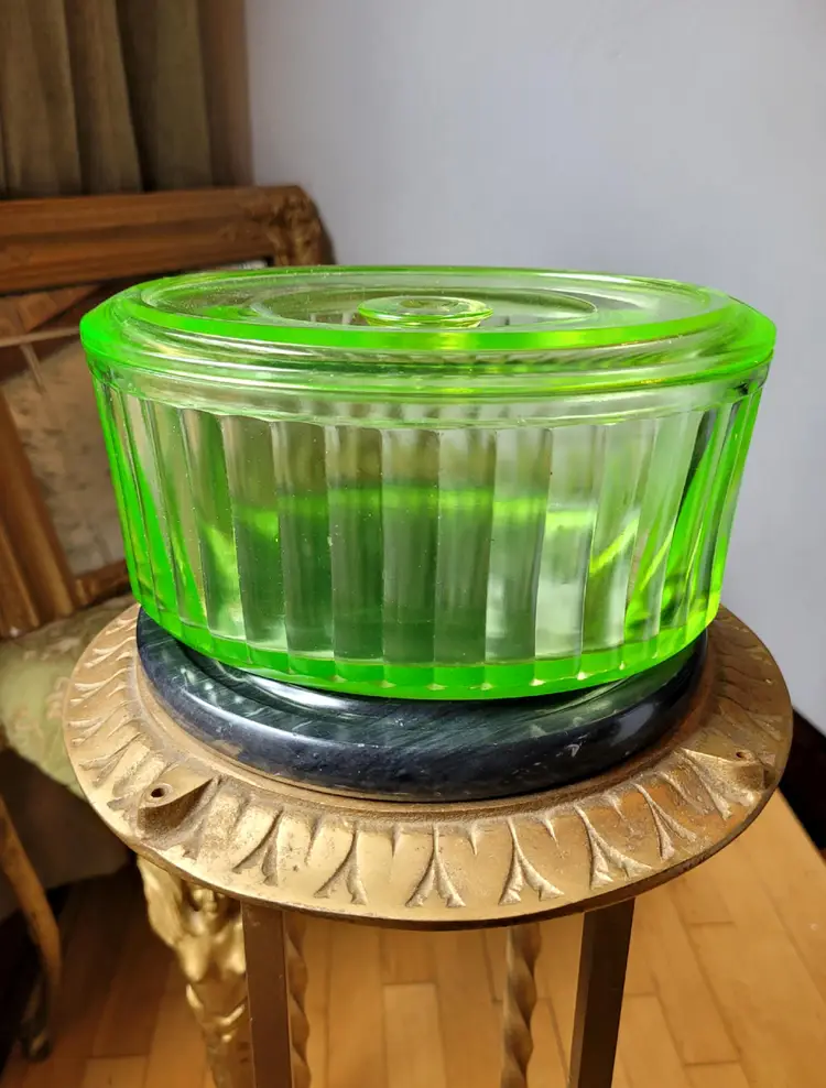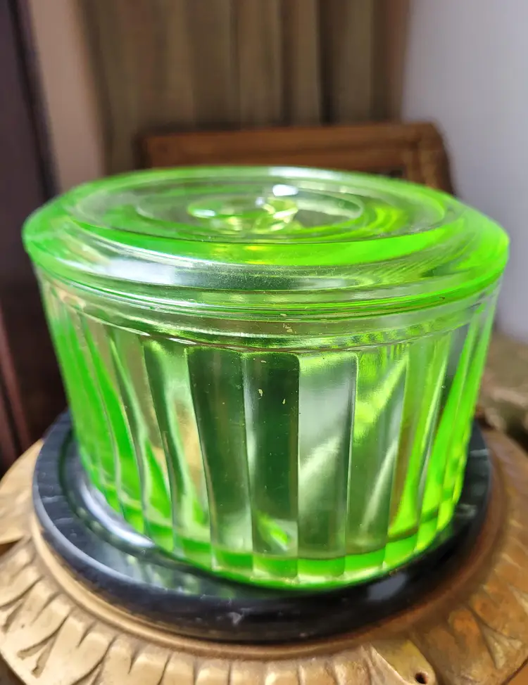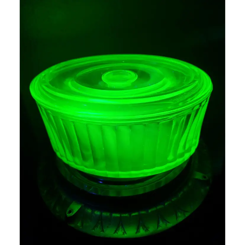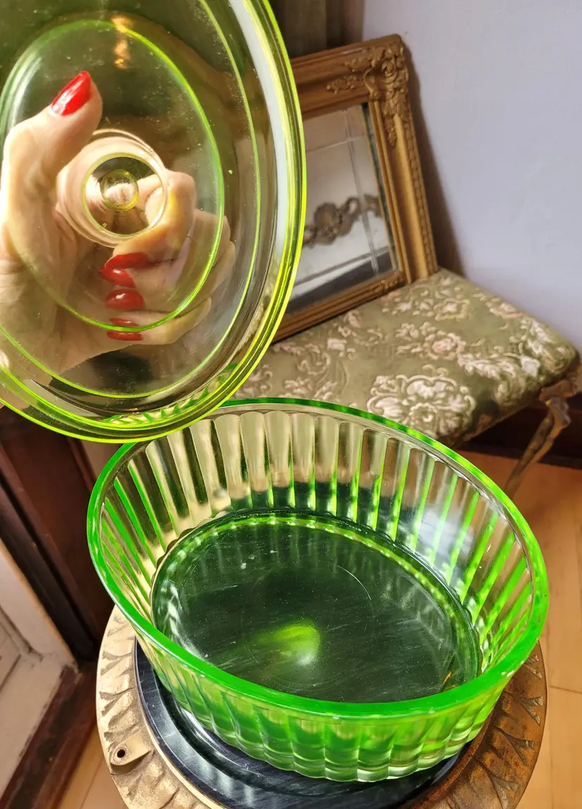 Stunning uran!um glass lidded refrigerator dish that glows even in just the light of day! This is circa 1930s and in impressive condition, I could not find any flaws. Please see pictures for details and measurements.