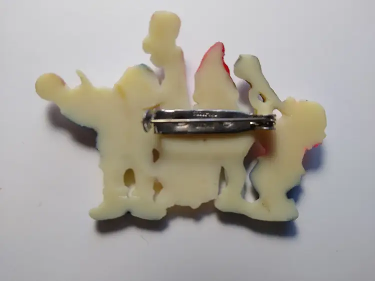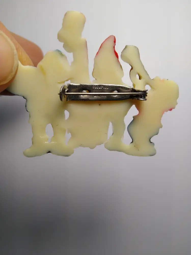 Charming vintage pin featuring three gnome or elf-like figures playing musical instruments: a trumpet, a cello/bass, and a violin. Crafted from molded plastic with painted details in cream, red, blue, pink, orange, and gold tones. The pin back is securely attached and marked 'JAPAN', indicating its origin. This delightful figural brooch would make a wonderful addition to any collection of vintage pins, decorative collectibles, or novelty jewelry. Perfect for adding a whimsical touch to clothing, bags, or display.