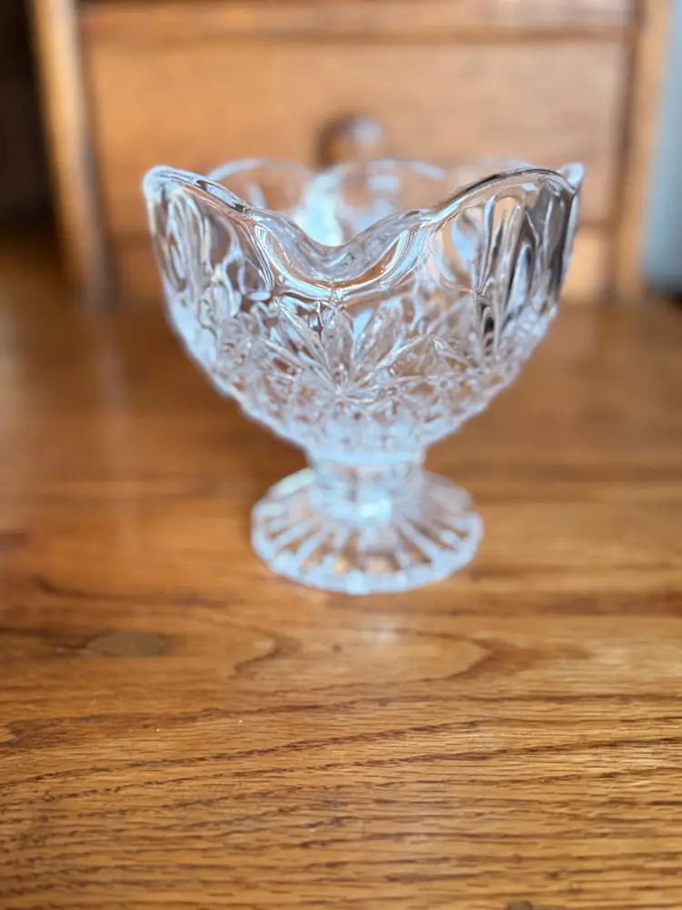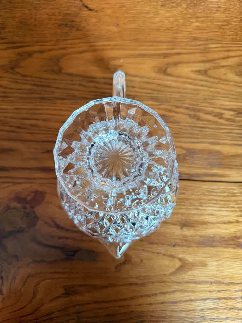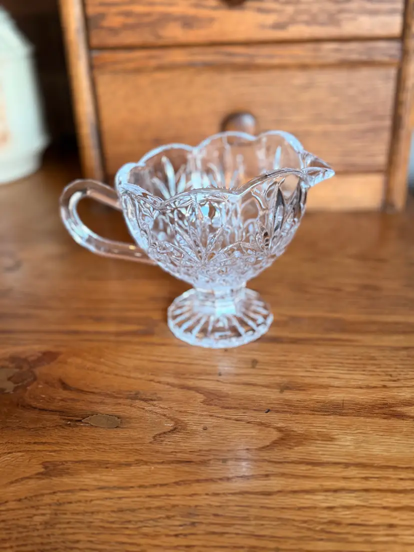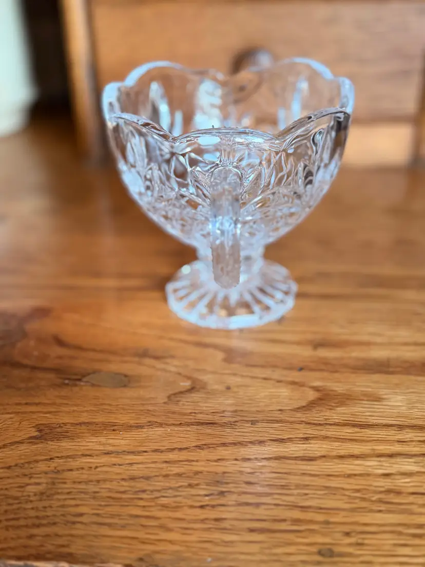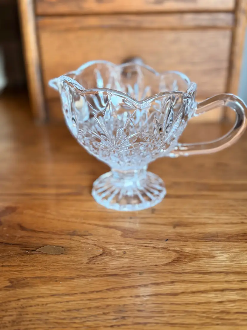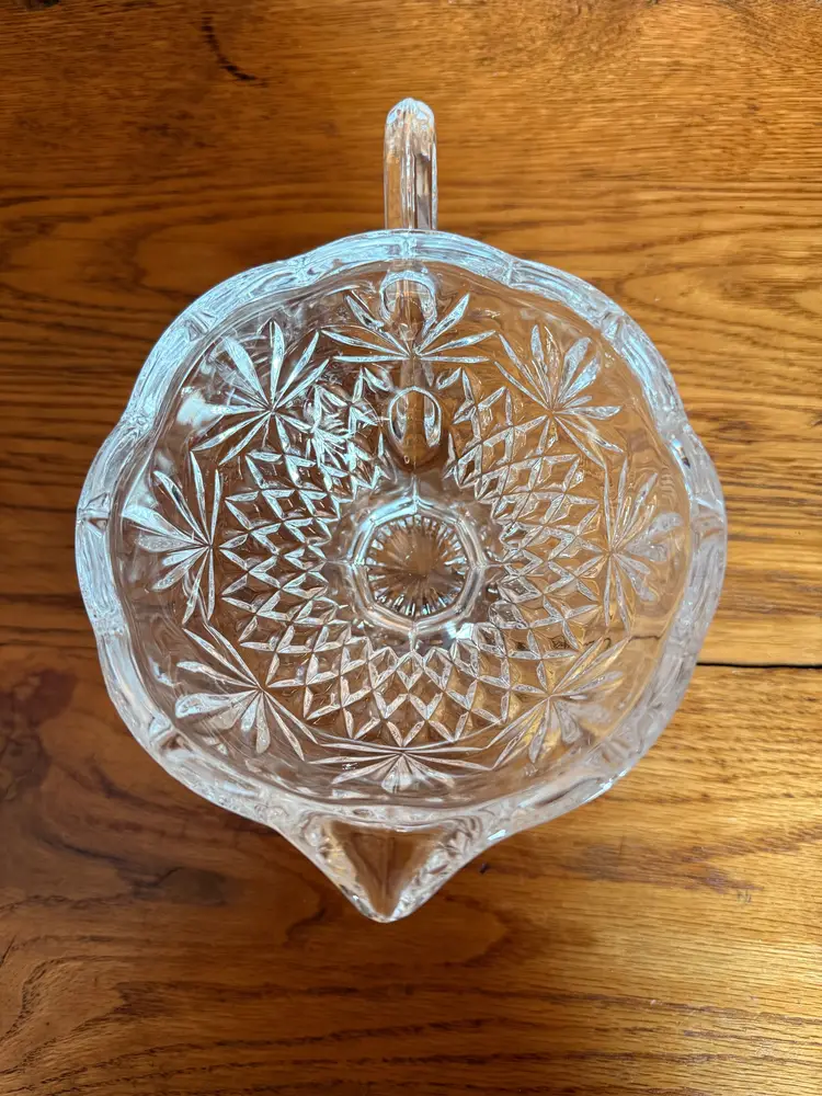 Elegant vintage Godinger Shannon Crystal gravy boat in the beautiful Pineapple pattern. This footed sauce server features a scalloped rim, graceful handle, and brilliant pineapple leaf and diamond-cut design that catches the light beautifully. Crafted from heavy 24% lead crystal, this piece is both functional and decorative — lovely for serving gravy, cream sauces, syrups, or displaying in a vintage crystal collection.