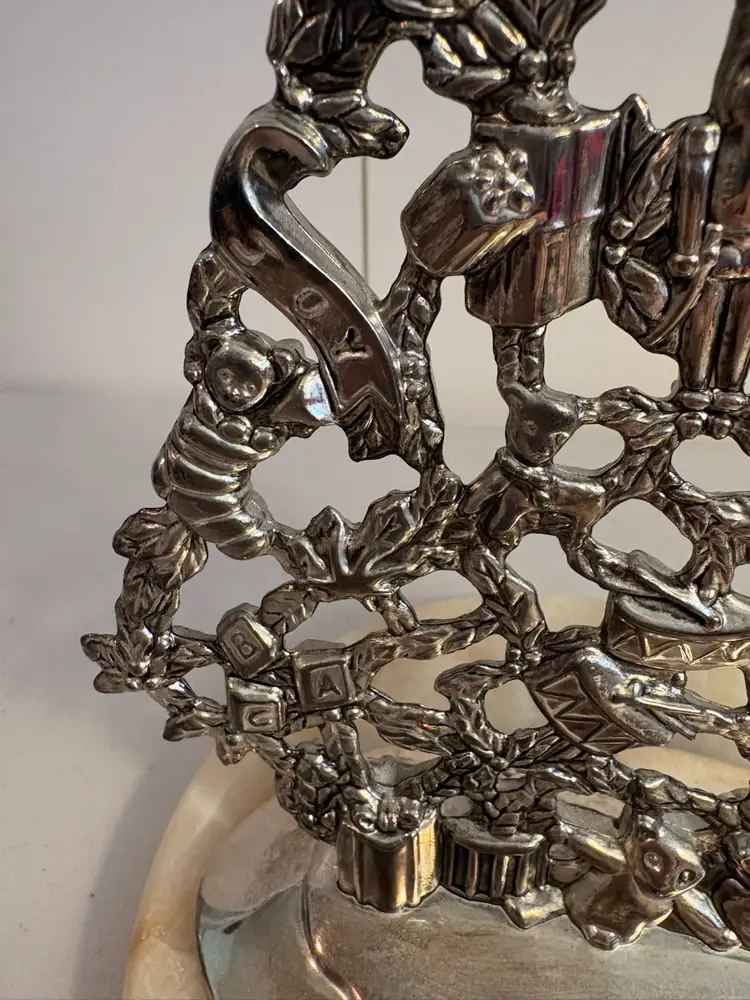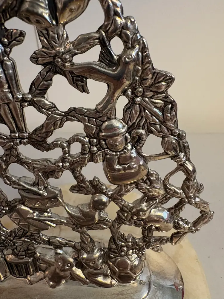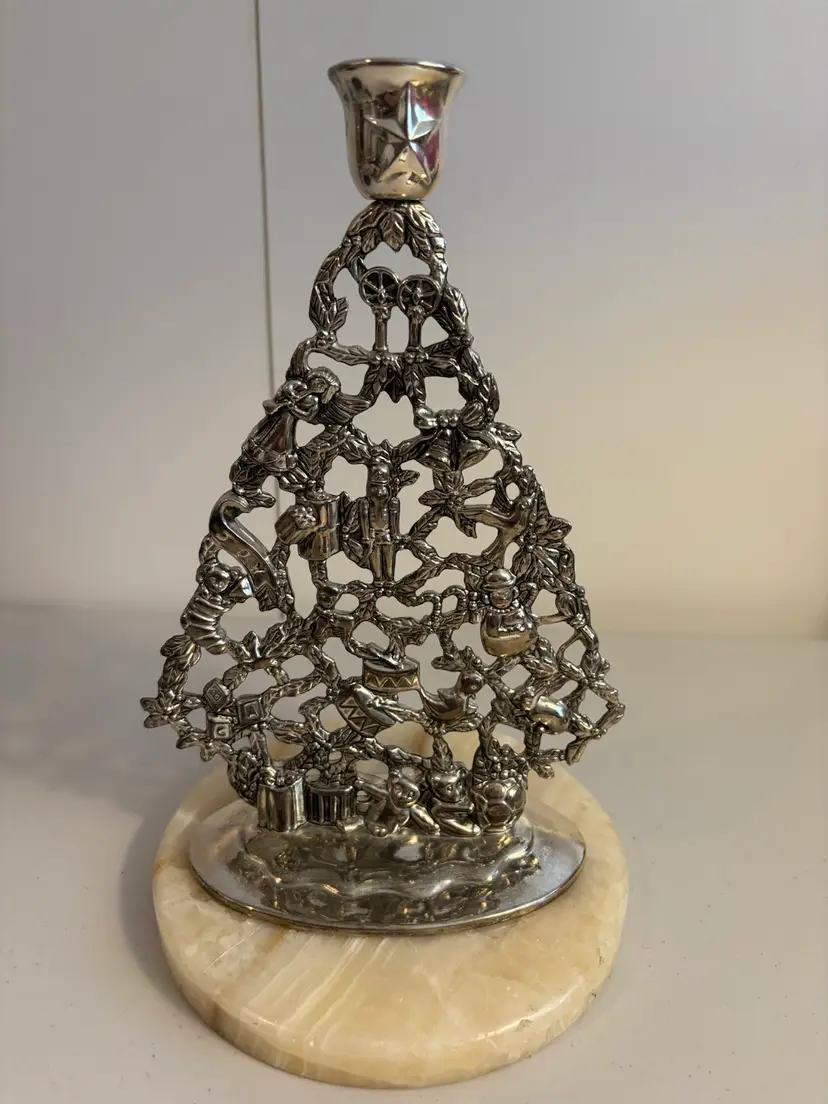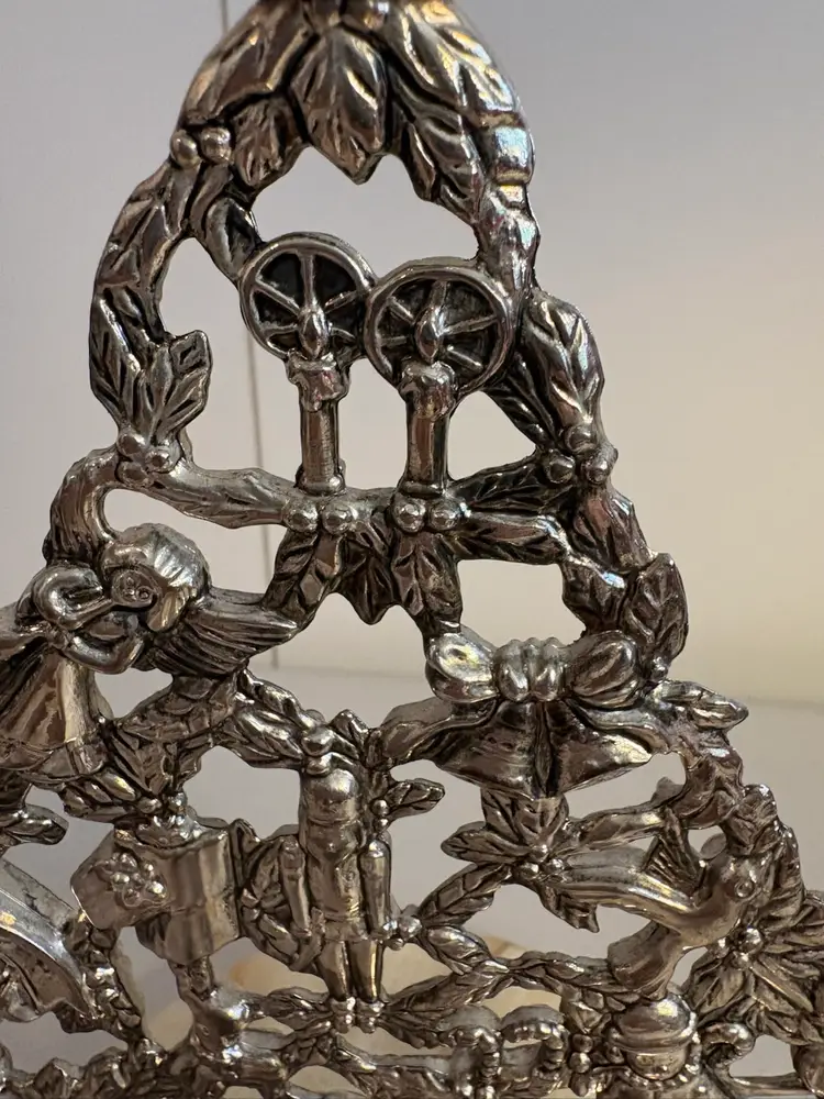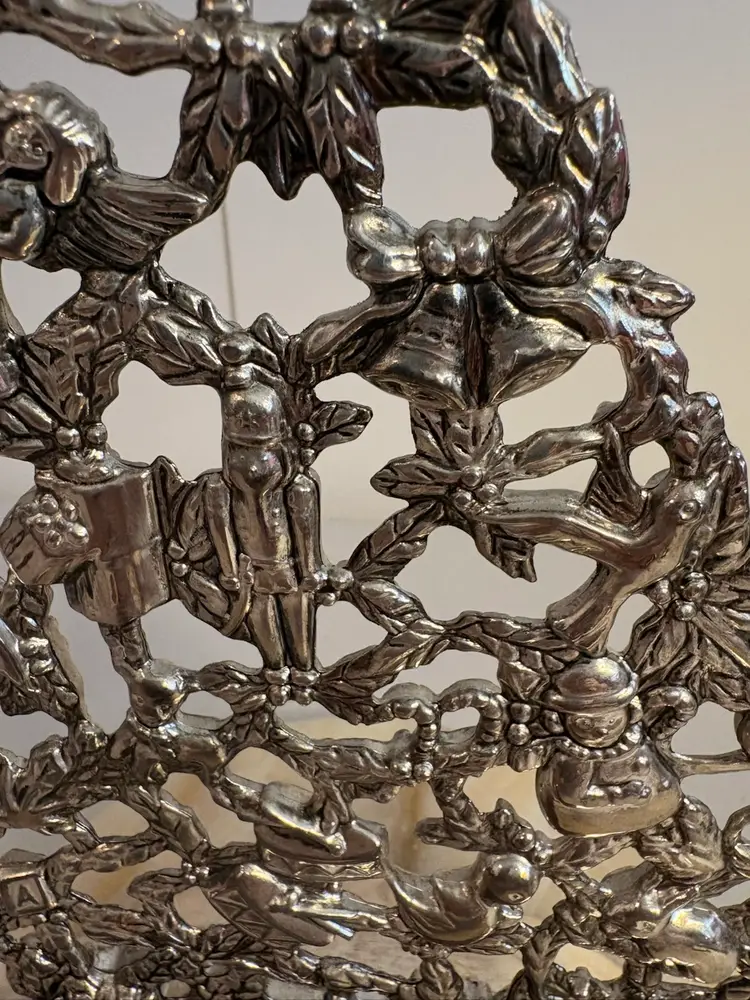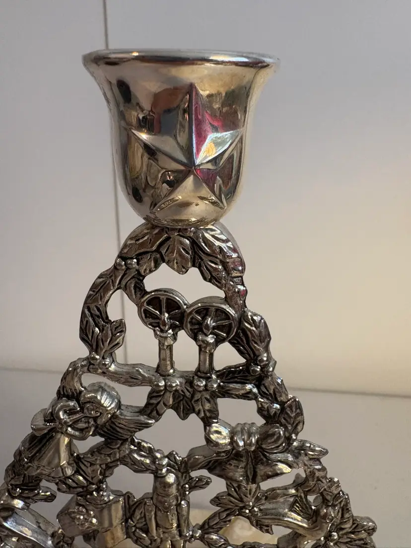 A very nice silver plated Christmas candle holder decorated with different holiday items like toys, nutcracker, drums, ornaments, angels, gifts, etc.