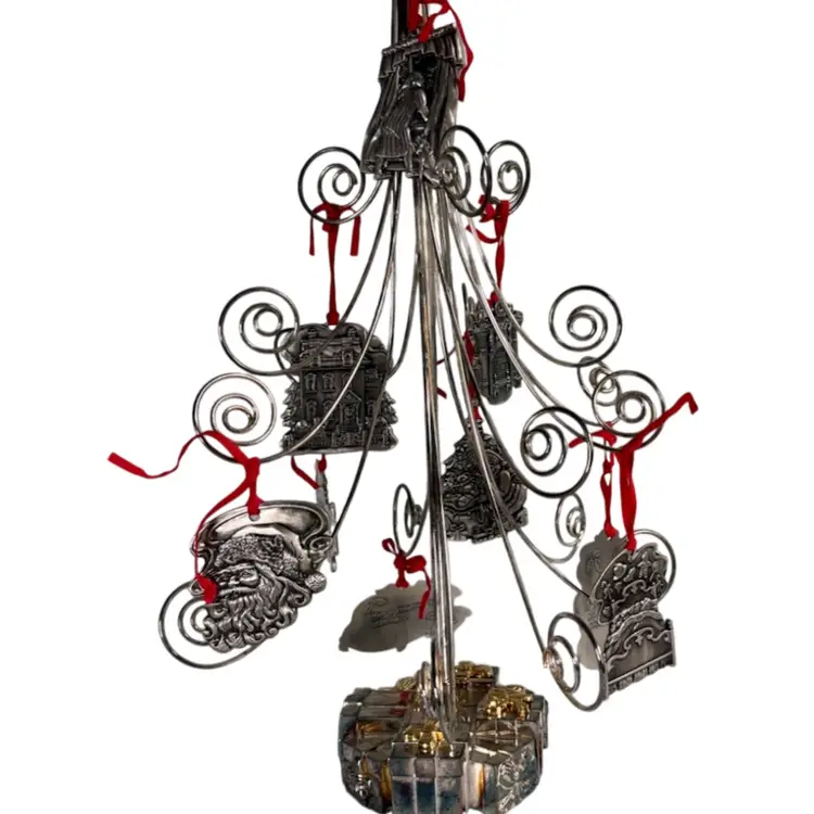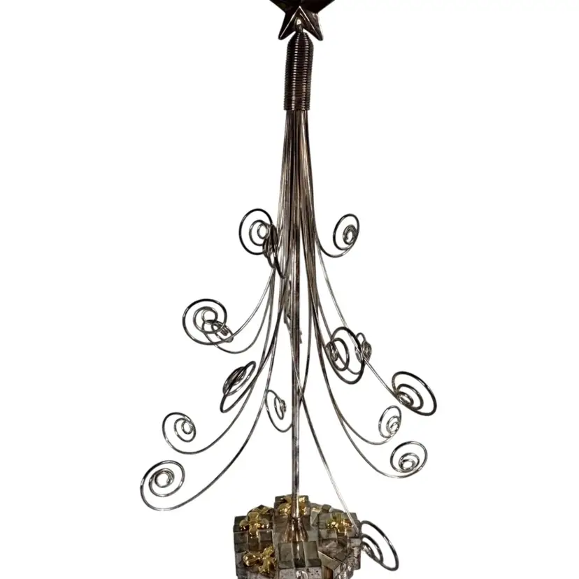 Silver-plated holiday card display tree with curled wire branches for hanging cards or ornaments. Comes with original retail box. Last picture shows ornaments attached, so cute. Normal wear n tear for its age. Would be stunning if preferred to have it polished.