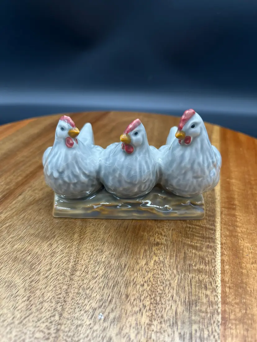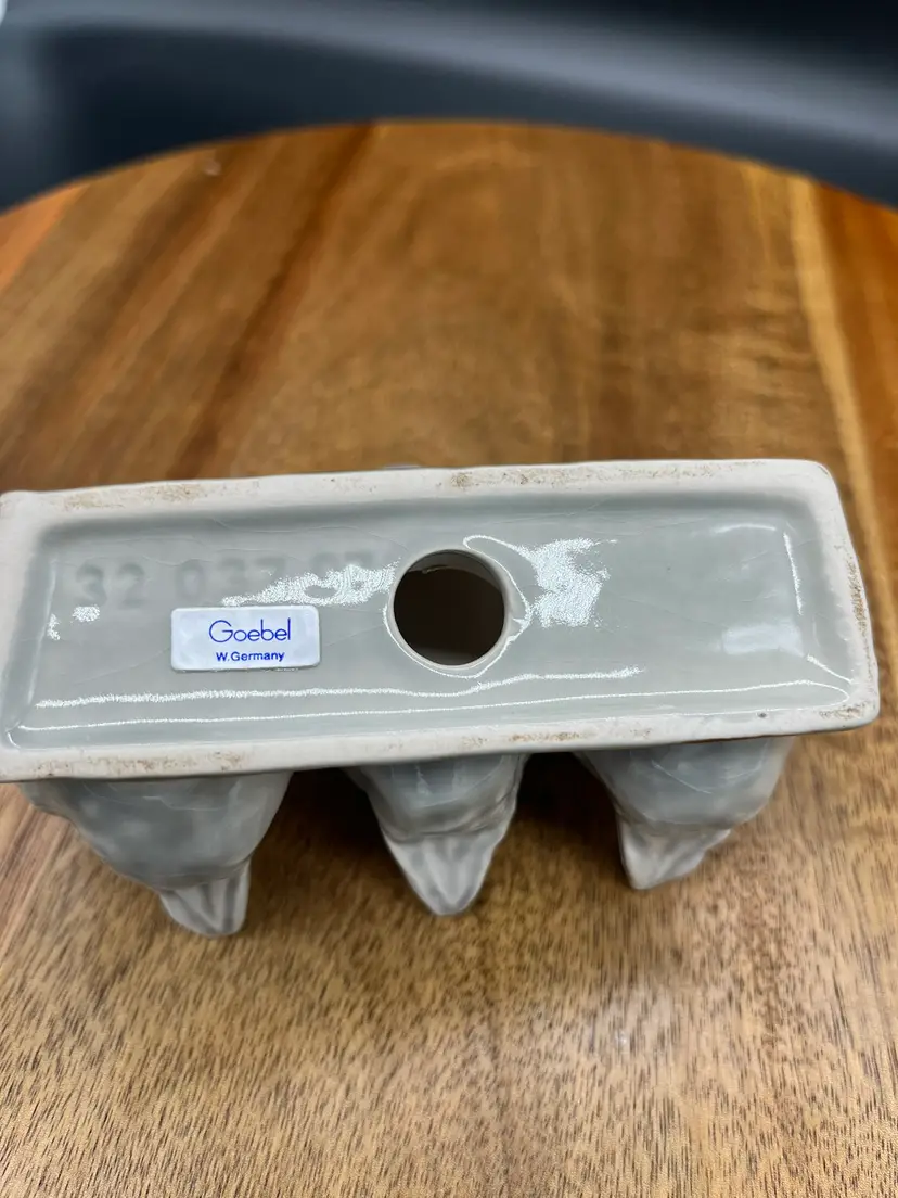 Vintage Goebel Figurine - 3 Chickens on Log, TMK 6 Goebel W. Germany sticker, stamped 32 037 07 Light gray blue primary color, glossy glaze Made in Bavaria, Germany Made between 1979 and 1981 Excellent condition, no chips or cracks noted; mild crazing on chicken chests 4" long, 3" tall, 2.5" deep