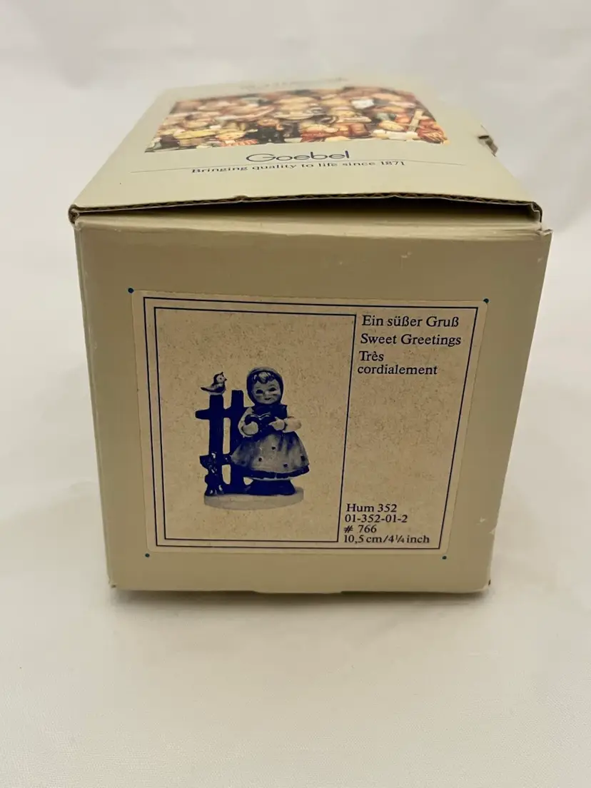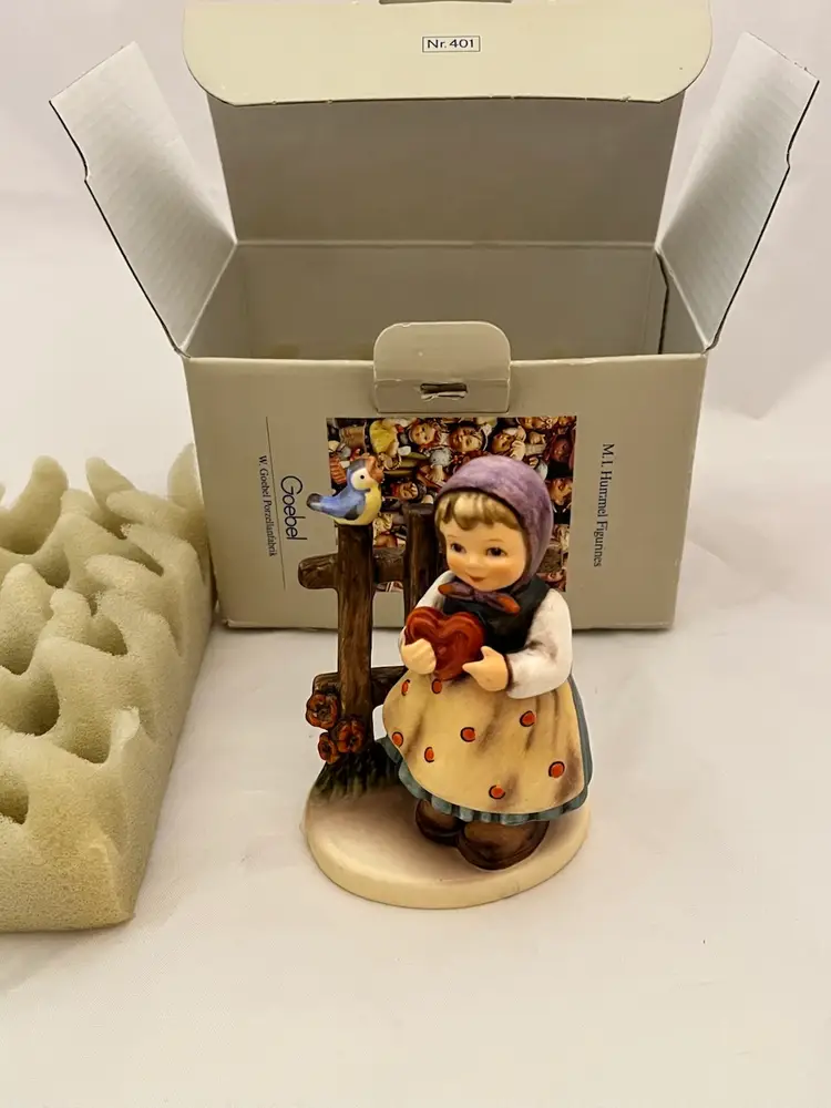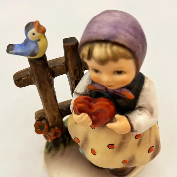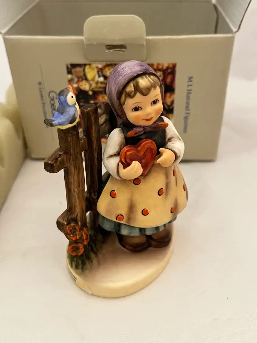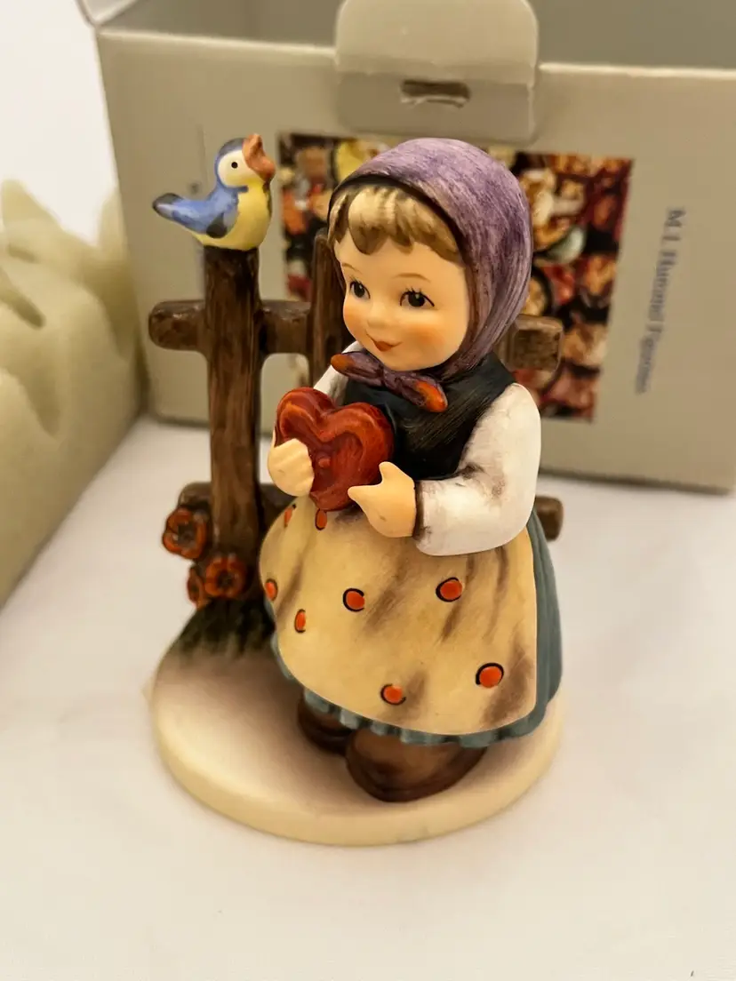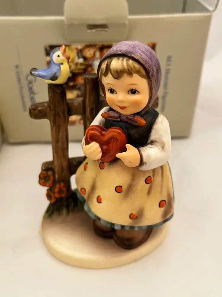 Vintage Goebel Hummel figurine from 1964 features a charming girl holding a heart-shaped balloon, titled "Sweet Greetings". Comes in its original box.